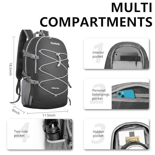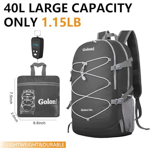 40L Ultra Lightweight Hiking Backpack Water Resistant Dark Grey Packable Bag