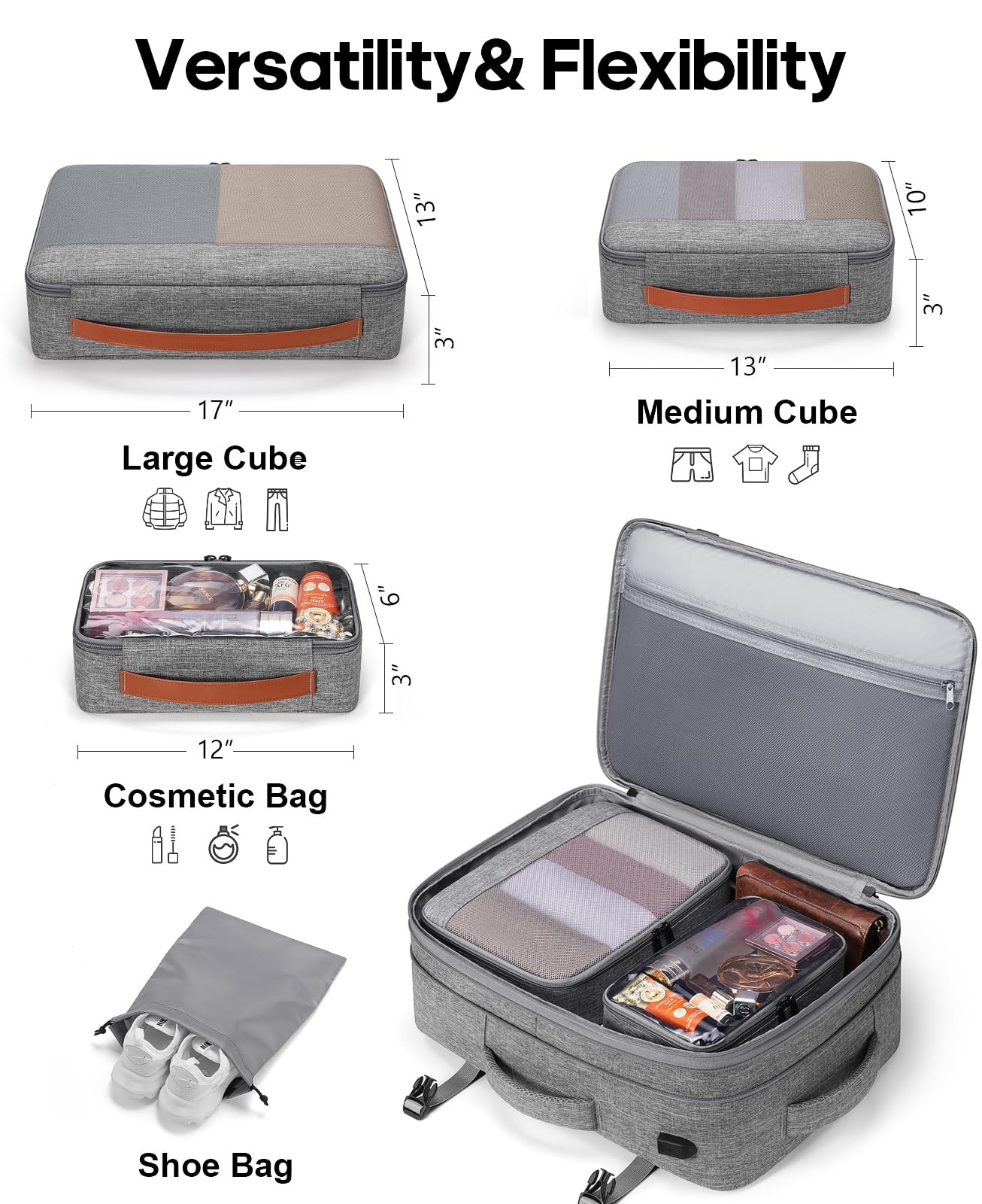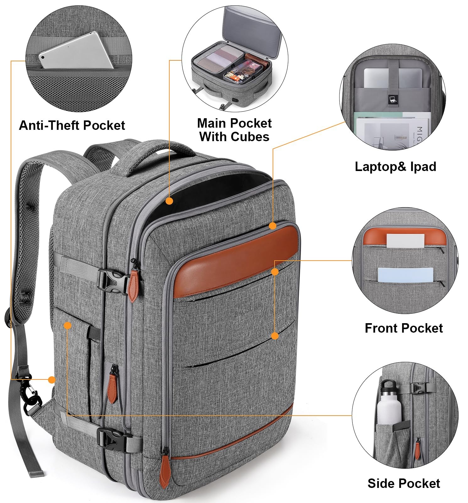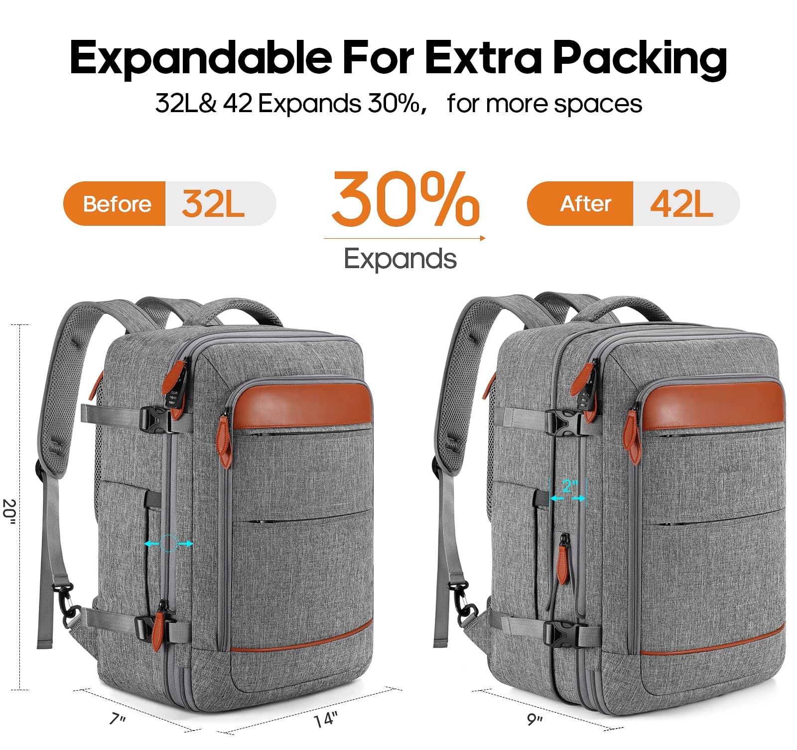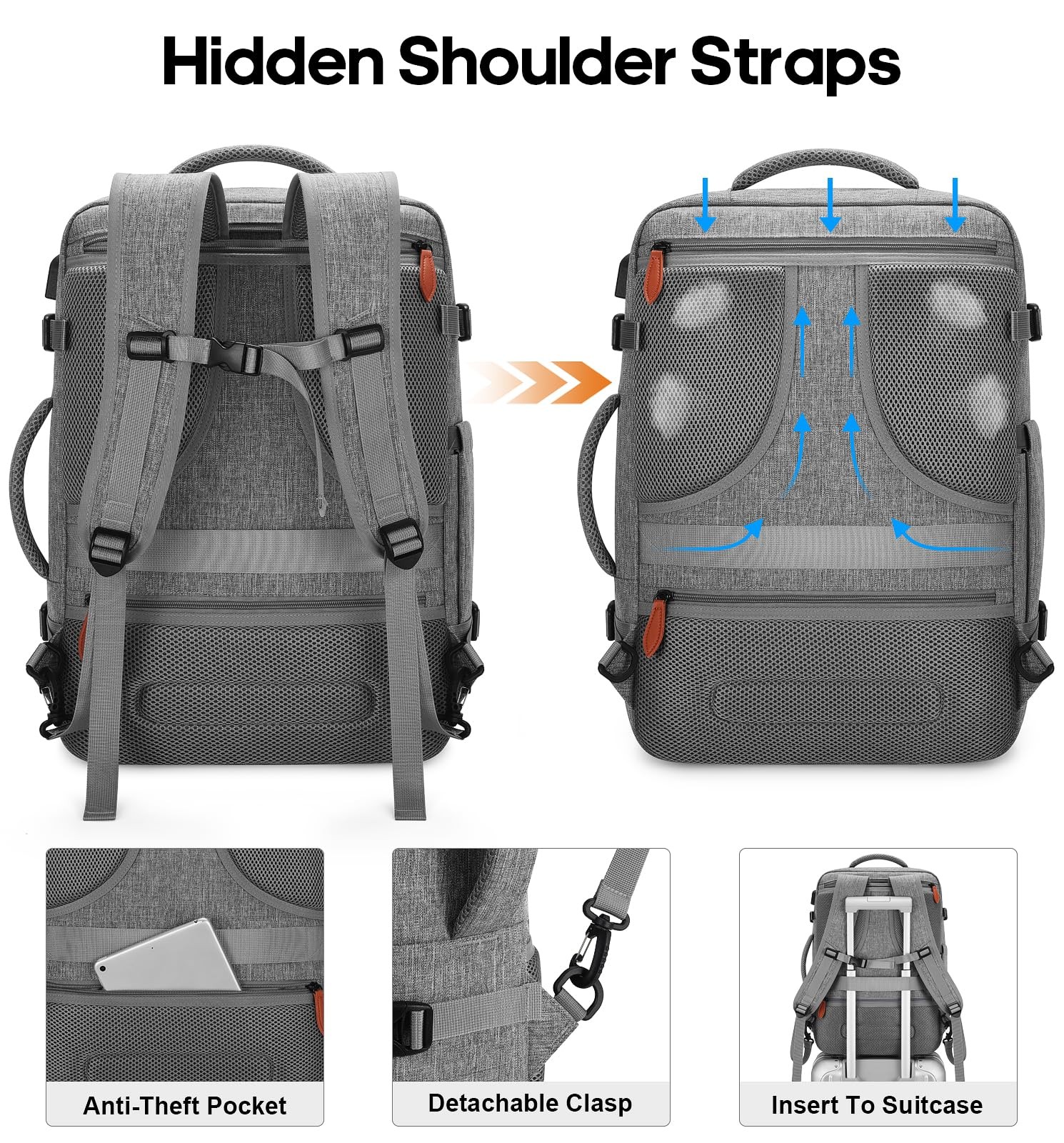 The Breathable sponge mesh design on the laptop backpack for men and padded shoulder straps help with air convection, ventilation, and heat elimination, also it help relieve the stress from your shoulder. This luggage backpack is crafted with hideaway padded shoulder straps which can be hidden away in the zippered back panel when not using. ✈【LARGE CAPACITY AND EXPANDABLE】This suitcase backpack for travel features zipper expansion, which can expand up to 42L for 3~7 days of travel essentials. The spacious main compartment with straps to secure travel supplies, one separate laptop compartment for a 17-inch laptop, and a hidden anti-theft pocket on the back protect your valuable items. It's perfect for travel, business, camping, or cruises with a 20*14*7" size. Please check the size before purchasing. ✈【FLIGHT APPROVED CARRY ON BACKPACK】This laptop backpack for men is designed for travel, you can travel anywhere you want, and two padded handles for easy switching between backpack and suitcase. There is a luggage strap on the back, which can be placed on the luggage. It fits overhead and under the seat, while in a state of standard carry-on size, and is ideal for men, women, weekend travelers, or occasional vacationers. ✈【MORE DURABLE MATERIAL AND ANTI-THEFT LOCK】The suitcase backpack for travel is made of durable, water-resistant polyester and anti-scratch material. The sturdy metal double zipper and upgraded reinforced stitching make it last longer. Also, this luggage backpack has an anti-theft lock , so there will be no more worries about losing items during travel, camping, or cruises. ✈【HIDDEN SHOULDER STRAPS & BREATHABLE SPONGE】 The Breathable sponge mesh design on the laptop backpack for men and padded shoulder straps help with air convection, ventilation, and heat elimination, also it help relieve the stress from your shoulder. This luggage backpack is crafted with hideaway padded shoulder straps which can be hidden away in the zippered back panel when not using. ✈【3 PACKING CUBES + 1 SHOE POCKET】Large cube for sweaters, jackets, and pants. Medium cube for shirts, and shorts. Small cube with a transparent side for providing a clear overview of toiletries. There's also a shoe pocket. Keeping your belongings neater and more organized. The laptop backpack has a built-in USB port to charge your phone conveniently via connecting your own power bank (not including a USB charger).