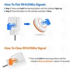 Product Advantages √ RF433Mhz Radio frequency control. Easy to use No wiring required, suitable for EU and French standards, simple setup steps. √ 16A High Power Meet the power of various household appliances, safer to use. √ Stable Signal, Long Control Distance Powerful chip, Signal can go through walls,The effective distance can reach 50 meters. √ Supports Flexible Pairing No interference to use several in the same room, One socket can be stably paired with up to 30 wireless switches. √ Wireless small round remote controller ●Comes with double-sided tape, can be pasted anywhere. ●Using 2pcs CR2016 batteries (included), they can be used normally for more than 7000 times. Comprehensive after-sales and service √ This product has passed CE and RoHS and FCC certification. √ 1 year warranty or replacement commitment. √ Our after-sales service team can provide the most professional solution to any of your problems. Features ▼ RF433Mhz Radio frequency control. Easy to use ▼ No wiring required, suitable for EU and French standards, simple setup steps. ▼ Supports Flexible Pairing ▼ No interference to use several in the same room, One socket can be stably paired with up to 30 wireless switches ▼16A High Power▼ Meet the power of various household appliances, safer to use. After power off, power on again, the device state is off by default. ▼ Stable Signal, Long Control Distance ▼ Powerful chip, Signal can go through walls,The effective distance can reach 50 meters. ▼ Wireless small round remote controller ▼ ●Comes with double-sided tape, can be pasted anywhere. ●Using 2pcs CR2016 batteries (included), they can be used normally for more than 7000 times. Operating mode ▶ Description: ●Pressing the button on the remote to turn the device on, pressing the same button again turns the device off. ▶ Data matching: 1. Press and hold the learning button until the indicator light lights up, then release your hand. 2. Press the button on the remote control once, success. ▶ Clear date: Press and hold the learning button until the indicator light flashes several times and then release your hand. success. Parameter ▶RF433mhz Wireless Control Socket Working voltage : AC 85V~245V Max current : 16A Max load : 3300W RF frequency : 433MHz Working temperature : -30~+80 Receiving Sensitivity : >97dbm Amount of storage remote controls : about 30 pieces Support encoding : 1527 Leaning code RF Operating mode : ASK superheterodyne wireless reception Receiving range : Open space is more than 150 meters Size :50*50*80mm ▶Wireless small round remote controller Support encoding : 1527 Leaning code RF frequency : 433MHz Size : 50*50*13 mm. Battery : CR2016*2 ( Included) Double-sided tape : Included Feature : No wiring required.Small size, easy to carry. Q & A 1.Can i use my own 433mhz remote to control this socket? --We suggest that you should use our remote to work with socket.Because same frequency remotes also have many different codes. 2. The power down and come again,does socket in ON status? --No sir.After you set up with remotes,the socket will only ON when you pressed remote button. 3.Does this socket have wifi functio? --Sorry sir.It is rf 433mhz only ▶ Please contact with us if you have any questions.Thank you. ▶ We have own factory,if you want to do ODM OEM bussiness,please contact with us.