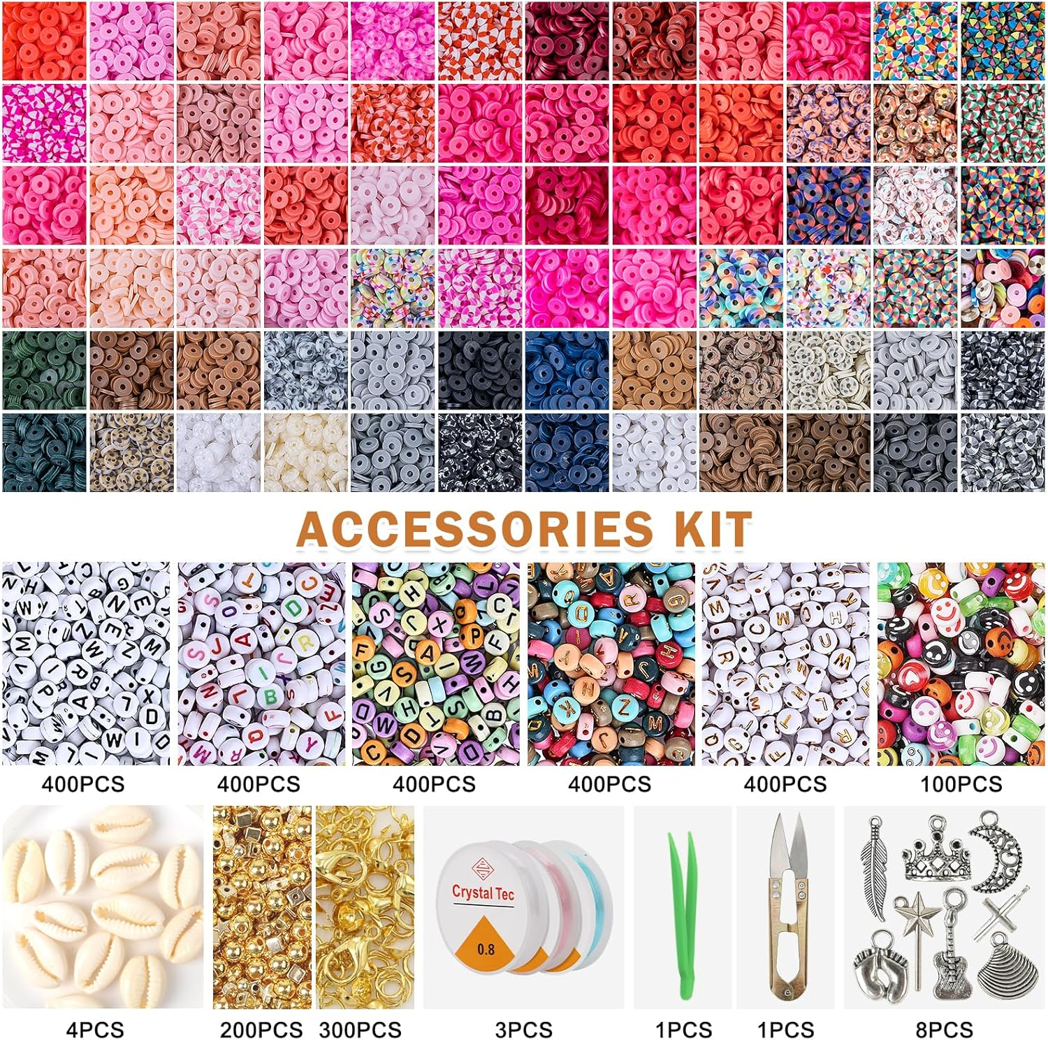 Menu Other Items Feedbacks About Us Contact Us Add To Favorites 46000Pcs Clay Beads Bracelet Making Kit - 216Colors 10Boxes Polymer Clay Beads, 5 Styles Letter Beads,With Rich Jewelry Making Accessories and 3 Rolls Crystal Cord, for Crafts Christmas Gifts 【Clay Beads Kit】:10 boxes of clay beads in 216 colors, 180 pieces per color. It also includes letter beads in 5 styles gold and color,240 pieces per style,100 smile and love beads,about 200 gold star beads and gold square beads,4 shell pendants,8 sterling silver pendants,3 roll of colorful crystal cord, 1 pair of scissors and 1 pair of tweezers,30 gold jump rings and 6 gold lobster clasps. 【Premium Material】:These clay beads are made of high quality polymer clay. safe and environmentally friendly, skin-friendly, harmless and comfortable to wear. Bright colors, not easy to fade, not easy to break and uniform in size (Diameter 6mm, hole 2mm). XSEINO clay beads are newly upgraded, the pieces of clay beads will be screened by machine in the end to ensure that each piece has a uniform thickness. 【Enjoy Creative DIY Fun】:The rich flat clay beads and charms in the kit meet a lot of DIY crafting needs. It is easy to make bracelets, necklaces, earrings and other jewelry with the kit. Easy for you to get involved in it. Not only will you improve your hands-on skills, but you can also be proud of the jewelry you have made from the clay bead bracelet kit. 【Wide Applications】:The lovely clay beads for bracelets are very versatile. You can use them to make unique DIY crafts, such as bracelets, necklaces, earrings, cell phone pendants, key chains and more. Whether it is birthday, Christmas, Thanksgiving, or Valentine's Day, Mother's Day, friendship party, you can use them. 【Great After-Sale Service】:Our clay bead kit has sufficient after-sales protection. If you find that you don't like or are not satisfied after purchasing, you can return or exchange it at any time within 3 months. You are welcome to contact us at any time, and we at 24hours online will solve your problem perfectly. Age:Over 3 years old Product Description Package Include: Color Series Dynamic Clay Beads 10 boxes of clay beads in 216 colors, 200 pieces per color. 5 styles letter beads ,240 pieces per style.100 Smile beads and colorful love beads. 200 gold star beads and gold square beads.4 shell pendants.8 sterling silver pendants. 3 roll of colorful crystal cord.1 pair of scissors and 1 pair of tweezers. 30 gold jump rings and 6 gold lobster clasps. Item Specification Item model number clay-beads-10 Item dimensions L x W x H 4 x 3 x 2 inches Age Range (Description) Adult Color 10 Box Clay Beads Country of Origin China Style Modern Item Weight 4.8 pounds Theme Christmas Model Name XS Seasons All Seasons Art Craft Kit Type Jewelry Making Included Components 10 boxes of clay beads in 216 colors, 180 pieces per color. 5 styles letter beads ,240 pieces per style. 100 Smile beads and colorful love beads. 200 gold star beads and gold square beads. 4 shell pendants. 8 sterling silver pendants. 3 roll of colorful crystal cord. 1 pair of scissors and 1 pair of tweezers. 30 gold jump rings and 6 gold lobster clasps. Product Dimensions 4 x 3 x 2 inches SHIPPING FREE FREE SHIPPING We are always working hard to ensure your package arrives as soon as possible. Please understand that some factors like weather, high postal traffic, and the performance of shipping companies are outside of our control. We offer free shipping to the lower 48 states. We do not accept P.O. Boxes. Please provide a physical address. If you have a problem or question regarding your transaction please contact us immediately. We will work with you to resolve any problem you may have. Thank you