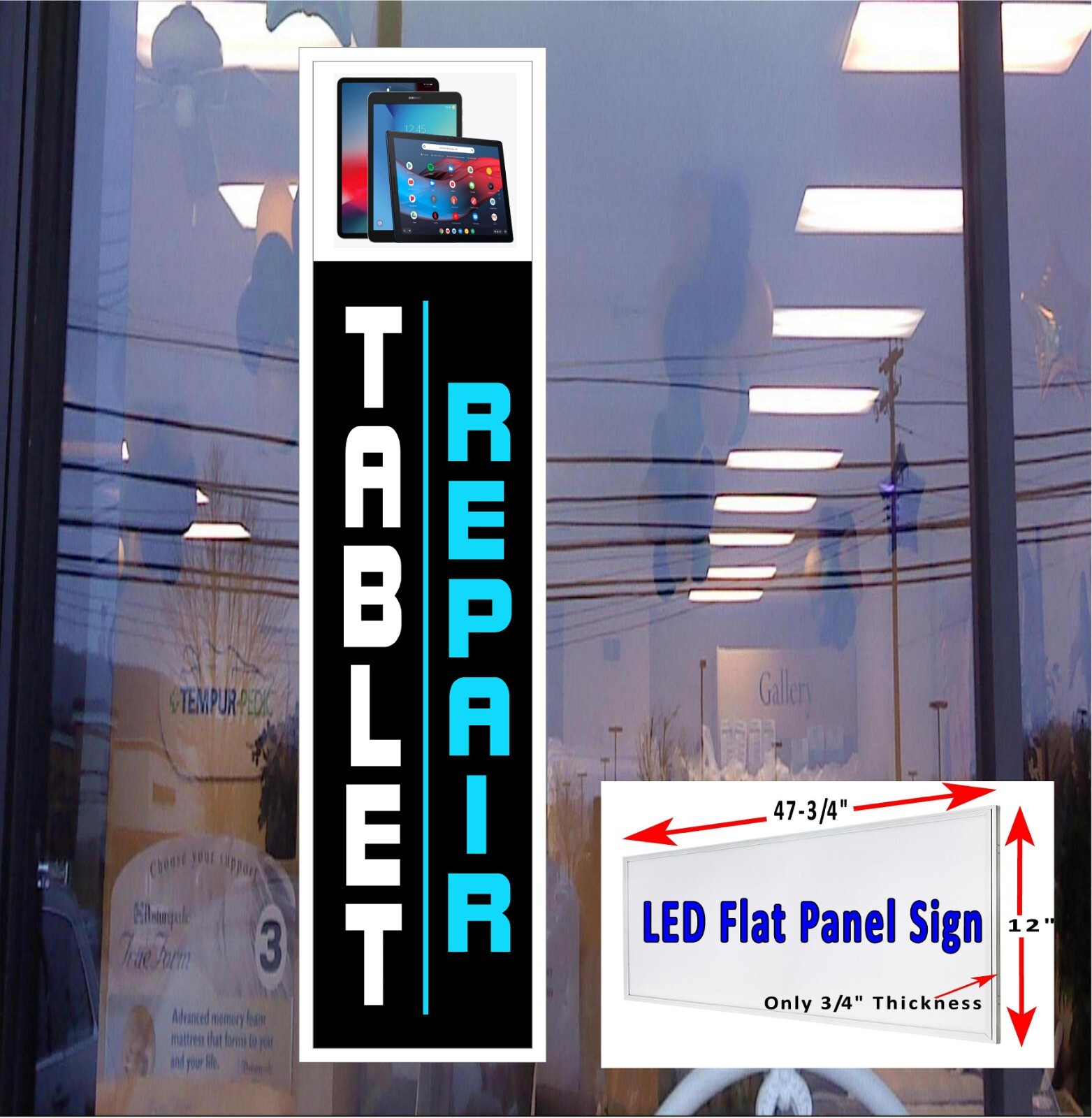 Attract More Customers and Generate More Sales! with our L E D Flat Panel Signs Tablet Repair led Sign (You will receive the same sign as the main listing photo) Great for Storefront Window Advertising Signs , Wall Displays, Trade Show Displays or A nywhere you need Advertising! An Inexpensive way to Promote Your Business, Products and/or Services to the General Public About this sign Made with Super Bright LED' s that makes this sign Brighter and more Cost Effective to operate than Fluorescent and Neon Signs. Built with heavy gauge aluminum frame with welded corners and a metal back panel to ensure durability and stability, inside is a State-of-the-art clear acrylic panel system designed to absorb and disburse even and bright led lighting though-out the front display area. Sign comes with a 12v power conversion system pre-wired and mounted to the back of the unit. "These signs will pay for themselves in Energy Savings Alone" Some of our listing images are digital images, sign will be much brighter than the listing photo. We use the same digital image when we print your sign. With over 300 pre-designed signs available we do not have a photo file for all of them available. We have some past customer sign images available by request. Description / Included Hardware For Interior Use Only Sign Size: " 12 x 47-3/4" x 3/4" 1 Flat Panel LED Light Box Sign 12v Mounted Power Supply with 6 foot Power Cord Includes pre-installed print as per listing photo (Prints are changeable for future advertising needs) Hanging D Hooks included and installed (2)- 24" Hanging Chains and (4) "S" Hooks included for sign installation About Custom Creation Sign Company We been in business since 2009 making custom illuminated signs and advertising products, through the years as technology changes and improves we have upgraded our products to keep up with the best available advertising signs for our customers, and we continue to do so. With over 2000+ signs sold nationwide we strive to be the go to company for all your advertising sign needs. Shipping: Signs will ship within 24-48 Hours from purchase and will include shipping insurance thru the shipper for each order. NEED A CUSTOM SIGN FOR YOUR BUSINESS? We also offer this sign with your custom wording at NO Extra charge! C ustom C re 8 tion S ign C o . "Checkout out e b a y store for more advertising signs we offer" Don't Forget to Sign-up for Our monthly Newsletter!!
