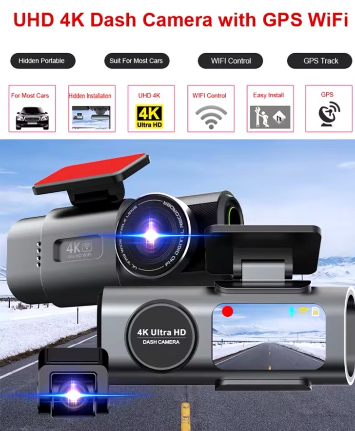 Dash Cam Dual Lens 4K UHD Recording Car Camera DVR Night Vision Video Recorder Built-In Wi-Fi Support GPS 24H Parking