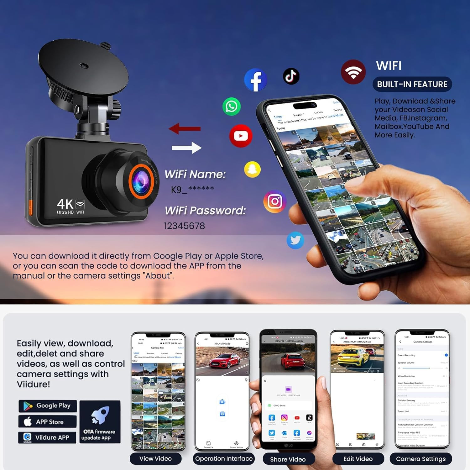【4K+1080P Dual Dash Cam】brings you the dash cam front and rear, can record up to ultra HD 4K+1080P resolution video, ensuring clear visibility of road signs and license plates. With a 170° front camera and a 150° waterproof rear camera, it captures a wide perspective to minimize blind spots and protect all angles. The 3" IPS display screen provides real-time visuals, enhancing your user experience with sharp, vibrant images 【Loop Recording & G-Sensor】The dashcam is equipped with a highly-sensitive G-sensor that detects sudden impacts or abrupt changes in motion. In such cases, it automatically locks and saves the current video to prevent it from being overwritten. With seamless loop recording, older files are continuously replaced with new footage, ensuring uninterrupted recording. This combination helps preserve important video evidence and better protects your rights and interests in case of an incident 【Parking Monitor & Free 64GB SD Card】This dash cam features a 24-hour parking monitor to safeguard your vehicle while parked. When the G-sensor detects a sudden collision, it automatically locks and saves the video to ensure important footage is preserved. Please note that a hardwire kit (not included) is required for this function to operate continuously. Additionally, we provide a free 64GB SD card to meet all your recording needs 【Superior Night Vison】The car camera also offers excellent night vision, utilizing WDR technology combined with a 6-glass lens system and an ultra-large F1.5 aperture to enhance color accuracy and clarity. Whether you're driving at night or in low-light conditions, it ensures important details like road signs, license plates, and pedestrians are captured clearly, providing reliable protection 【Built-in WiFi & Smart APP Control】: Easily connect the dash cam to your smartphone using WiFi and manage it through the “Viidure” app on your iOS or Android device. With just one click, you can view, playback, and share your travel experiences and memorable moments with friends and family. Enjoy seamless control and convenience right from your smartphone 【Super Aftersales Service】 The Dash Cam includes a 12-month warranty and 24/7 customer support. We're here to assist you with any questions regarding the product, installation, or usage. Feel free to reach out anytime, and we typically respond to inquiries within 24 hours. Your satisfaction is our priority