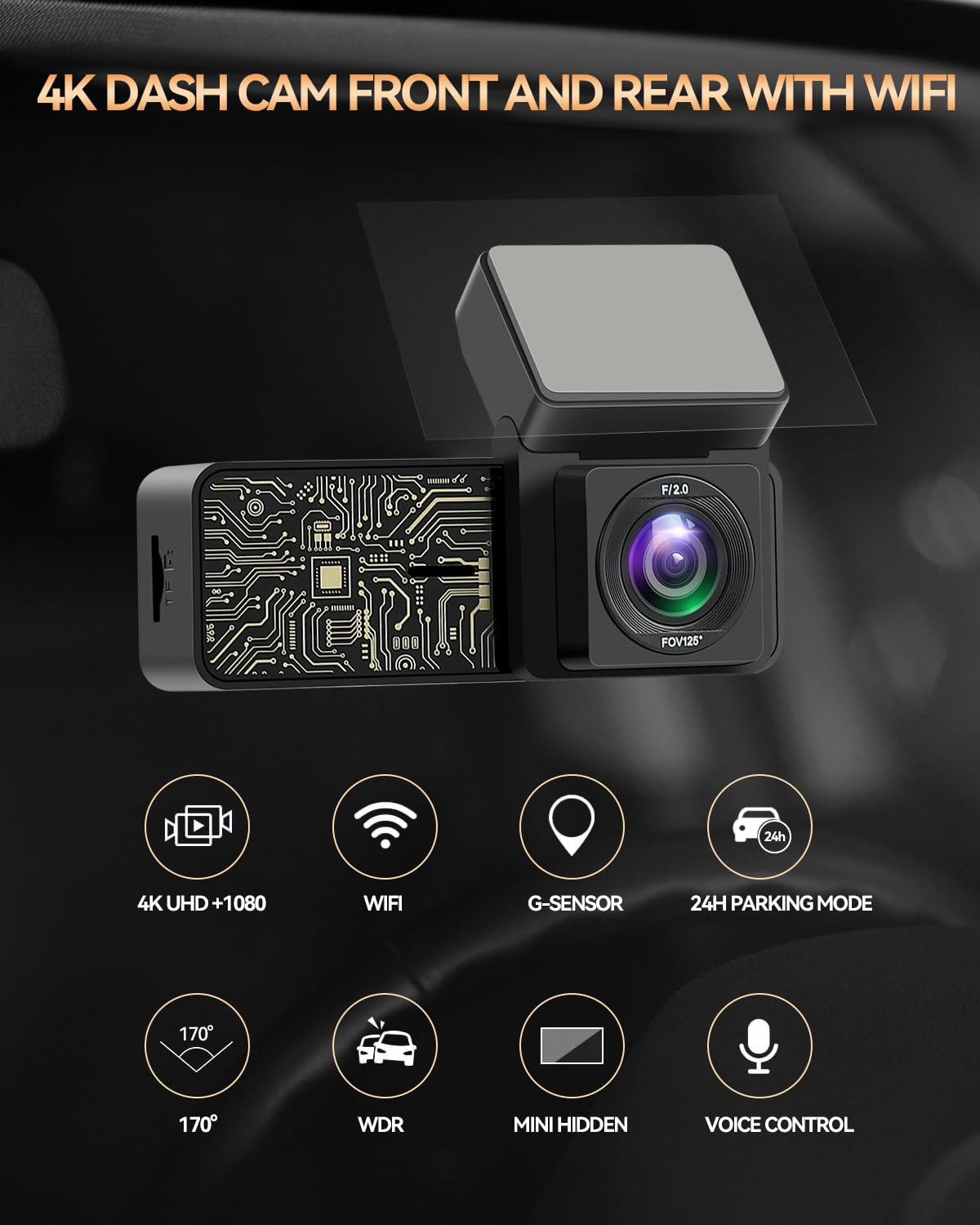 4K Front Camera + 1080P Waterproof Rear Camera - dashcam front camera supports up to 4K 3840*2160 resolution, delivering cinematic and smooth 4K image quality. The driving recoder has the front wide angle of 170 degree and covers four lanes, rear 1080P dash camera which providing present evidence of sudden carsh during driving (Note: The dash cam input by Type C port). WIFI Dash Cam with App Control - The car cameras front and rear built-in WiFi showing your scenic drives on the phone in real-time, it allows you update your travel blog on the go. It's so easy and convenient to share the travel scenery and wonderful moments with your family and friends through the app, easy to download important recording for insurance claims. Night Vision WDR Dash Camera - This dashcam front and rear camera equipped WDR technology, it intelligently adjusts to light variations, preventing overexposure and preserving every detail in your recordings when navigating through tunnels or facing sudden intense light. Compact Mini Dash Cam with Voice Control - The front and rear dash cam with mini and lightweight design, it's easy to mount behind the rear view mirror and goes virtually unnoticed, which won't obstruct your vision while driving. Speak the voice command, it will listen and follow your command. Free your hands, enjoy the road trip. 24hour Parking Mode Safety Protection - When the dash camera for cars front and rear connected to the dedicated hardwire kit, it can continue recording at low frame rate mode even when you turn off your cars and get away. The dash cam will save the evidence for malicious car damage events when parking.