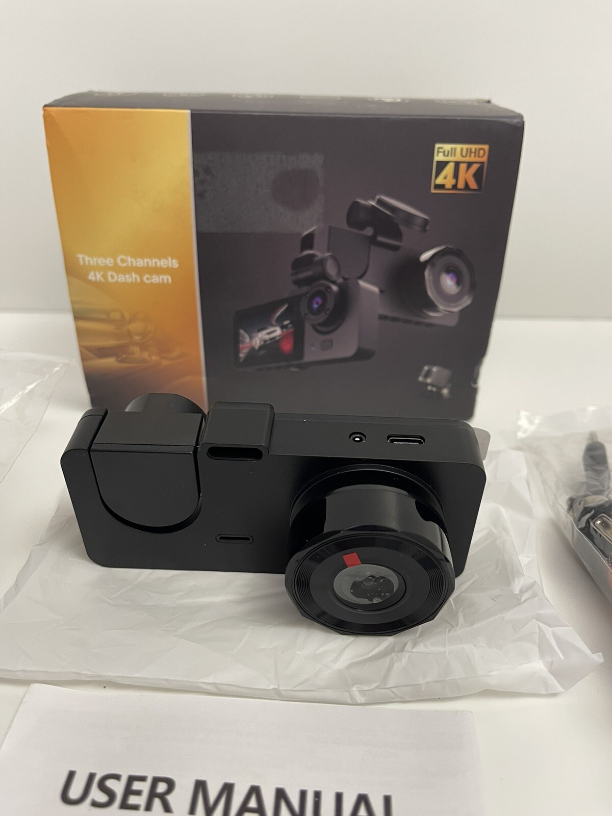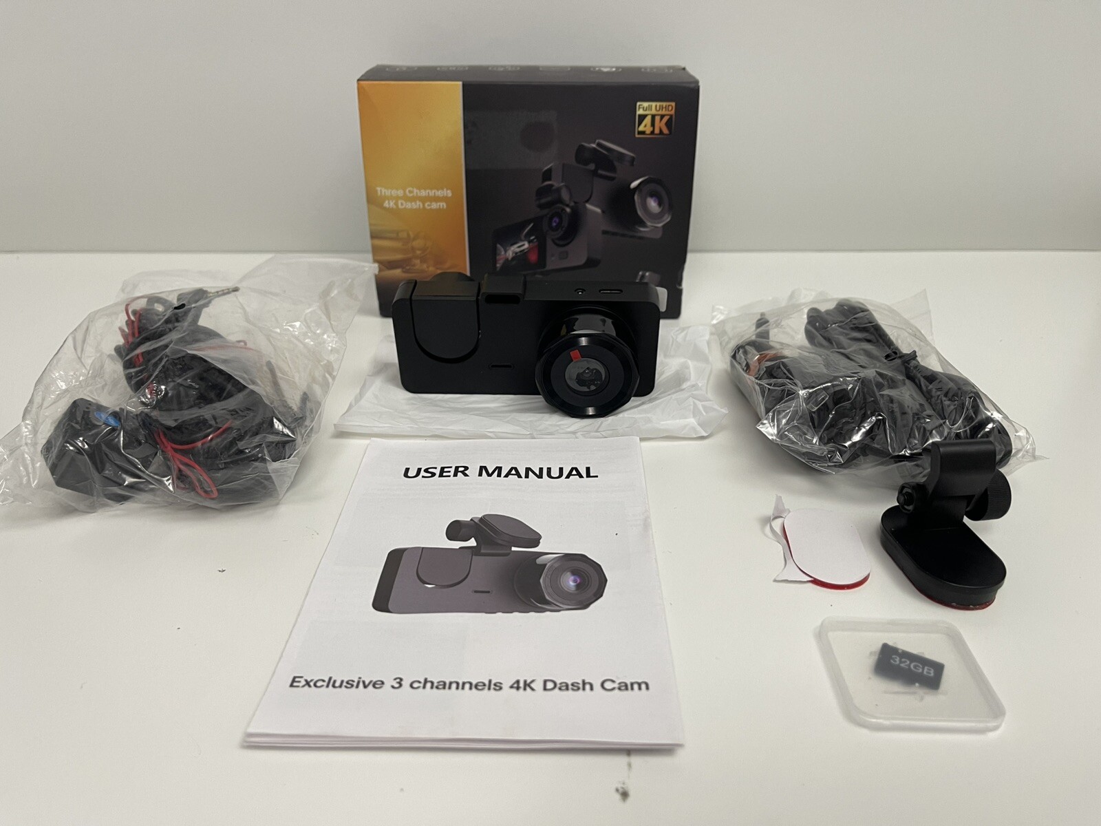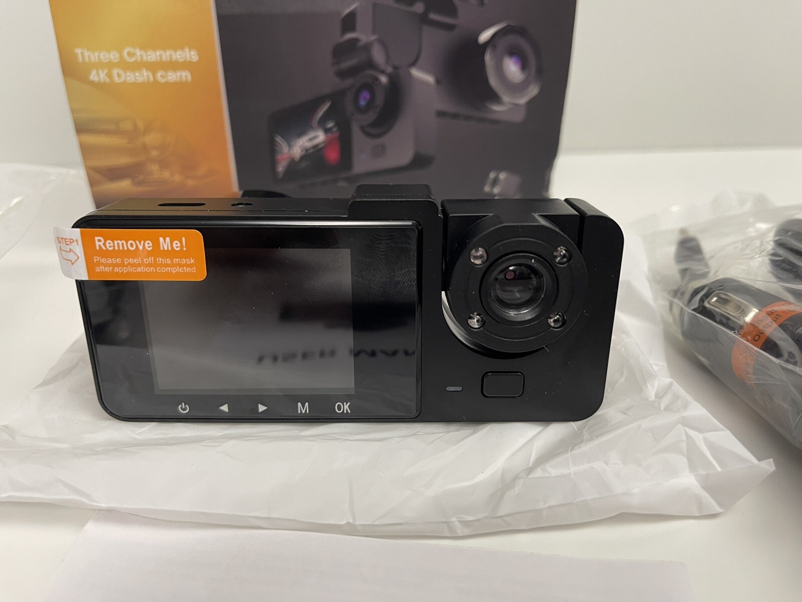 Open box. Comes with everything pictured in listing photos. Dash cam still have protective film on screen and camera
