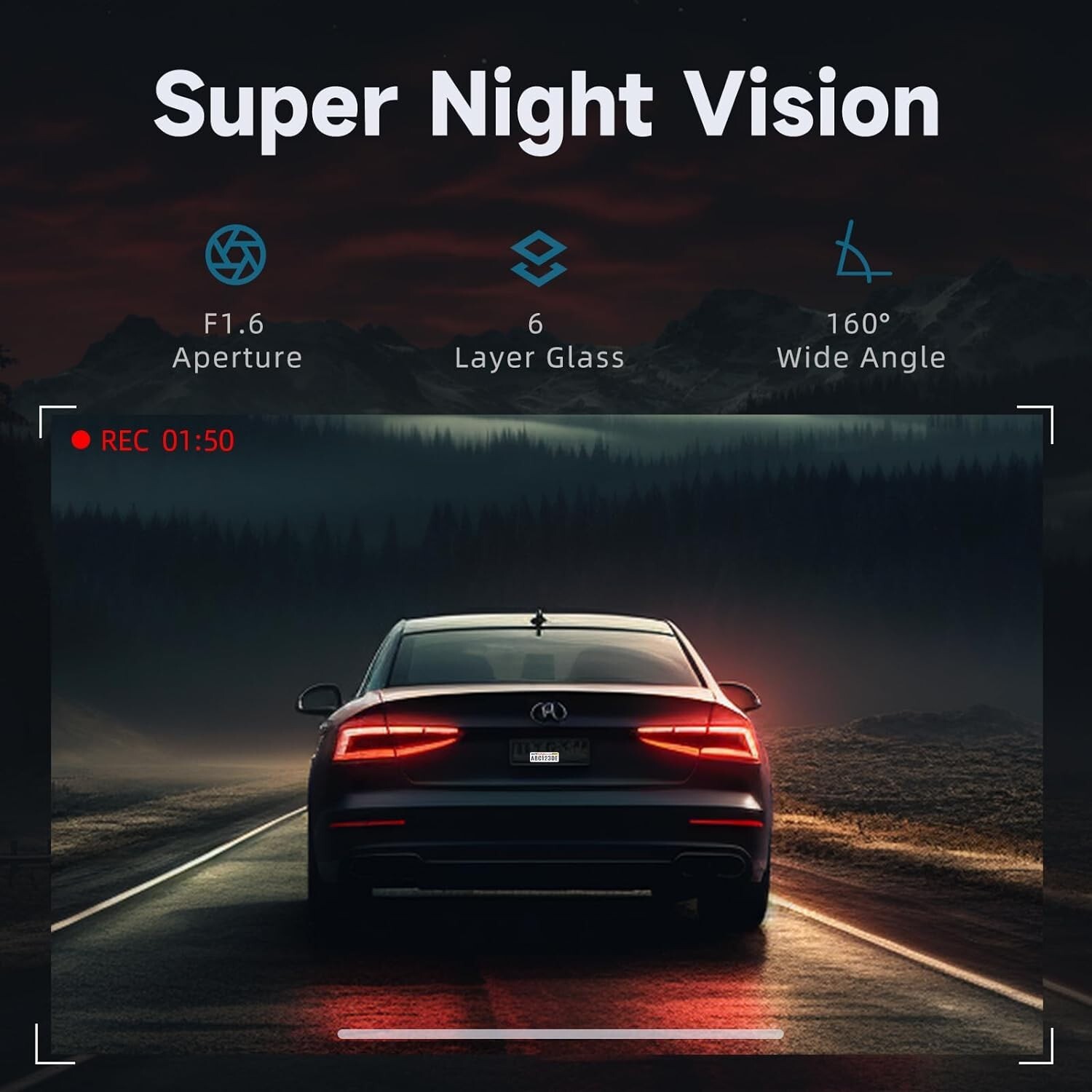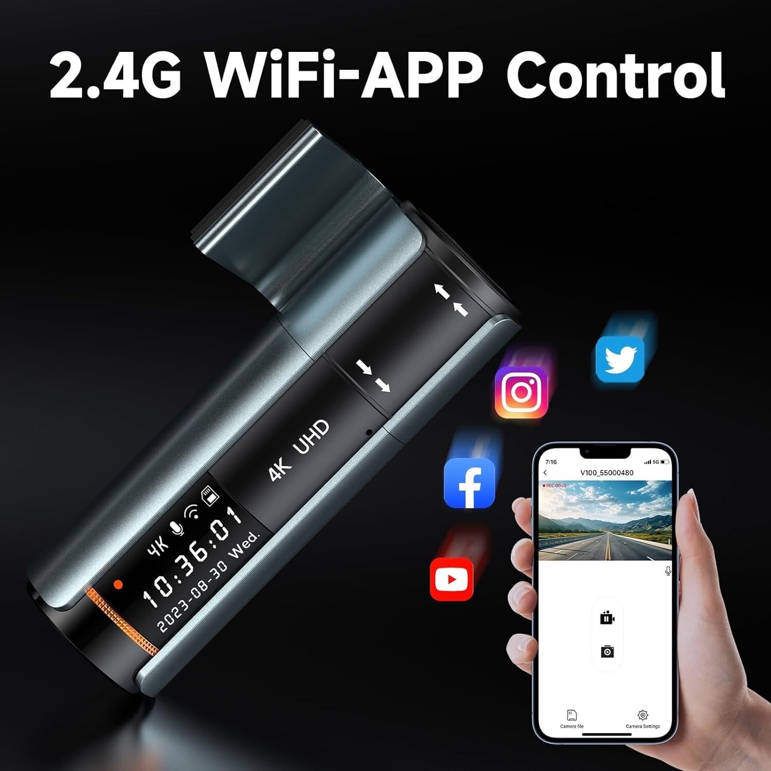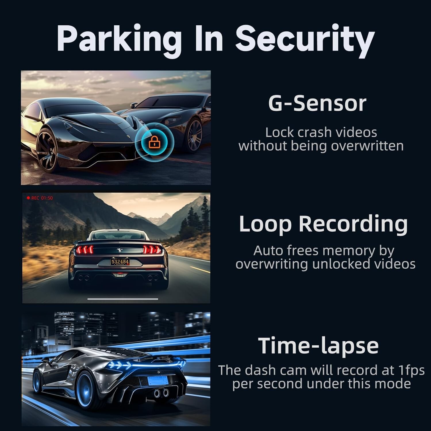 ⚠️ Please be aware that connection to the app may not be possible when using wireless CarPlay or Android Auto. ⚠️ Note: When viewing the phone's real-time video, it displays in 720P quality. To view the video in 4K quality, please download it. 📸 4K Ultra HD 2160P Front Car Camera: The front dash camera is backed by advanced starvis sensor and 6 glass lens. Front 160° wide angle can captures crystal clear video at UHD 3840*2160P, which clearly captures the license plates and road signs. 📸 Smooth 2.4G WIFI-APP Control: Use the App to view and manage dashcam recordings instantly on your iOS and Android smartphone. Fast to download and share videos with friends and family through social media. Perfect wifi dash camera for cars, truck, SUV, easier to provide evidence when insurance claim. 📸 WDR Super Night Vision: Dash camera adopts an ultra-large F1.6 aperture and 6 layers lens increase 60% light intake, and is equipped with WDR (Wide Dynamic Range) technology, achieves super night vision by automatically balancing the exposure in extreme dark scenarios, to ensure clear and sharp footage. 📸 24 Hours Parking Monitor and Time-Lapse: The parking monitor automatically activates and records emergency videos upon detecting collisions, (Requires hardwire kit, ASIN: B0CHYV8WDC). 24H Time lapse mode keeps recording with low power consumption and low frame rate, protecting vehicle from theft or vandalism. 📸 Safe & Mini Design: Made of high quality aluminum alloy, the working temperature is from -40℉ to 185℉. With heat resistance chipset and adhesive pad, the car dash camera works fine and stays attached to windshield even on hot sun. Mini and hidden design won’t obstruct your view while driving. Stable performance without lithium battery, prevent the risk of overheating and explosion. Ensure ultimate safety for you and your car.
