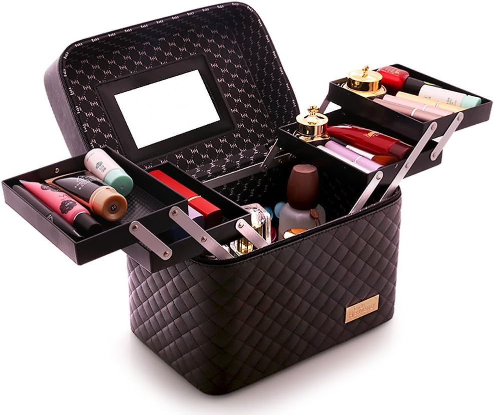 PREMIUM MATERIAL: This Makeup Bag is made of high quality Simulation Leather with waterproof .4 trays shelf can be smoothly slid sideward, fast and simple to reveal storage in each compartment(Note: Cosmetic Accessories Not included). PLENTY OF STORAGE SPACE: This Makeup Bag have enough space to storage your makeup and cosmetic accessories, like lipstick, lip gloss, Perfume,makeup brushes, eyeshadow, makeup palettes, hairbrushes, skin care products, nail polish, nail art tools, shampoo ,Jewelry, Electronic Accessories, Camera, Essential oil, Toiletries, Shaving Kit, Valuable objectsand so no. MULTIFUNCTIONAL:Portable and Lightweight design,can carry with you.The make-up bag comes with a built-in,you can make makeup anytime anywhere DIMENSION: 11" x 7.1" x 8.9"(Figure 6, with iPad as a reference).Weight :1.07kg(2.36lb).It's more lightweight than aluminum make-up bag.(The bag are fixed by glue, so there might be some smell,Open the box and leave it for a period of time, the smell will be eliminated) The Cosmetic Train Case Makes The Box Very Gorgeous, Fashion As Well As Cute, And Is Also An Ideal And Precious Gift For Your Friends. 100% CUSTOMER SATISFACTION GUARANTEED :If came in used, dirty and defective,please contact us.We'll give you a refund or a new one. Customer satisfaction is on our top priority. Product Description Portable Multifunctional Professional Makeup Case 2 colors:1,Black.2,Pink. The bag are fixed by glue, so there might be some smell. Please don't worry, keep open for 2-3 days the smell will wear off. No washing required. store your lipstick, lip gloss, makeup brushes,moisturizer, foundation, eyeshadow, makeup palettes, perfume,hairbrushes, skin care products, nail polish, nail art tools, shampoo ,hairspray,Jewelry, toothpaste, tooth brushes,pills,electronic accessories, camera, essential oil, toiletries, shaving Kit and so no. Great Gift Whether A Gift For Yourself Or Someone Else, You'll Enjoy Opening Your Sooyee Gift Box To Find The Latest Addition To Your Collection, it's the perfect way to say thank you, I love you, or I'm thinking about you to your niece, daughter, wife, mother, sister, bridesmaid, bride or student. Product Details Color: Black Material: High quality PU Leather with waterproof Type: Makeup organizer Product Dimensions(approx.): 11" x 7.1" x 8.9". Weight :1.07kg(2.36lb). Package included: 1 x Makeup organizer Note: Makeup shown in the photos is not included . Wonderful Girls Gift - With this portable , good-looking ,sturdy organizer ,it can meet all people's wishes ,especially for festival gift like Christmas Days, Valentine's Day. This beautiful and timeless cosmetic bag can organize your makeup brushes, tools, eyeliners, lip liners, and other miscellaneous needs.Keep everything neatly in place and makes travel both stylish and easy.365park cosmetic bags hold makeup you need to look fresh-faced throughout the day and night. Sooyee travel case is not only for your cosmetics but also a great storage case for camera, jewerly ,electronic products and other valuable objects. Made of high quality PU, Lining-nylon which is wear-resistant,easy-cleaning,waterproof,shakeproof for long time using. Height:8.9 INCH Product Dimensions(approx.): 11" Lx 7.1"W x 8.9"H With iPad as a reference, we can show the size of our cosmetic bag more clearly. Length:11 INCH. Product Dimensions(approx.): 11" Lx 7.1"W x 8.9"H