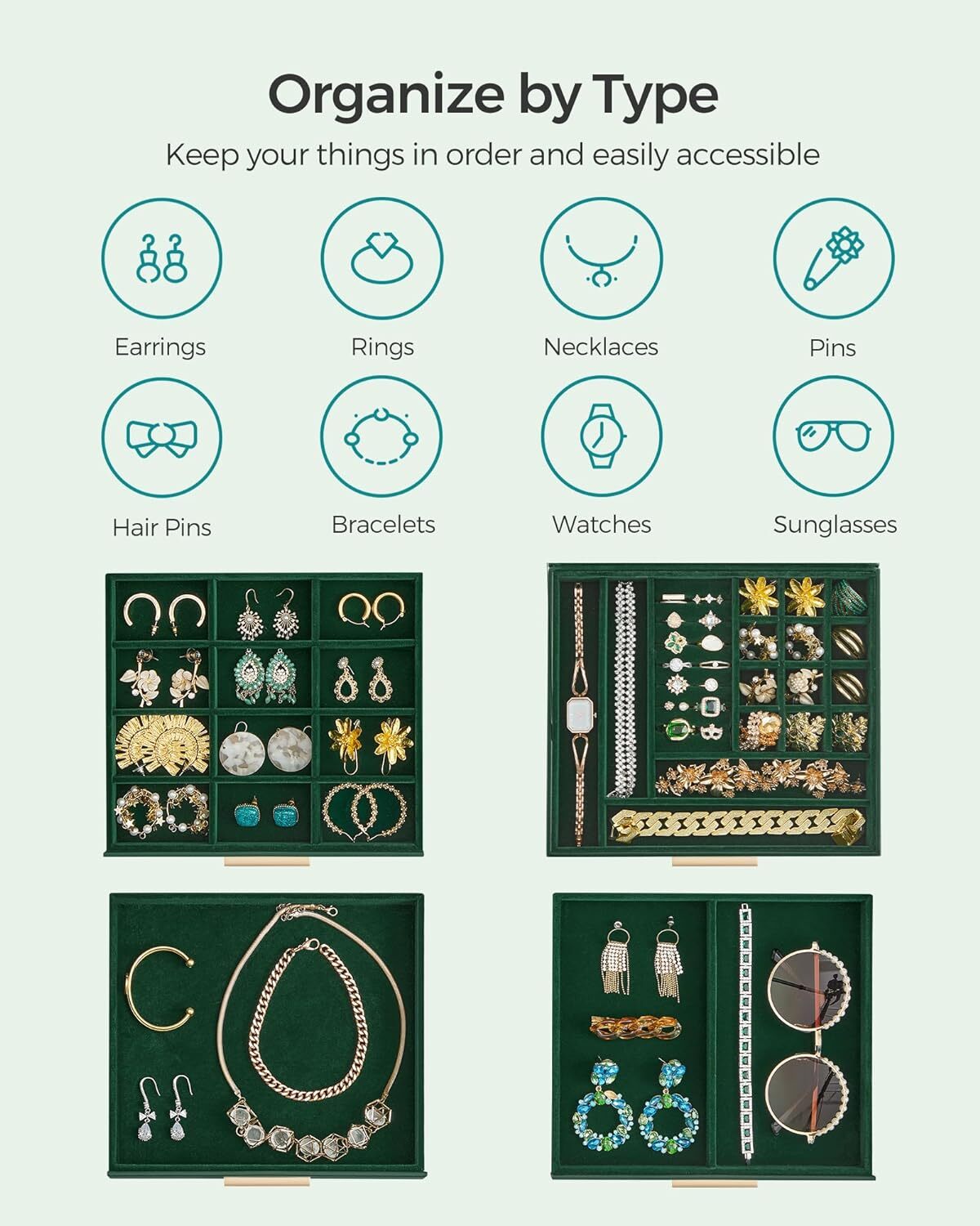 [Storage, 4 Layers] Keep all your jewelry organized in this jewelry box—small pieces of jewelry go in the various slots of the top layer, and big jewelry goes in the bottom 3 drawers [Clear Glass Lid] The see-through glass lid of this jewelry organizer allows you to see and find your favorite jewels at a glance while protecting them from dust, keeping your jewelry ready to wear and clean [Chic & Durable] Elegant green and gold colors, shiny metal handles, soft velvet lining, neat stitching, quality PU, and sturdy MDF—all these elements combined make this jewelry case stylish and durable enough for your ever-growing jewelry collection [Perfect Gift Idea] Gift this original design jewelry box to your loved ones on Valentine's Day, for their birthday or anniversary to surprise them! Or, treat yourself to this fancy jewelry box—you deserve it! [Versatile Use] This modern jewelry holder looks nice whether displayed on the dresser of your bedroom or your cloakroom to organize your pins, necklaces, rings, bracelets, and other accessoriesa