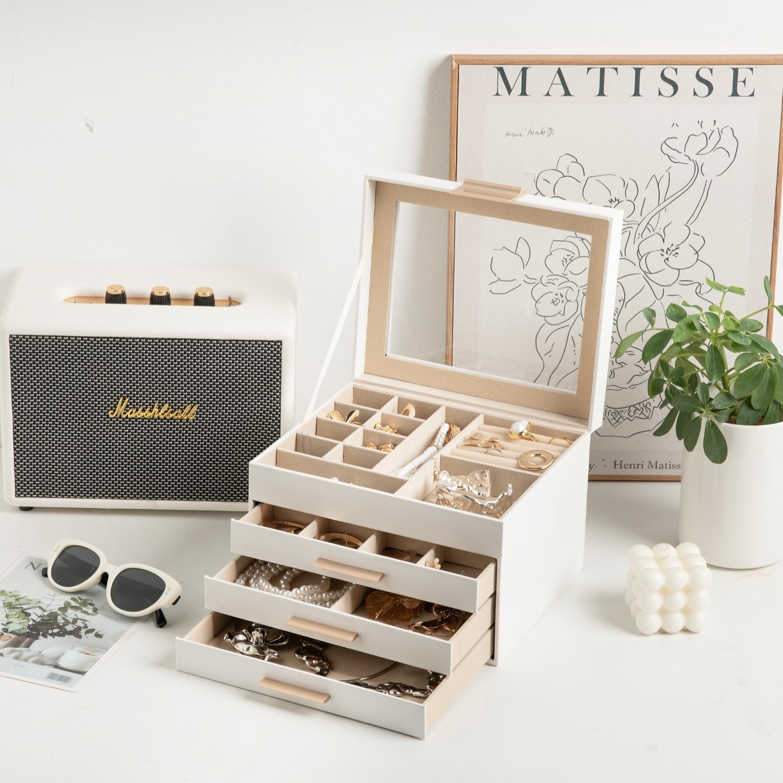 Visualization Design:The large clear lid at the top of this jewelry box allows you to see the top shelf at a glance, perfect for storing some of your daily, high frequency jewelry, and within easy reach when you want to find them Premiun Material:The faux leather on the outside of the jewelry box is strong and durable, easy to care for, and can be easily wiped off with a damp cloth when dirty. The velvet lining is very soft and can well protect your jewelry from scratches 4 Layer Storage:This jewelry storage box has a total of 4 layers, each with a different layout, which can easily meet your daily jewelry storage needs, such as rings, earrings, necklaces, brooches, bracelets, etc Stylish Appearance:Chic gold handles, minimalist style, and transparent design come together to form this elegant jewelry holder organizer with a chic look suitable for a variety of scenarios including vanities checkrooms and jewelry stores Ideal Gift:Looking for a gift for a jewelry collector? Such a beautiful and practical jewelry box is definitely an excellent gift choice for your girlfriend, wife or mother