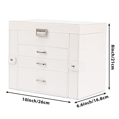 Return Policy Fast Delivery Trusted seller Jewelry Box for Women 4-layer Leather Large Jewelry Organizer Box with Drawers&Mirror for Necklace/Ring/Earring/Watch Storage (White) Product Description 【Large Capacity】4-layer Leather jewelry box measures 10.4 x 5.9 x 11 inches and has an elegant and fashionable appearance. It is suitable for use on dressing tables, bathrooms, and in professional powder rooms. Its sturdy structure and high-quality materials make it durable, and the practical handle allows for easy carrying. 【Lid Designed with Mirror】 Large-capacity jewelry box has 4 pull-out drawers, providing a total of 5 layers of storage space, enough to hold all of your jewelry. The two side necklace storage areas have 16 hooks and 4 pockets in total to keep necklaces from tangling. The top storage area has a mirror for convenient jewelry trying-on. The lid has a ribbon attached to prevent it from falling. 【Flexible Partition】Jewelry organizer has earring boards, ring card slots, watch pillows, and drawers for glasses storage. Watches, necklaces, earrings, brooches, hair accessories, sunglasses, etc. can all be stored separately. Some partitions can be moved and disassembled, and the flexible design allows for customization to meet personal needs. 【High Quality】Jewelry storage organizer is made of environmentally friendly, high-quality faux leather that is dirt-resistant, waterproof, and easy to clean. The inner lining is soft velvet fabric that protects jewelry from scratches and damage. The top layer has a metal lock, and each drawer has a metal handle. The high-quality hardware does not leave fingerprints, making it more convenient and sophisticated to use. 【Ideal Gift for Women】Jewelry box for women is the perfect gift for Valentine's Day, Mother's Day, Thanksgiving, Christmas, birthdays, and weddings. It is a great gift for women, girls, mothers, and wives. If you have any questions about the product, you can get help at any time by ing on the seller's name behind "sold by" at the bottom of the shopping cart. Shipping Returns Payment Shipping Shipping is FREE to all addresses other than APO/PO boxes in the lower 48 states. All our stock ships from US-based warehouses. Shipped via USPS or UPS (depending on location and package weight) Unless stated otherwise, all orders will ship within 24-72 hours of your payment being processed. Check our feedback to see the great reviews of FAST shipping we offer. Returns Seller does not accept returns Payment We currently accept payment via eBay managed payments only. Once payment is cleared, we will dispatch your shipment within 1-3 business days. Please refer to the "Shipping" tab for more information regarding shipping speed to your destination.