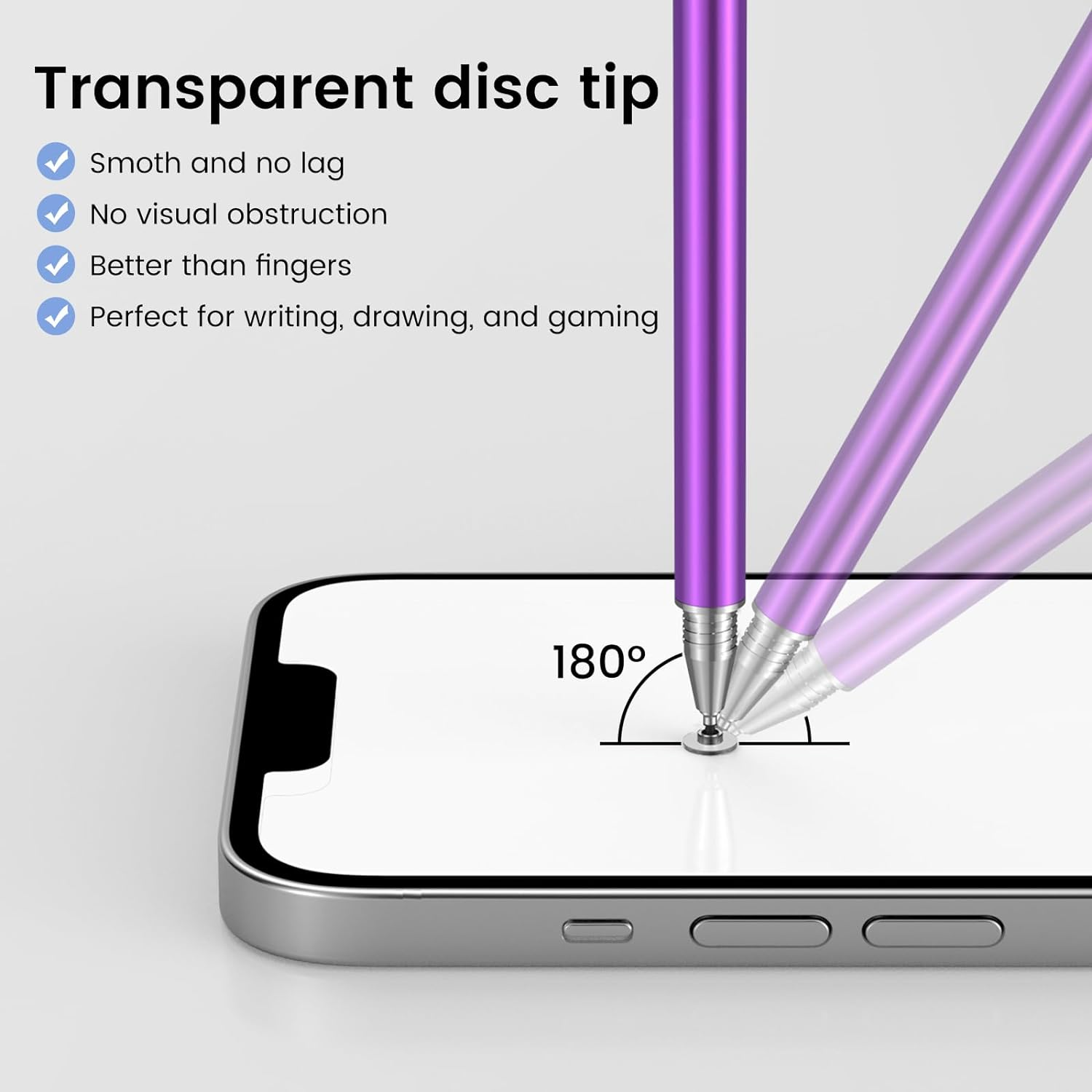 【 2-in-1 Design】The upgraded stylus pen features both a transparent disc tip and a soft rubber tip on either end, providing a seamless transition from writing to sketching and anything in between. The aluminum barrel also adds a comfortable grip for extended use. 【Precision Writing&Drawing】Our stylus pen features a small, 0.24" diameter transparent disc tip that flexibly fits on screens without leaving disconnected lines, providing improved accuracy. The soft anti-scratch rubber tip delivers a smoother, more responsive digital touch experience, ideal for writing and drawing. 【Versatile Compatibility】MEKO 4-pack stylus pens work flawlessly with any touchscreens including Smart Phones, Android Tablets, Touch Screen laptops/PCs, Apple iPads, iPhones, Samsung, Android, Surface, Chromebook, and other capacitive touch screens devices. 【Extra Value】The 4-pack ipad stylus set provides 12 replacement tips (4*disc tips and 8*rubber tips), the tips are easy to install and durable, to meet your creative needs, say goodbye to frequent replacement. 【Perfect Gift】Our MEKO stylus pens are an excellent gift for anyone looking to enhance their digital experience. The sleek design, versatility, and upgraded quality make it a perfect gift for students, artists, writers, or anyone who loves to use their touchscreens with ease and precision. 【Satisfaction Guarantee】We care about your satisfaction, which is why we offer a 90-day replacement service for quality issues and a money-back guarantee. Additionally, our customer support team is available 24 hours a day to assist you with any questions or concerns you may have about our stylus pens. Product Description 1 Clear Disc Tip 2 Precise Control 3 Screen Friendly 1 2-in-1 Design 2 Sensitive and Smooth 3 Comfortable Material