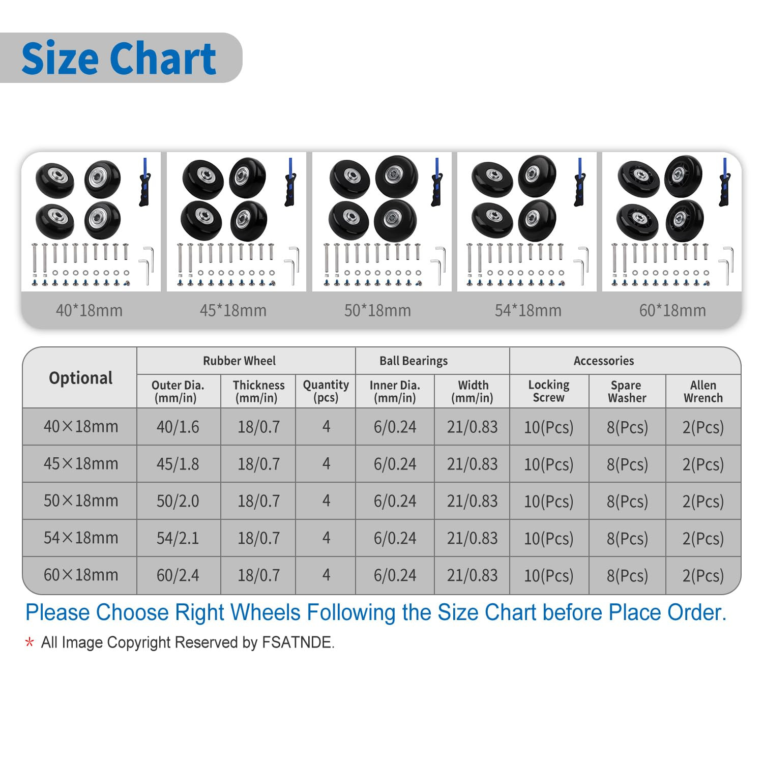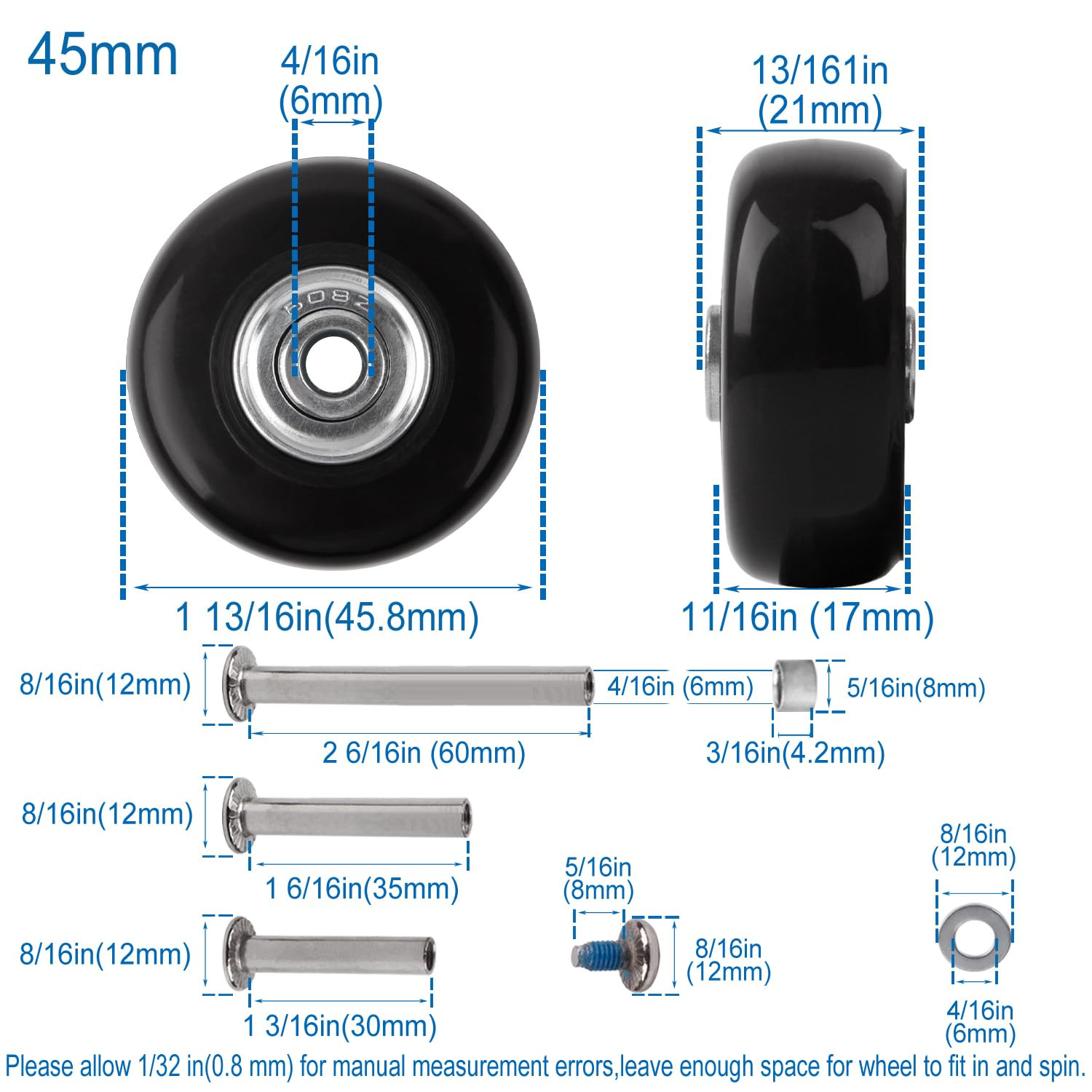 【Fit Most Luggage Bags】Suitable for Most Luggage suitcase/Trolley case/Duffle bag/Drawbar box with Damaged Wheels/Jammed Roller/Rubber Worn Caster.No Need to Buy a New One,Just Replace the Old Wheels at Home with This Full-set kit. 【Suitcase Wheels Repair Sets】4Pcs Rubber Rollers,Built-in Ball Bearings-Inner Diameter 0.24in/6mm&Total Width 0.8in/21mm,3 Size Matching Axles-axle body length1.18in/30mm-1.38in/35mm-2.36in/60mm,Customized Hacksaw Short Blade to Remove Worn Wheels Rivet. 【Support Single/Dual Wheels】Please First Ensure the Height & Width of Single Wheels’ Mounting Slots are greater than 0.83in/21mm,or Confirm the Axle Holder in the Middle of the Dual/Spinner Wheels is 0.4-0.7in/10-18mm Thick,and then Choose Right Wheels Following the Size Chart. 【Elastic Mute Bearings Wheels】Made of Poly urethane Rubber Integrated Perfusion and Built in Metal Dual Ball Bearings,Grip and Roll Smoothly,Strong load-bearing,Rotating Flexible,Silent and Wear resistant,Also Suit for Inline Roller Skating. 【Easy for 】Please Wear the Included Glove and Carefully Drill out or Saw off Roller Axle Rivet/Bolt to Remove Old Wheel,and then Lock New Wheel with the Spare Washer and Allen Wrench.