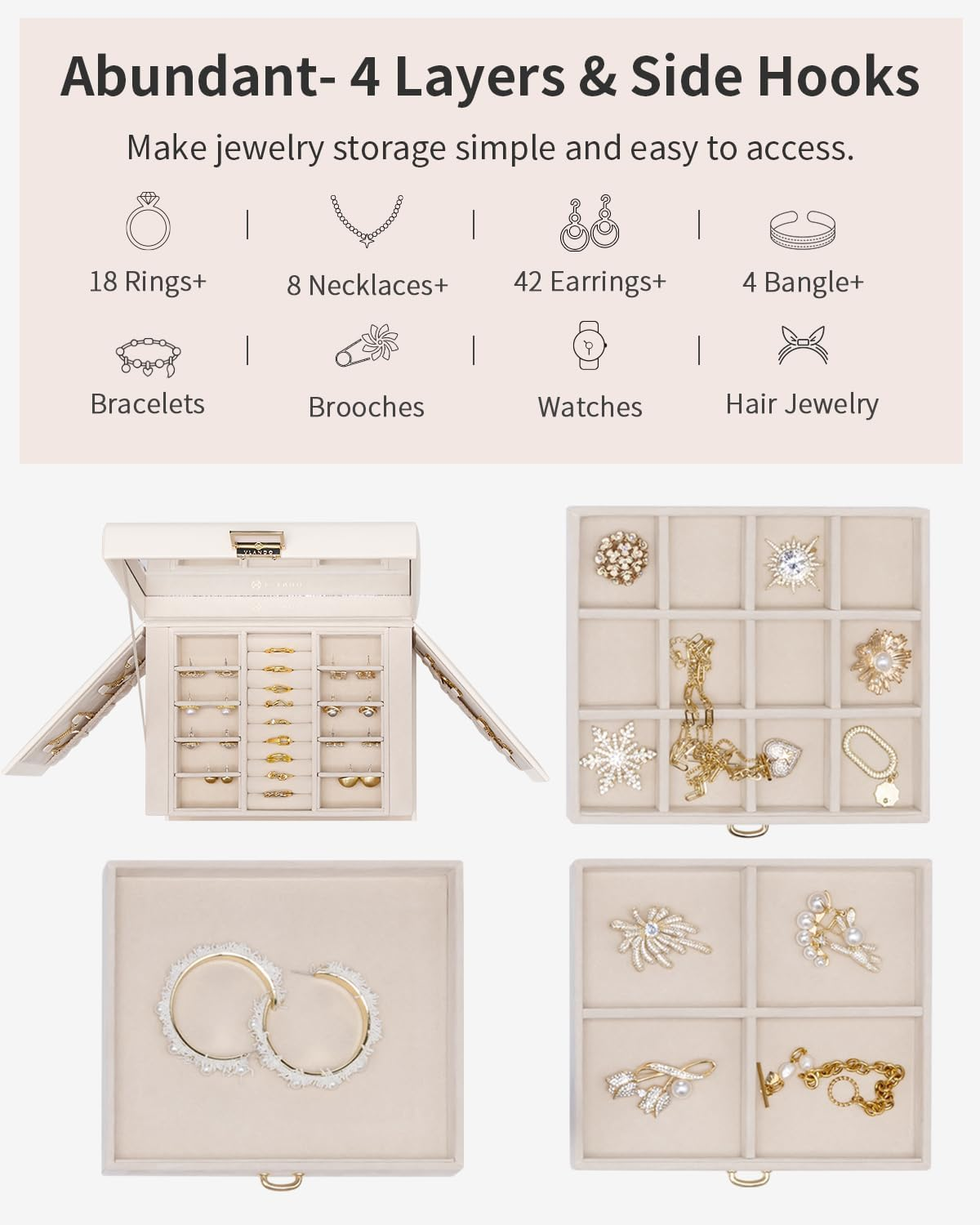 Menu Other Items Feedbacks About Us Contact Us Add To Favorites Jewelry Box 4-Tier,Jewelry Boxes & Organizers with Handle,3 Drawers Travel Jewelry Case with Mirror,Jewelry Storage,Earrings Necklace Rings Christmas Gift for Women Girl Apricot White [Magnetic Suction] Jewelry box organizer with humanized design,that is,the design of double magnetic suction,the side partition is also used in the way of magnetic suction. So you will not worry about some jewelry will fall to the ground when wearing, and your jewelry will not be damaged [Large Capacity] 4-Layers of storage,removable openings for stud earrings, ring slots, side hooks for hanging necklaces, velvet pockets and 3 drawers with separate compartments. Women's jewelry box welcome various jewelry, could store all kinds and all size jewelry,bracelets [Premium Material] The exterior of the jewelry box is made of eco-friendly scratch-resistant, odorless, finely textured and durable PU leather.The side hooks for hanging necklaces are made of metal,durable and not easy to deform. The velvet pocket storing necklaces is made of thickened material, which is superior to most jewelry boxes on the market [Gift Selection] Each jewelry box is gift box packaging, suitable for birthday,wedding,Valentine's Day,Christmas,anniversaries as a gift to friends,mom,girl friends.Absolutely, satisfy yourself with this elegrant, fashionable jewelry organizer—you deserve it [Portable Jewelry Box] Jewelry box with handle,cubo-shaped,easy to carry outdoors. The lid of this jewelry case have a large, clear mirror that is convenient for you to check whether the makeup is perfect before you go out Product Description Gift for Jewelry Storage Box Colors Multiple color options to meet your different scenes use Multi-functional large capacity storage jewelry box Home Storage - Say goodbye to messy desktop and knots in your jewelry. Size&Weight Explore Your Favorite Jewelry Box Customer Reviews 4.8 out of 5 stars 667 4.8 out of 5 stars 667 4.8 out of 5 stars 667 4.7 out of 5 stars 252 4.7 out of 5 stars 252 4.7 out of 5 stars 252 4.6 out of 5 stars 100 Price $28.49 $ 28 . 49 — $17.49 $ 17 . 49 $29.99 $ 29 . 99 $48.99 $ 48 . 99 $48.99 $ 48 . 99 $21.59 $ 21 . 59 Dimensions 8.9 x 6.9 x 6.6 inches 9.96 x 7.2 x 6 inches 11.6x 8.1 x 6.6 inches 9.44 x 5.4 x 1.18 inches 9.9 x 11.4 x 6.9 inches 9.9 x 11.4 x 6.9 inches 10 x 6.5 x 3.2 inches Number of Drawers 3 2 2 5 5 5 ✘ Special Features Portable,Removable,PU Leather PU Leather PU Leather Large Capacity,PU Leather Large Capacity,PU Leather Large Capacity,PU Leather PU Leather,Portable Lockable ✔ ✔ ✔ ✔ ✔ ✔ ✔ Suitable Wedding,Gifts,Anniversasry Gifts,Women,Girls,Wedding Gifts,Women,Girls,Wedding Gifts,Women,Girls,Wedding Gifts,Women,Girls,Wedding Gifts,Women,Girls,Wedding Travel,Gifts,Women,Girls Item Specification Style Modern Number of Items 1 Material Type Faux Leather Finish Types High Gloss Jewelry Storage Type Jewelry Box Number of Compartments 3 Target Audience Women, Girls Product Dimensions 8.9"D x 6.9"W x 6.6"H Material Faux Leather Number of Drawers 3 Closure Type Magnetic Item Weight 2 Kilograms Occasion Christmas, New Year, Wedding, Birthday, Memorial Day Special Feature Durable,Eco-friendly,Large Capacity Mounting Type Freestanding Color A.apricot white Item Dimensions D x W x H 8.9"D x 6.9"W x 6.6"H Inner Material Leather Shape Rectangular Recommended Uses For Product Necklace, Ring, Watch, Earring, Bangle Style Name Modern Dimensions Shipping Returns Additional Info Product Dimensions: 6.9 "h x 8.9 "h x 6.6 "h. Weight: 2.0 kg Fast shipping is very important for us. Our standard shipping service is FREE. Your order will be shipped within 1-3 business days upon full payment received. Most items are delivered within 3-5 business days, however, please allow 3-10 business days. We are shipping only to USA. We only ship to the confirmed Paypal address. We reserve the right to cancel any order for any reason at any time. We are not responsible for undeliverable addresses. We offer a 30 day return policy from checkout winning date. Your satisfaction is guaranteed! If for any reason you are unhappy with your item, just return it within 30 days for a full refund, minus shipping cost. Please contact us prior to initiating a return so that we can issue you a refund authorization. Items defective upon receipt must be packaged in their retail packaging as if new and returned with a detailed description of the problem. Return shipping fees are not refundable. We reserve the right to decline any returns if the above guidelines are not followed. All of our items, unless otherwise stated, will only run on 120 volts. Please check to make sure your country complies with these specifications. If you have a problem or question regarding your transaction please contact us before leaving any type of feedback. We will work with you to resolve any problem you may have.