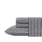 The Betsey Johnson sketchy stripe sheeting features a play on classic striping in a whimsical Betsey manner combining a bold black with white. Add some fun with Betsey's cotton percale sheet set. Available in an array of additional designs, these 200 thread count sheets will add an extra layer that is cool to the touch. Breathable and lightweight, this cotton construction is perfect for long-lasting comfort. Each sheet set includes one flat sheet, one fitted sheet, and two pillowcases (one for twin and twinxl sizes). The fully elasticized fitted sheet prevents slipping from the mattress and ensures the perfect fit. This set fits mattresses up to 18" deep (16" deep for twin/twinxl size and 17" deep for full size). This set is machine washable for easy care.