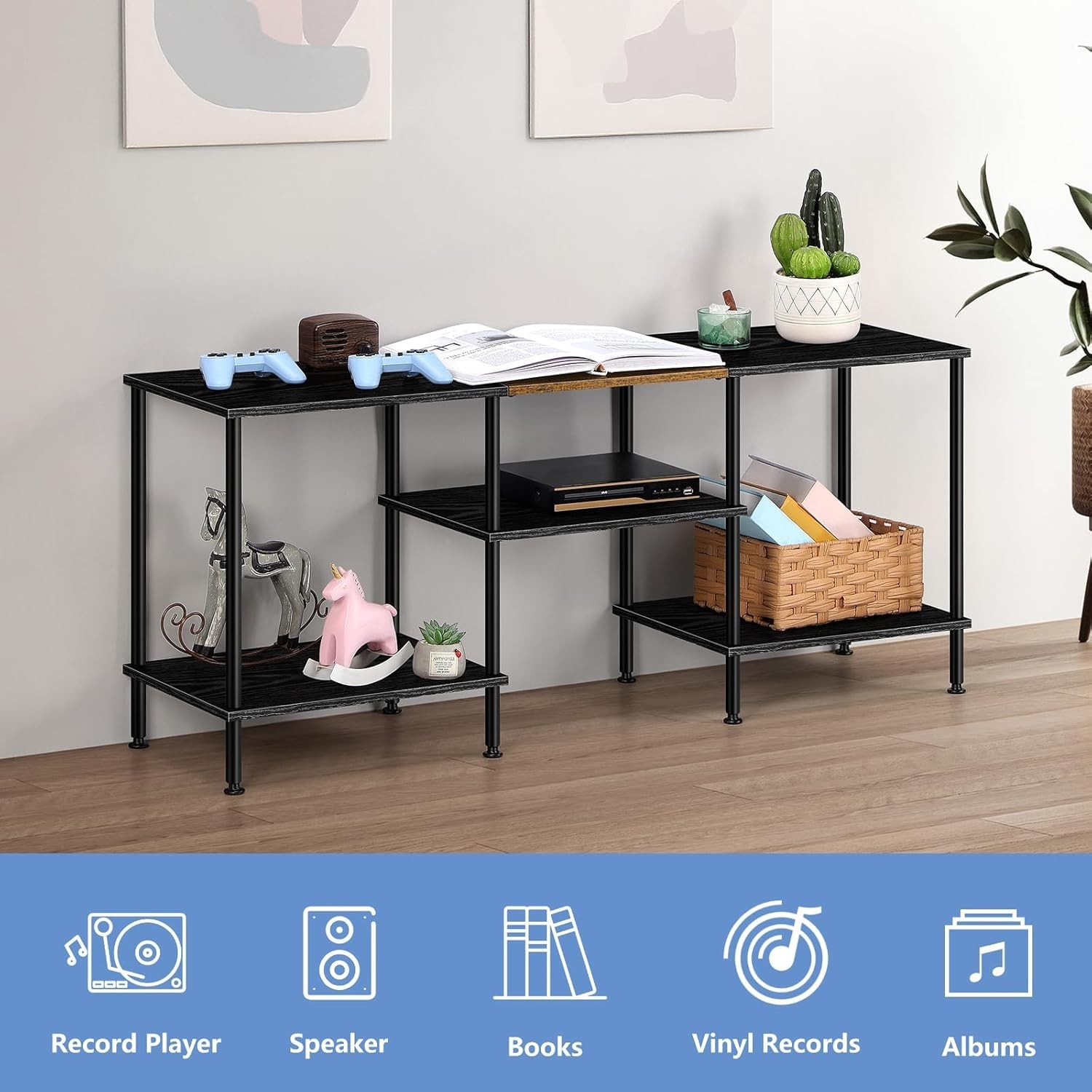 50 Inch TV Stands for Living Room Small Entertainment Center with Open Storage Shelves, Black TV Stands TV Media Console Table for 50 40 32 Inch TV 【50 Inch TV Stand】: black TV stand (''L×''W×''H) fits TVs up to 50 inches. The compact size saves valuable floor space, making our TV table stand an ideal choice for cozy living rooms, bedrooms, and other small spaces. 【Sturdy & Stable】: small entertainment center with storage shelves is crafted from high-quality MDF and sturdy metal materials for long-lasting durability. Equipped with 4 adjustable feet to prevent scratches and stabilize on uneven surfaces. 【Open Storage Shelves 】: Featuring 3-tier open storage shelves, our 40 inch TV stand provides ample space to place media players, speakers, remotes, decor, etc. Additionally, the space under the middle board fits storage boxes or small sweepers. 【Versatile Functionality】: More than a simple TV media console table, our TV stand for small spaces can also double as a couch table, display table, etc., turning your living room into a functional, stylish entertainment hub. 【Easy to Assemble】: Clearly labeled parts, full hardware, detailed instructions, and online video make setup quick and simple. For missing parts or quality issues with our small TV stand for bedroom, contact me, and we’ll reply ASAP. -- Small TV Stands for Living Room, Black-- .