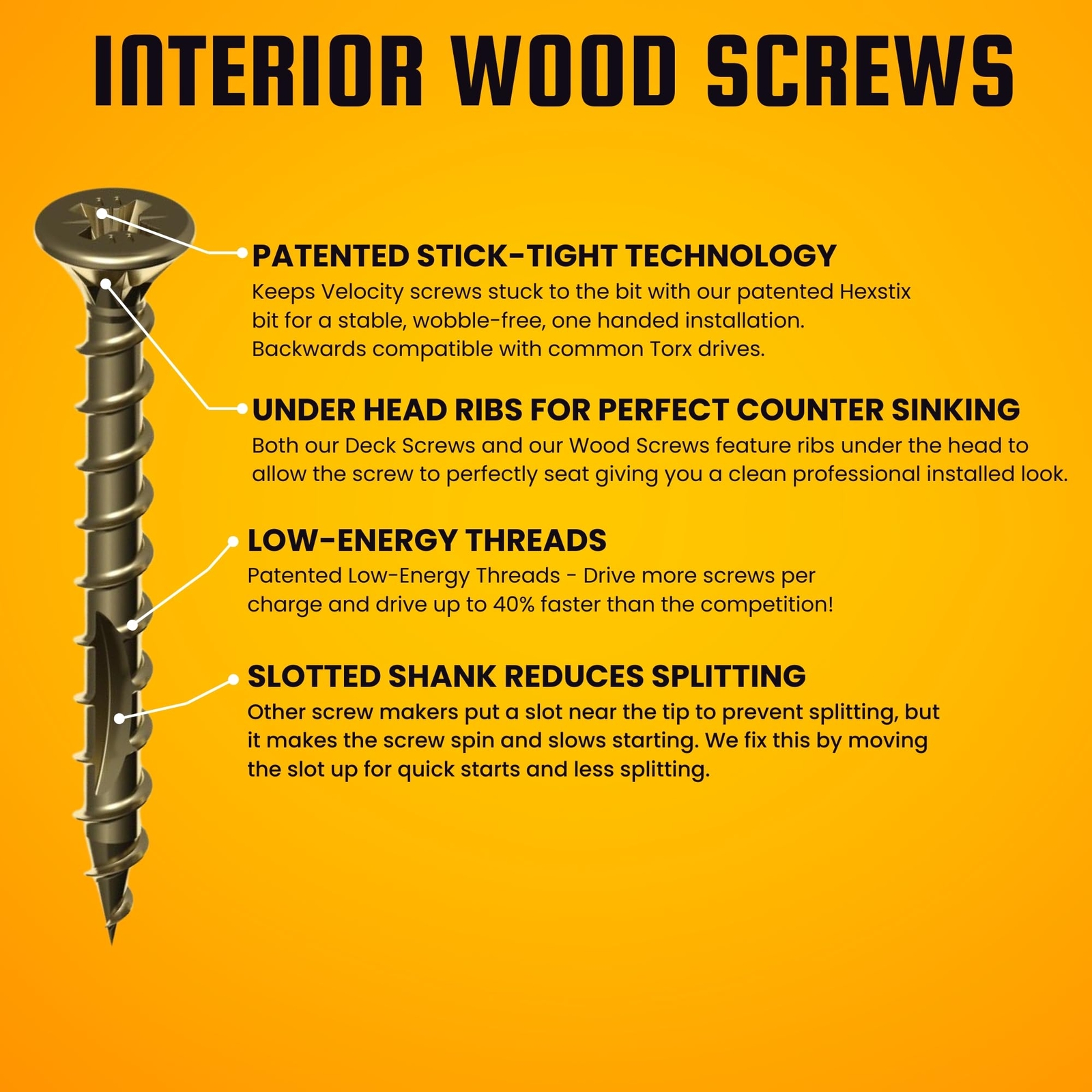 Velocity Interior 2 3/4 Wood Screws DIY Pack (Size #10, 50 Pcs) โ Zinc and Yellow Coating, Stick-Tight Technology Screw for Wood Working with PSD ACR Driver Bit ๐๐๐ฟ๐ฎ๐ฏ๐น๐ฒ ๐๐ป๐๐ฒ๐ฟ๐ถ๐ผ๐ฟ ๐ช๐ผ๐ผ๐ฑ ๐ฆ๐ฐ๐ฟ๐ฒ๐๐ ๐ณ๐ผ๐ฟ ๐ช๐ผ๐ผ๐ฑ ๐ช๐ผ๐ฟ๐ธ๐ถ๐ป๐ด: The Velocity Wood Screw DIY Pack includes 50 interior screws in size #10x2 3/4. These carbon steel screws are yellow zinc plated, with shank-slots to eliminate splitting and under head ribs for countersunk screws. Ideal for woodworking projects. ๐ฃ๐ฎ๐๐ฒ๐ป๐๐ฒ๐ฑ ๐ฃ๐ฆ๐ ๐๐๐ฅ ๐๐ฟ๐ถ๐๐ฒ ๐ฆ๐๐๐๐ฒ๐บ: These wood screws come with a patented PSD ACR Driver bit that fits perfectly into the recess, providing Stick-Tight Technology that allows the screw to stick to the bit for a stable, anti-wobble screws for wood, one handed installation. This recess is compatible with commonly used , Pozi and square drives. ๐๐ฑ๐๐ฎ๐ป๐ฐ๐ฒ๐ฑ ๐๐ฒ๐๐ถ๐ด๐ป: The interior screws are designed with shank slots placed up the shaft to reduce splitting while ensuring fast starting and insertion speeds. They also feature a screw thread rolled right to the tip on every screw for instant starts. This product is also available in a screws assortment kit. ๐ฃ๐ฒ๐ฟ๐ณ๐ฒ๐ฐ๐ ๐๐๐ฌ ๐ฆ๐ฐ๐ฟ๐ฒ๐ ๐๐ถ๐: This Velocity DIY screw organizer kit is small, convenient, and easily portable in a plastic organizer. The kit comes with all you need for a range of small household work, including our patented PSD ACR driver bit. ๐ฆ๐๐ฝ๐ฒ๐ฟ๐ถ๐ผ๐ฟ, ๐ฅ๐ฒ๐น๐ถ๐ฎ๐ฏ๐น๐ฒ ๐ฃ๐ฟ๐ผ๐ฑ๐๐ฐ๐๐ ๐๐ถ๐๐ต ๐ฃ๐ต๐ถ๐น๐น๐ถ๐ฝ๐: Velocity a brand of the Screw Company is based in the USA. The Philips Screw Company has been the leading innovator of building materials and fastener technology since 1935. As industry experts, weโve become the desired brand for professional tradesmen and DIYโers alike. Experience the superior performance of brand high-performance construction screws, featuring powerful patented threads for effortless one-hand driving. As the original inventor of the Head Screw, The Screw Company leads in fastener manufacturing and tooling innovation. Introducing Velocity Interior Wood Screws with the Patented Square-Driv system, offering Stick-Tight technology for stable, anti-wobble engagement, ensuring true one-handed installation. These screws are backwards compatible with both and Square Driver bits and drive 30% to 45% faster than other screws, optimizing battery life and boosting productivity. Faster screws mean more work completed in record time. With Velocity Interior Wood Screws, you'll never drop a screw again! We also have drywall screws, concrete screws, deck screws and wood screws assortment kit! Shipping We offer FREE shipping on all orders! We ship within Three business days of payment, usually sooner. We use a selection of shipping services such as UPS, FedEx, USPS etc. We only ship to the lower 48 states, no APO/FPO addresses or PO Boxes allowed. Local pickups and combined shipping options are not provided at this time. Return You can return a product for up to 30 days from the date you purchased it. Any product you return must be in the same condition you received it and in the original packaging. Please keep the receipt. Payment We accept payment by any of the following methods: PayPal Please pay as soon as possible after winning an auction, as that will allow us to post your item to you sooner! Feedback Customer satisfaction is very important to us. If you have any problem with your order, please contact us and we will do our best to make you satisfied. Contact Us If you have any queries, please contact us via ebay. We usually respond within 24 hours on weekdays. Please visit our eBay store to check out other items for sale! Thank you for shopping at our store.