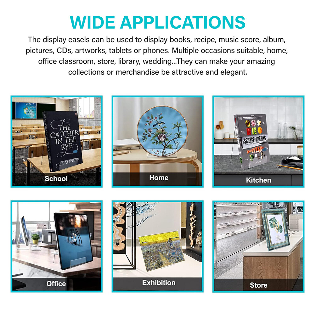 Product Description Features: FANTASTIC DESIGN: The display stand is designed perfectly for displaying and reading, the triangular structure make sure it stand steadily, while the ledge help stabilize books or other displays. The base is flat and wide enough to easily hold up to 500 pages books or less. WIDE APPLICATIONS: The display easels can be used to display books, recipe, music score, album, pictures, CDs, artworks, tablets or phones. Multiple occasions suitable, home, office classroom, store, library, wedding...They can make your amazing collections or merchandise be attractive and elegant. CRYSTAL MATERIAL: made of 100% transparent acrylic, unlike other products on amazon with translucent plastic. Durable, safe, and eye catching. Smooth surface and edge, easy to clean, lightweight. They can also be stacked together, easy to store. Specification : Material :Acrylic Size :75x90x105mm Color:clear Package included: 1 x Acrylic Book Display Stand