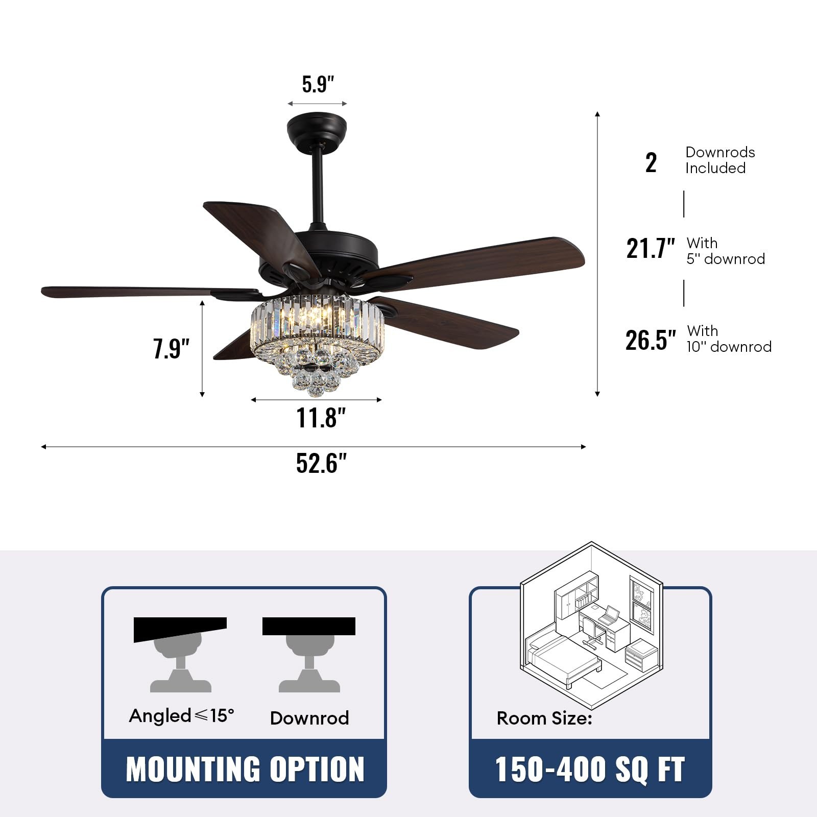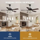 52-inch Crystal Ceiling Fan with Lights,Modern LED Fandelier with Remote Control,6-Speeds,Low Profile Flush Mount Chandelier for Living Room,Dining Room,Bedroom,Foyer Product Details Size: D52"xH22" Brand: Tinkoso MPN: TIN-LL-1028-LED-02 UPC: Does not apply EAN: Does not apply Brand: Tinkoso Color: Black Material: Crystal Style: Contemporary Light fixture form: Chandelier Product Dimensions : 52 x 52 x 21.6 inches; 26.46 Pounds Item model number : TIN-LL-1028-LED-02 Date First Available : June 9, 2025 Manufacturer : Tinkoso Customer Reviews: 4.6 4.6 out of 5 stars 41 ratings Brand: Tinkoso Color: Black Material: Crystal Style: Contemporary Light fixture form: Chandelier Room Type: Bedroom, Dining Room, Foyer Entryway, Kitchen Island Bar, Living Room Product Dimensions: 52"L x 52"W x 21.6"H Specific Uses For Product: Indoor use only Indoor/Outdoor Usage: Indoor Power Source: AC Light Source Type: Energy Efficient Shade Material: Crystal Voltage: 120 Volts Included Components: Bulb not included, Light kit inlcuded, Shade Lighting Method: Downlight Item Weight: 12 Kilograms Wattage: 40 watts Mounting Type: Monopoint with Canopy Assembly Required: Yes Manufacturer: Tinkoso Size: D52"xH22" Model Name: Crystal Ceiling Fan with Lights Part Number: TIN-LL-1028-LED-02 Item Weight: 26.4 pounds Item model number: TIN-LL-1028-LED-02 Batteries Included?: No Batteries Required?: No Bulb Features: Dimmable Date First Available: June 9, 2025 Elegant Crystal Fan & Chandelier Design Our crystal fandelier seamlessly blends a traditional ceiling fan with a luxurious chandelier. Featuring a durable silver metal frame resistant to rust, 5 sturdy wooden blades, and a sparkling crystal lampshade, this fan light combo adds elegance to any room while providing efficient airflow. The environmentally friendly materials ensure long-lasting performance and stylish appeal Reversible Motor for All Seasons This crystal ceiling fan is designed for year-round comfort with its reversible motor. Change the blade direction to suit your needs: downward airflow creates a cooling breeze in summer, while upward circulation helps distribute warm air in winter. Enjoy optimal climate control in any season with this versatile fan light combination Convenient Remote Control Operation Control your fan and light effortlessly with the included remote. Adjust between 6 wind speeds, set a 1/2/4-hour timer, and toggle the reverse function with ease. The remote allows separate control of the fan and light, providing quick and convenient operation for your daily comfort Ideal Dimensions for Multiple Spaces With a 52-inch blade span and 22-inch total height (using the 5-inch rod), this fan fits beautifully in bedrooms, living rooms, dining areas, and kitchens. The package includes two downrods (5-inch and 10-inch) for flexible installation. The 12-inch crystal lampshade adds a refined touch to your decor Reliable Support and Warranty Designed for quiet operation, this fan ensures a peaceful environment. Easy assembly is guided by clear instructions, and the product comes with a 1-year warranty on the fixture plus a lifetime warranty on the motor. For any installation needs, our customer service is ready to assist