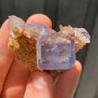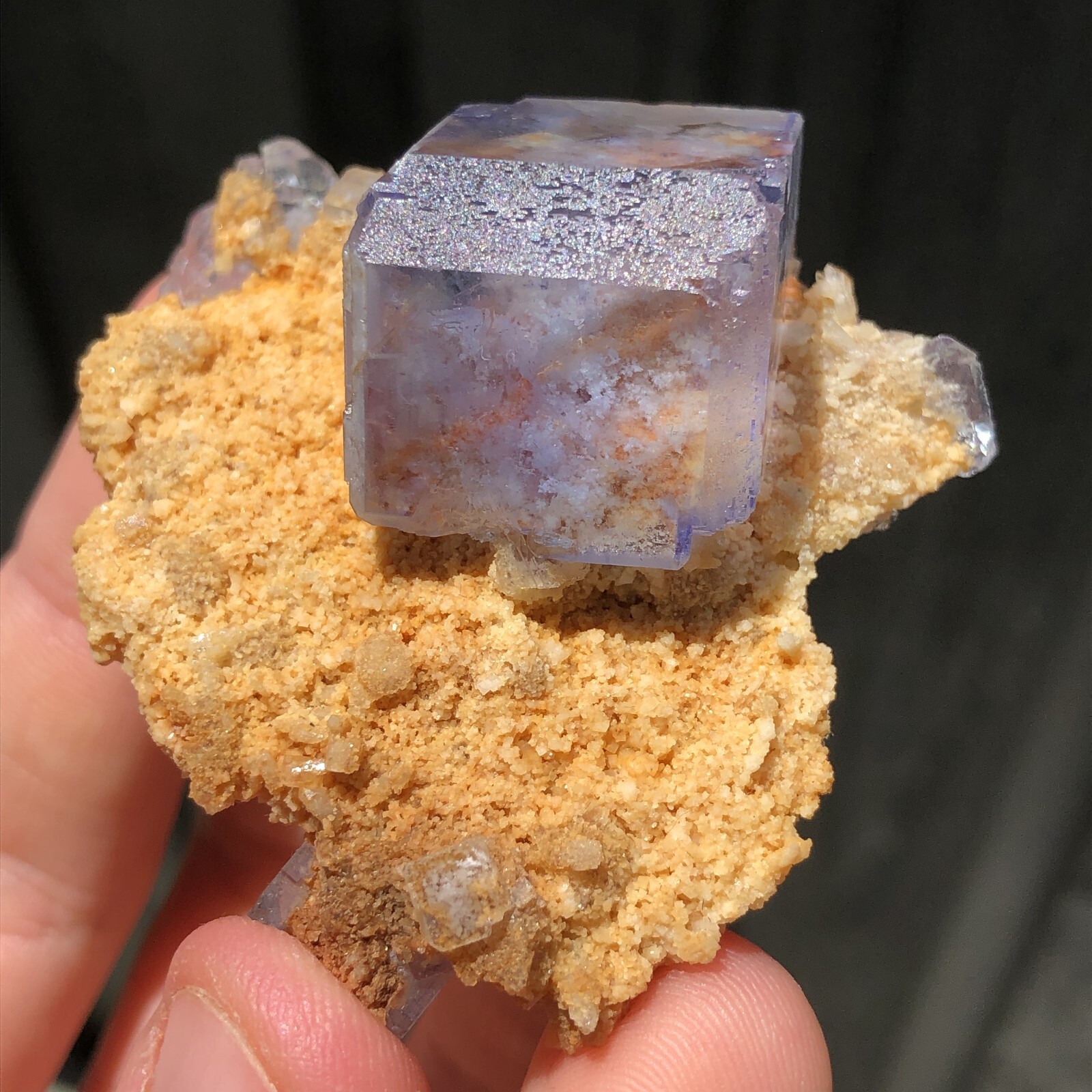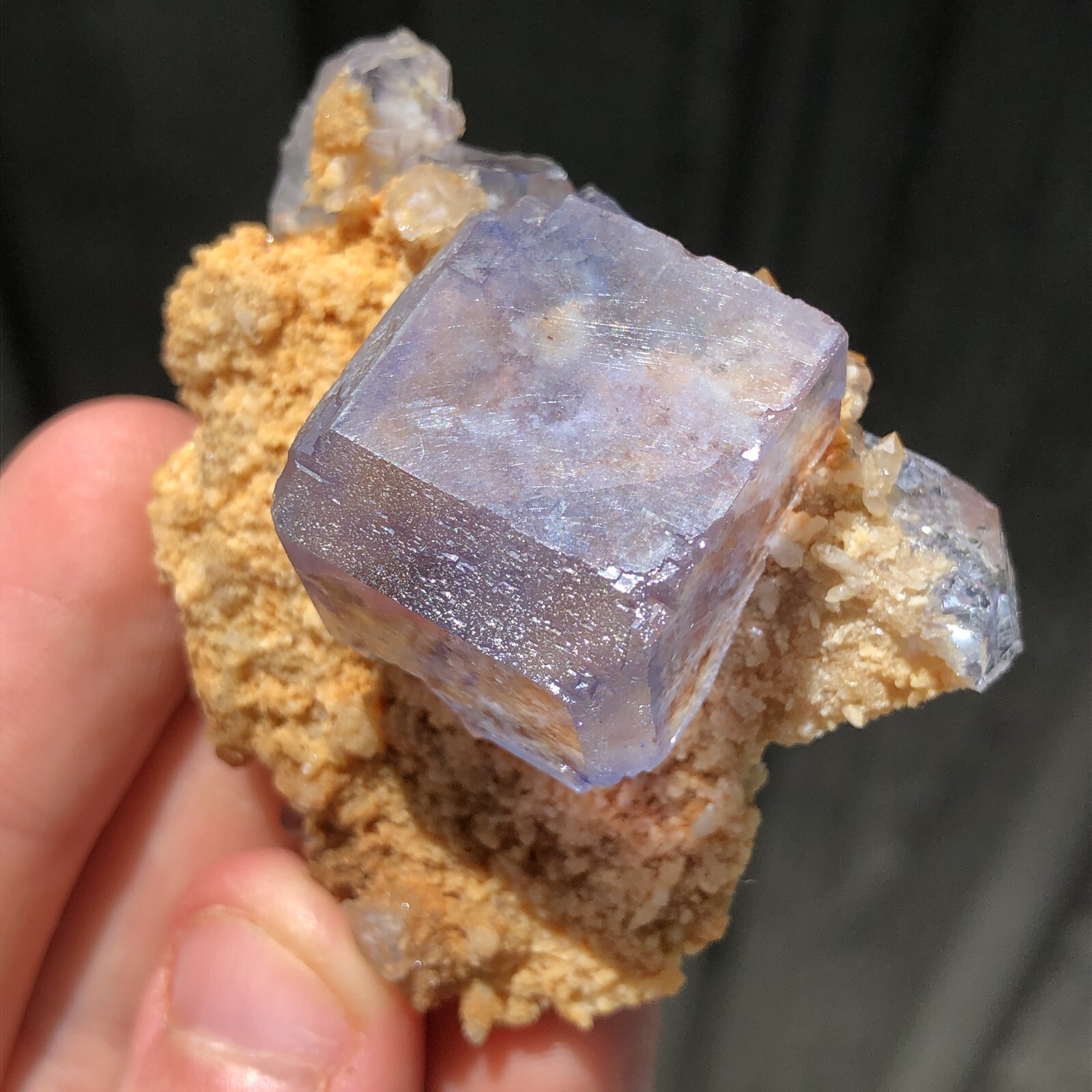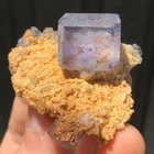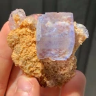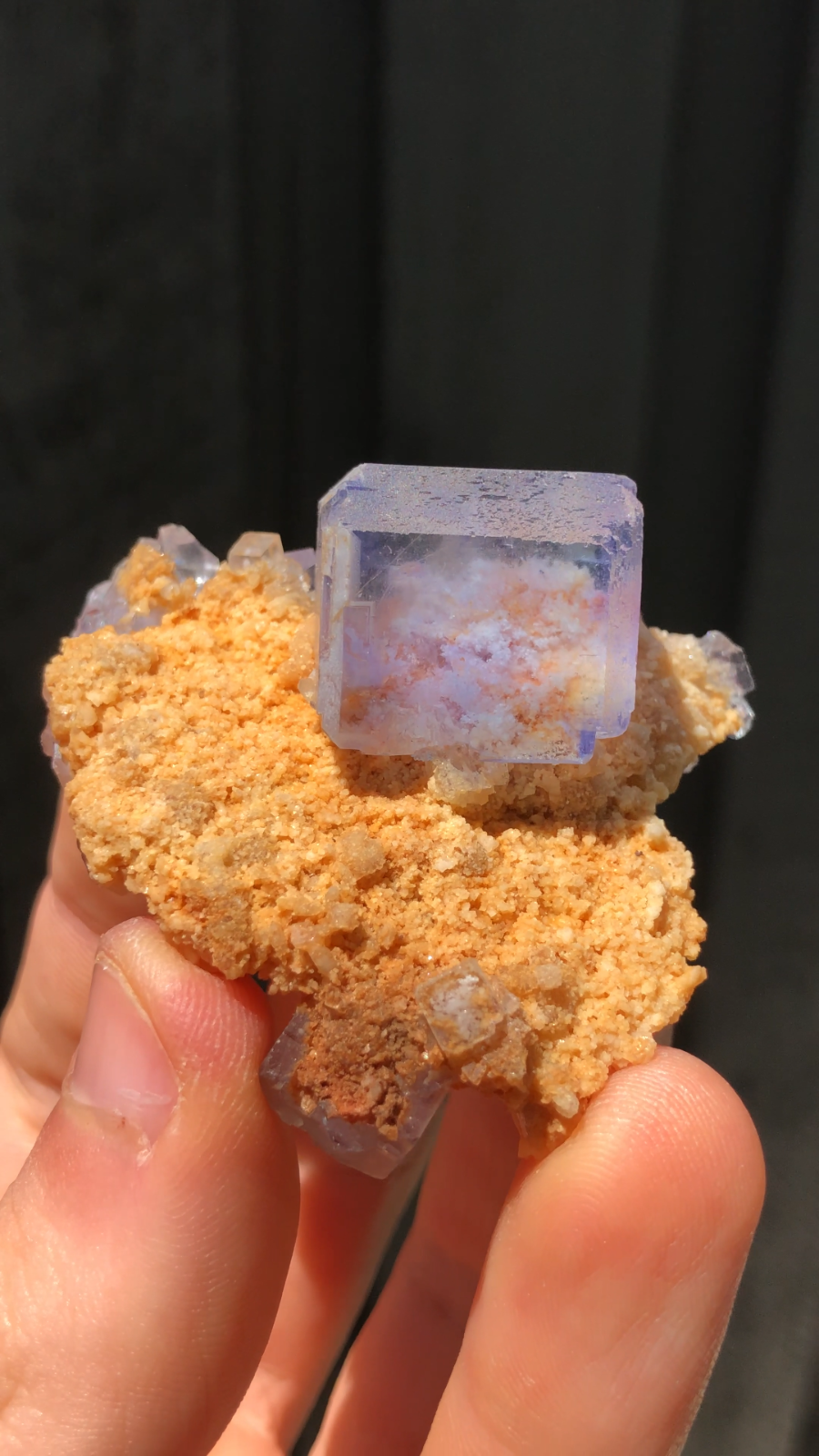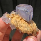 Mineral: Fluorite on Dolomite Locality: Shangbao Mine, Leiyang Co., Hengyang, Hunan, China Size: 5.6 x 5.3 x 2.9cm Weight: 59g A beautiful isolated blue fluorite crystal from the Shangbao Mine in China. For me, this specimen is super aesthetic. A limpid, completely transparent, lustrous fluorite cube has grown on contrasting golden dolomite matrix. This colour combination is unusual so far as Chinese fluorite specimens are concerned, as they typically occur on a white or clear quartz/dolomite matrix. It's like a little aquarium on matrix. In super condition all around as you can see in the video. ID: 109
