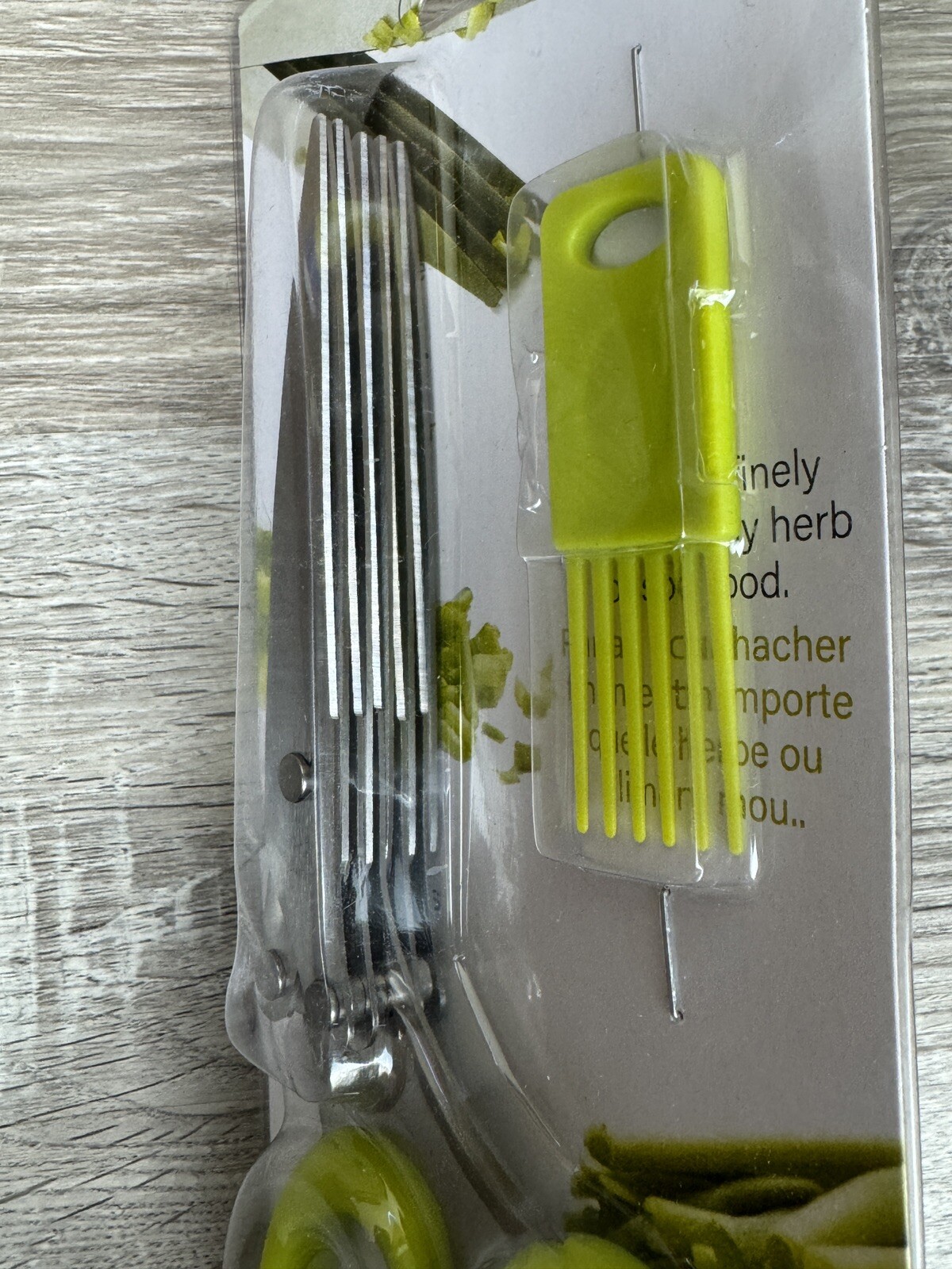 This multi-blade herb scissors set includes salad scissors, kitchen shears, and the featured herb scissors, all made of stainless steel with soft grip and non-slip thumb grip. The green-colored kitchen tool is dishwasher safe and ideal for chopping herbs and onions easily. The set comes with one item only, and it is manufactured in China.