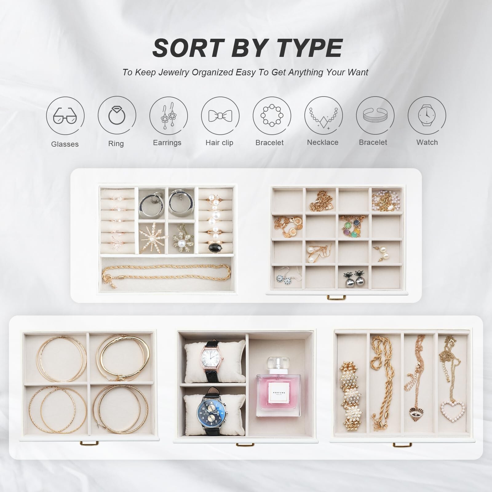Jewelry Box for Women, 5-Layer Jewelry Organizers Box, Large Jewelry Storage Box for Girls, Jewelry Holder Organizers Gift for Valentine's Day, Christmas, New Year (White) Product Details Color: White B Size: 5-Layers Brand: V-LAFUYLIFE MPN: Does not apply UPC: Does not apply EAN: Does not apply Color: White B Brand: V-LAFUYLIFE Material: Leather Style: Modern Special Feature: Dustproof, Mirror, Lock Recommended Uses For Product: Necklace, Bracelet, Ring, Watch, Earring Product Dimensions: 6.6"D x 10.1"W x 9.1"H Target Audience: Women, Girls Shape: Rectangular Occasion: Mother's Day, Christmas, New Year, Birthday, Valentine's Day Item Weight: 5.91 Pounds Item Dimensions D x W x H: 6.6"D x 10.1"W x 9.1"H Manufacturer: V-LAFUYLIFE Brand Name: V-LAFUYLIFE Recommended Uses For Product: Necklace, Bracelet, Ring, Watch, Earring Target Audience: Women, Girls Shape: Rectangular Occasion: Mother's Day, Christmas, New Year, Birthday, Valentine's Day Style: Modern Color: White B Inner Material: Leather, Metal Material: Leather Number of Compartments: 7 Number of Drawers: 4 Number of Items: 1 Jewelry Storage Type: Jewelry Box Mounting Type: Table Top Closure Type: Lock Special Features: Dustproof, Mirror, Lock LARGE CAPACITY - V-LAFUYLIFE jewelry box has ample storage space. It can meet the storage needs of various jewelry such as bracelets, necklaces, rings, earrings, and earrings. Each side has 4 necklace hooks and 2 pockets. Large jewelry storage makes your jewelry more organized. EXCELLENT QUALITY - Durable jewelry organizer box made of sturdy structure and high-quality materials. The large jewelry organizer is made of premium engineered wood it is not easy to deform. Wrapped by the excellent PU leather makes the box more durable and easy to clean. Premium imitation fur inner lining can protect your beloved jewelry from scratches and damage. STYLISH APPEARANCE - Large jewelry organizers and storage with an elegant and stylish appearance. It comes with a handle on the top. Each drawer has a metal handle which is convenient to use. INTIMATE DESIGN -The Jewelry Organizers' double-door design on both sides makes better use of the storage space. There are four layers of drawers on the front, which not only take into account the appearance but also make the jewelry storage box have a larger capacity. HOLIDAY GIFTS - Whether it's for a friend or your loved one, this jewelry organizer box will make an unforgettable memory on any holiday - Weddings, Birthdays, New Year, Valentine's Day, Thanksgiving Day, and Christmas.