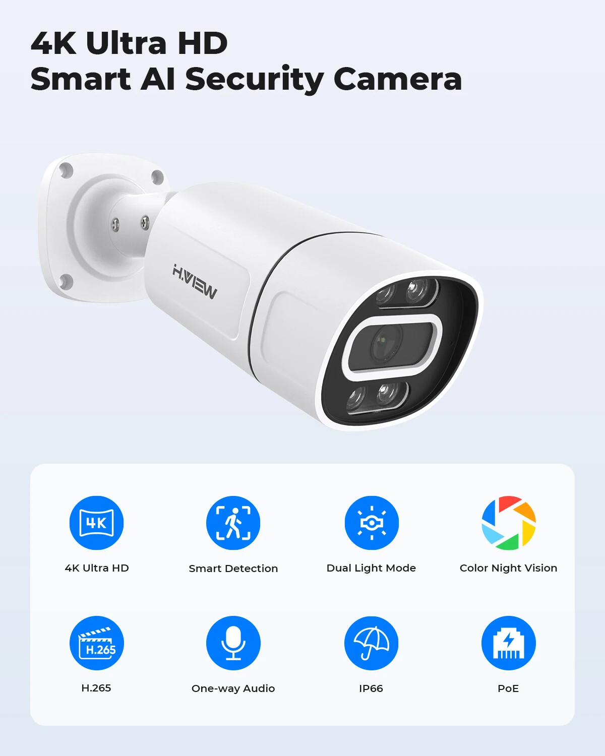5MP/8MP 4K Spotlight Security Camera with Smart AI Detection 4K Ultra HD, Better in Details 4K Ultra HD Resolution Show Higher-Quality Images, for both day and night vision, you can get exactly the details you need. Support Face Detection Detect and record faces without missing every detail. This function only supports H.VIEW PoE NVR with face detection. Light Alarm when Person Detection is Triggered Once an intruder is detected, the camera's spotlight will be triggered to warn potential criminals. And push alarms to your mobile device and email. Clear Night Vision with Color Night vision has been greatly improved with eight powerful spotlights and infrared LEDs. You can view clear details in full color and get your home well protected day and night. Customizable Motion Detection Events You can create a variety of motion detection settings for the camera, including Person detection, line crossing detection, intrusion detection and area-specific detection. Avoid 99.5% False Alarm AI Person Detection is Different from traditional PIR or motion detection. Built-in updated sensor will only detect human movement, won't be triggered by leaves, animals or insects. Easy Plug-and-Play connection, one Way Audio With a Plug-and-Play reliable connection, this PoE camera uses a single Ethernet cable to transmit both data and power. With the built-in microphone, it can make preview and playback with sounds. When you use the camera alone, please refer to the following link https://drive.google.com/file/d/10QIoRpBdKwBTitHOLqK_ZkeI-49oRvU2/view?usp=drive_link More video, Less storage H.VIEW H.265 compression reduces storage and bandwidth by up to 50% over traditional H.264 compression. Ready for Anywhere, Indoor and Outdoor Outdoor and indoor ip camera with an IP66 waterproof rating. So you can feel free to install it outdoor, like in your garage, backyard, or anywhere else. It can stand harsh weather conditions, including rain, snow, intense cold and heat. Remote Access Anytime, Anywhere Support multiple online viewing, No matter where you are, you can Through mobile APP remotely access the camera to see. Specifications What's in the box?