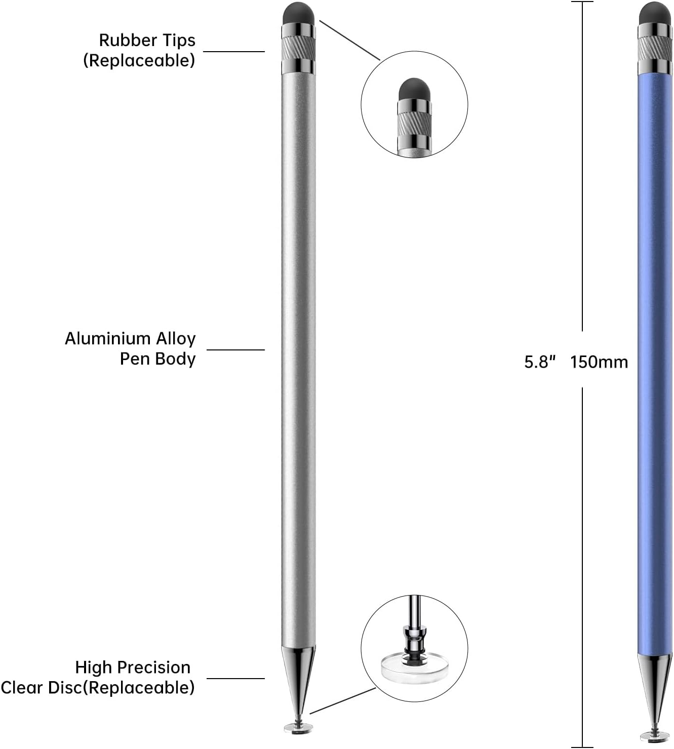 【Stylus for Touch Screen】: This stylus can be used on all touch screens, designed to replace your fingers, the stylus can free up your fingers and provide higher sensitivity and response on the screen. 【2-in-1 Stylus Pen】: Tablet pen for touch screen, made of lightweight alloy, no need for Bluetooth connection or charging, ready to use after opening the package, comfortable in hand, sturdy, durable and anti-aging, so you can use it anytime, anywhere Easily capture inspiration and make everything feel like writing on paper, giving you a more accurate writing/drawing/touching experience. 【High Accuracy and High Sensitivity】: The stylus adopts a flexible transparent disc tip that can flexibly fit on the screen without leaving disconnected lines on your tablet or phone, providing better flexibility and accuracy, Allowing you to see exactly where the mark is and giving an accurate point, while the rubber tip and disc tip can give you two different touch experiences. 【Compatibility and multi-purpose】: Universal stylus, suitable for touch screen devices (Apple, Samsung, Moto, Lenovo, Xiaomi, etc., and also compatible with major operating systems, such as: Google, Android, Microsoft, etc.), you can use it like a real You can use our stylus to write on drawing applications, take notes, read news, play games, etc., just like any other touch screen device. 【What you get】 You get 5 different colored stylus pens and a portable replacement set of 5 rubber nibs and 3 clear nibs in one package. Product Description The video showcases the product in use. The video guides you through product setup. The video compares multiple products. The video shows the product being unpacked. Extensive Compatibility, Works Just As Well As a Real Pencil! 2 Different Precision Pen Tips,2 Different Writing Experiences 1 Drawing 2 Note-Taking 3 Commercial Affairs 4 Play Games 5 Editing Video BOPOMOFO Other Product Portfolio Add to Cart Add to Cart Add to Cart Add to Cart Add to Cart Customer Reviews 4.5 out of 5 stars 3,712 4.4 out of 5 stars 5,741 4.4 out of 5 stars 5,741 4.4 out of 5 stars 5,741 4.5 out of 5 stars 3,712 Price $9.99 $ 9 . 99 $6.99 $ 6 . 99 $7.99 $ 7 . 99 $12.99 $ 12 . 99 $11.99 $ 11 . 99 Compatible Range All Touch Screens All Touch Screens All Touch Screens All Touch Screens All Touch Screens Color Silver/Blue/Gold/White/Black Purple/Pink Blue/Purple/Pink Pink/Yellow/Green/Blue/Purple Pink/Yellow/Green/Blue/Purple Material Aluminum Aluminum Aluminum Aluminum Aluminum Battery Required? No No No No No Bluetooth Requires? No No No No No