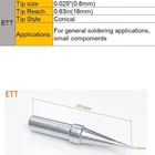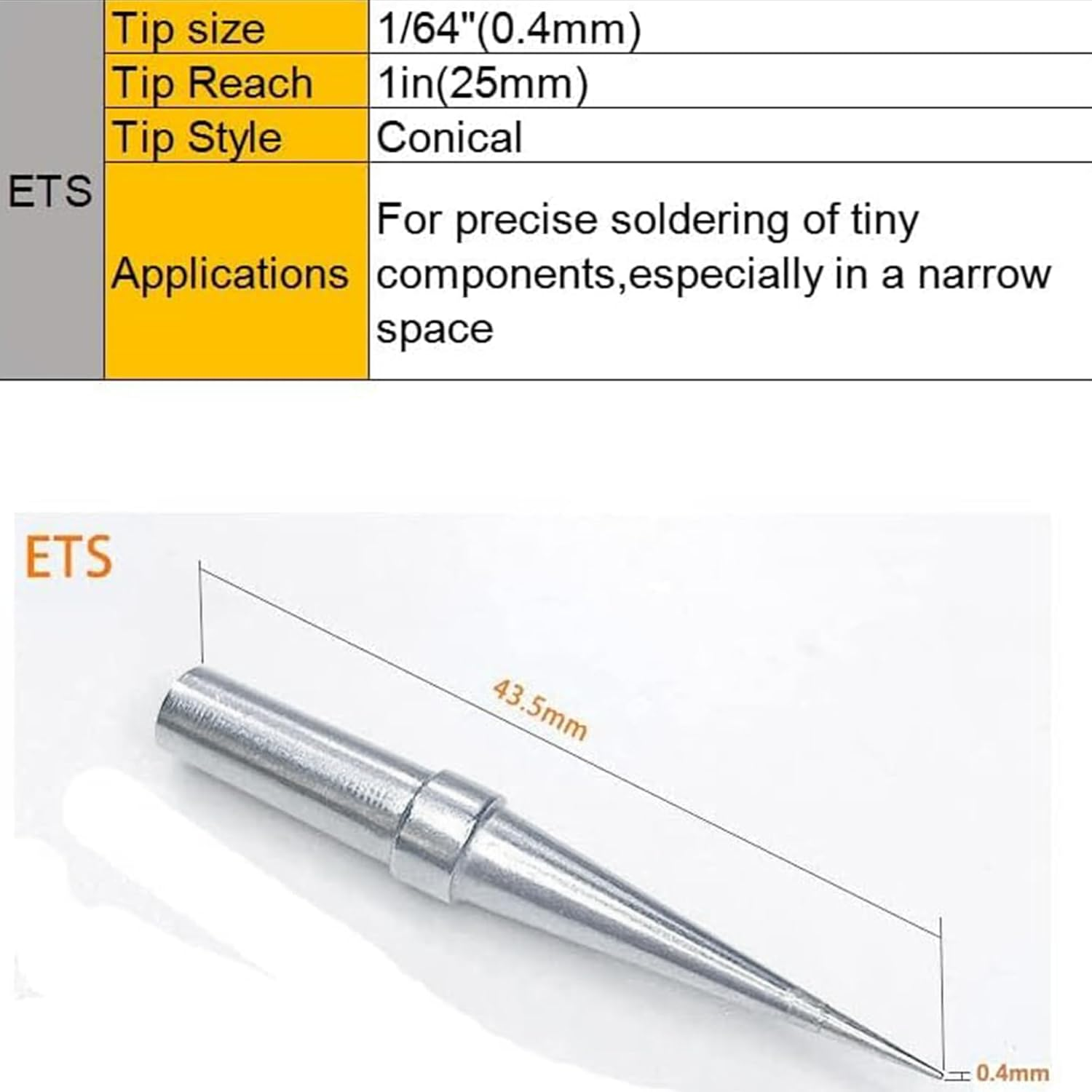 Fit solder stations weller WESD51 WES51 WES50 WE1010NA Fit soldering irons PES51 PES50 WEP70 EC1201A Come with 5 different tip sizes and shapes,satisfy most of the soldering work. Products include:1 X Long Conica Tip Size 1/64”(0.4mm) ETS, 1 X Round Tip Size 1/42”(0.6mm) ETT,1 X Chisel Tip size 0.062”(1.6mm) ETA, 1 X Chisel Tip Size 0.093”(2.4mm) ETB, 1 X Chisel Tip Size 0.187"(4.8mm) ETD Made of high quality material,good replacement tips for weller ET tip, lasts a long life at any time if you are not satisfied with our tips, please contact us,we will offer a refund Product Description ET Tip Set 5pcs Structure of a Willdone ET Soldering Tip This tip set consist of 5pcs tips of different sizes and shapes. · 1 X Long Conica Tip Size 1/64”(0.4mm) ETS, Applications: For precise soldering of tiny components,especially in a narrow space · 1 X Round Tip Size 1/42”(0.6mm) ETT, Applications: For general soldering applications, small compoments · 1 X Chisel Tip size 0.062”(1.6mm) ETA, Applications: For general soldering work · 1 X Chisel Tip Size 0.093”(2.4mm) ETB, Applications: For general soldering work · 1 X Chisel Tip Size 0.187"(4.8mm) ETD, Applications: Transfer substantial heat, suit for soldering wires, big connectorsand pads,solar celll