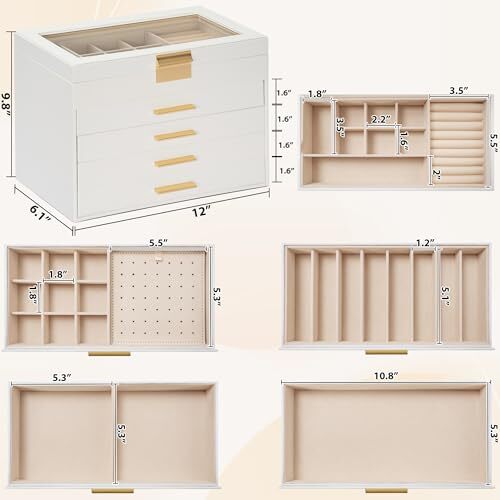 Return Policy Fast Delivery Trusted seller 5-Tier Jewelry Box with Clear Glass Lid Functional Leather Jewelry Storage Organizer Case 4 Drawers for Women Girls Necklace Ring Bracelet Earring Product Description 【Clear Window on the top】Attractive appearance with Clear Glass Lid, leather surface and soft velvet lining. You can quickly find the jewelry you need through transparent glass, and this design is dust-proof 【Various Sizes and Colors】Sturdy construction and elegant quality material make it very durable. The jewelry holder can store a lot of jewelry accessories, such as rings, earrings, necklaces, chains, bracelets, and so on. It can tidy your table and protect your precious jewelry for a very long time 【5 LAYERS with 4 Drawers】 Dimension:W11.8"x D6.1"x H9.6". The top layer is a ring layer and 8 slots,Drawer 1 have 9 equal size slots and removable earring board ,Drawer 2 have 8 equal rectangle size slots, Drawer 3 is a big slot,Drawer 4 has one compartment. Large capacity So that you can keep your jewelry and or other small accessories flexibly 【Modern Design】 Jewelry Organizer is Ideal choice for Valentine's Day, Mother’s Day, Thanksgiving Day, Christmas, Birthday and Wedding. Suit for Mother, Girlfriend, Wife, Daughter and So On 【Stylish Decoration】The charming appearance and color combination can become a highlight of your home and decorate your home with warmth Shipping Returns Payment Shipping Shipping is FREE to all addresses other than APO/PO boxes in the lower 48 states. All our stock ships from US-based warehouses. Shipped via USPS or UPS (depending on location and package weight) Unless stated otherwise, all orders will ship within 24-72 hours of your payment being processed. Check our feedback to see the great reviews of FAST shipping we offer. Returns Seller does not accept returns Payment We currently accept payment via eBay managed payments only. Once payment is cleared, we will dispatch your shipment within 1-3 business days. Please refer to the "Shipping" tab for more information regarding shipping speed to your destination.