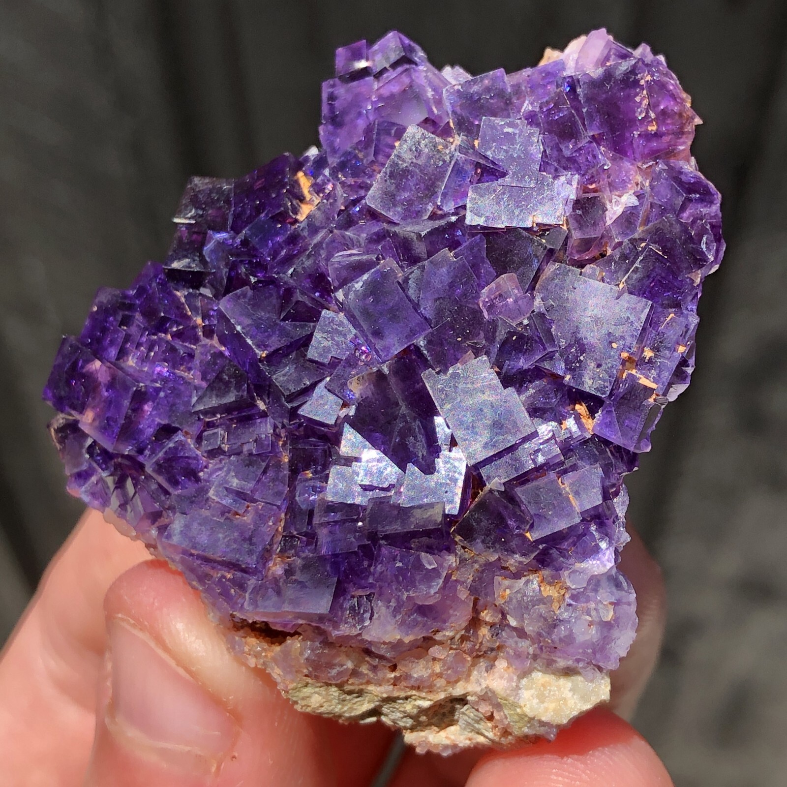 Mineral: Fluorite Locality: Berbes, Berbes mining area, Ribadesella, Asturias, Spain Measurements: 5.0cm x 4.3cm x 2.2cm Weight: 58g Classic purple fluorite from Spain. The crystals are deep-grape purple without being too dark to appear black. The crystals have nice lustre and there is a tiny portion of matrix at the base. ID: 439.05