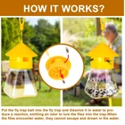 Instructions 1. Unscrew the fly trap lid. 2. Take 1 packet of fly trap and pour it into the bottle, add 1/3 of the bottle with warm water, and screw on the lid. 3. Use a silicone rope to hang the device in an area where flies are concentrated. Fly Trap : Usage Time: About 20 days /1 packet : Replace the trap every 20 days 6 Pack Refill for Reusable Outdoor Fly Traps Usage Time: About 20 days /1 packet,Replace the trap every 20 days Catches all common flies: house fly, mosquito fly, blow fly, stable fly and so on.