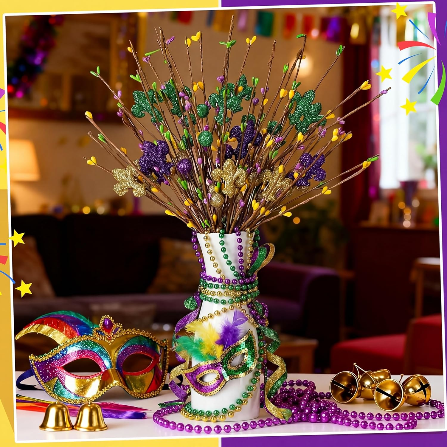 6 Pcs Mardi Gras Centerpiece Table Decor 16.5" Mardi Gras Glitter Table Picks Meet Your Party Decoration Needs: you will receive 6 Mardi Gras glitter table picks, each featuring a gold, green, and purple color scheme and various Mardi Gras elements; The vibrant decorative effect and ample quantity will easily satisfy all your Mardi Gras party decoration needs Ideal Size: the Mardi Gras centerpiece table decor measures approximately 16.5 inches long, making it the ideal size for vase decoration; You can also cut or bend the stem to adjust the length for optimal display Made of Materials: Mardi Gras centerpiece sticks are made of plastic stems and foam balls, and are covered in beautiful glitter; They're lightweight yet durable, offering reliable performance and reusability, creating a warm and festive atmosphere in any room for years to come Inspiring Creativity: these Mardi Gras purple, gold, and green tree topper picks are a versatile addition to your Mardi Gras decor; Whether use in flower arrangements, table centerpieces, or placed on a mantel, their dazzling shimmering effect will enhance any occasion Versatile Applications: crafted with materials, these Mardi Gras flower branches are suitable for a variety of crafting ideas; Use them to fill vases, create attractive flower arrangements, and create wreaths and garlands; They're also ideal for display or party venues, adding a touch of sparkle to any Mardi Gras celebration centerpiece, mantel, or doorway Features: Ideal for both holidays and everyday occasions: Our Mardi Gras branches tree decoration is suitable for holiday occasions like Mardi Gras, but it also works well in everyday home decor. Use it in a vase to enhance any space, as part of a holiday themed decoration, or combine it with other craft projects to add a charming touch to any holiday or event. Highly compatible with decorations: Measuring approximately 16.5 inches, this Mardi Gras branches tree decoration is adaptable to a variety of decorating needs, making it large enough to stand out in any space. Its classic design of irises and berries makes it easily integrated into a variety of Mardi Gras decor styles, enhancing the overall coordination and beauty of your overall decor. Specifications: Material: plastic and foam balls Color: purple, gold, and green Size: about 16.5 inches/ 42 cm Package includes: 6 x Mardi Gras tree topper picks Notes: Manual measurement, please allow slight errors on size. The color may exist a slight difference due to different screen displays Item model number LAY--4252 Item Package Quantity 6 Number of Items 6 Color Purple, Gold, and Green Item Weight 9.6 ounces Package Information Vase Product Dimensions 16.85"D x 3.15"W x 3.15"H Complimentary Shipping and Easy Returns Need to return something? Enjoy our 30-day hassle-free return policy! Take advantage of free shipping across all 48 contiguous states! Your order will be dispatched within 1-2 business days once payment is confirmed. Your Opinion Matters! Your happiness is our main goal! We welcome your feedback! If you encounter any problems, reach out to us right away, and we’ll be here to help. Explore the Extraordinary! Our collection showcases fascinating products that are sure to capture your attention. What surprises await you? Delve in and discover unique items that enrich your daily life. Don't miss the amazing things we have in store for you!