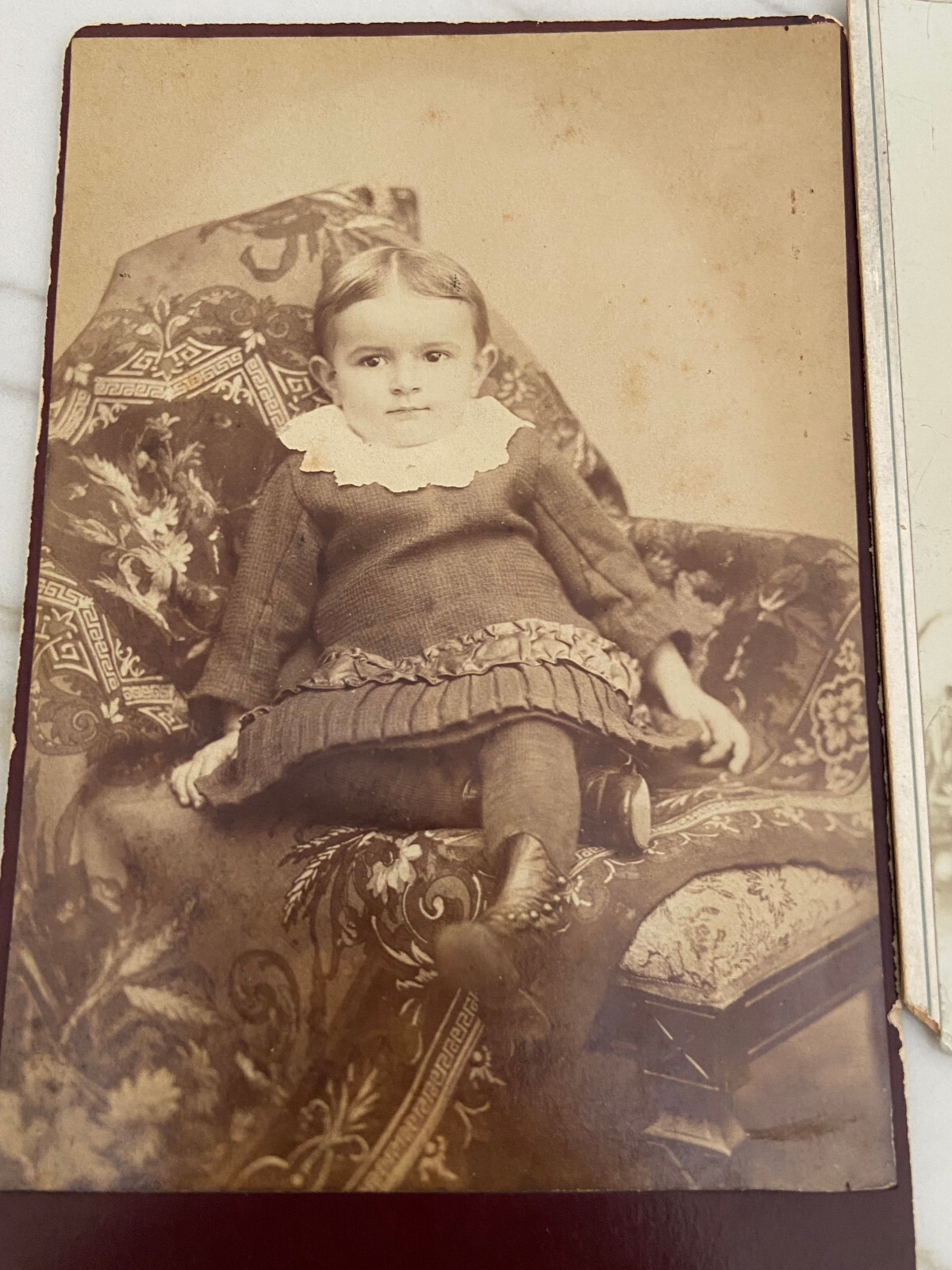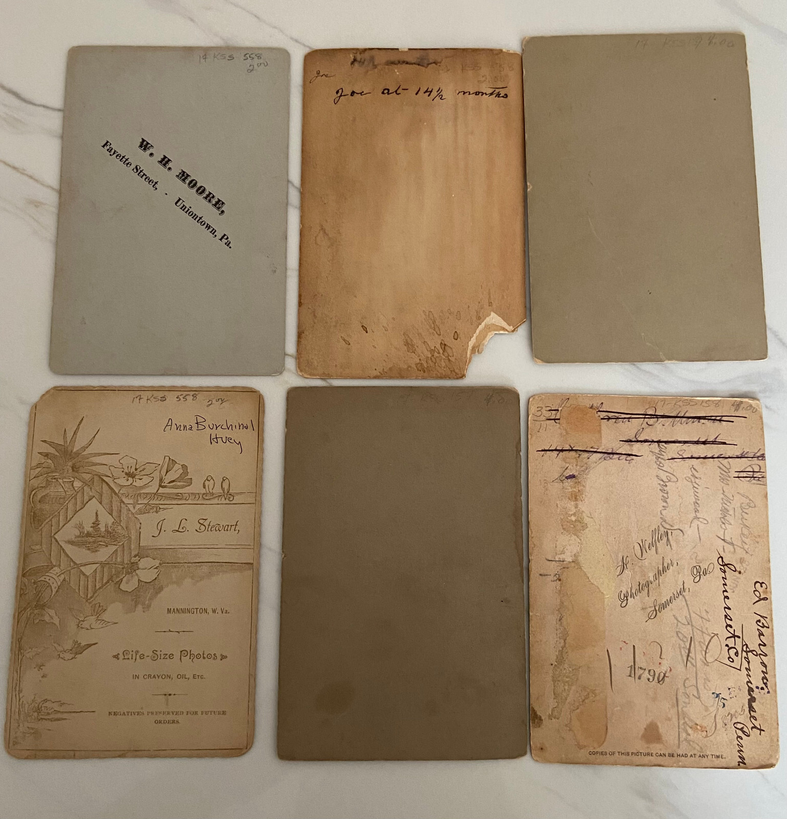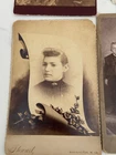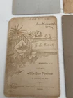 Cabinet cards are photographs mounted on stiff pieces of cardboard. They were introduced in the 1860s. The front of the card is usually printed or embossed with the photographer’s details, and the back of the cabinet card is often printed with elaborate designs. The popularity of the cabinet card waned around the turn of the century, particularly after the introduction of the photographic postcard, but they were still being produced right until the First World War. The color of the cardboard mount can also help date the photograph. Cream mounts were always popular, but bolder, dark colors like black, dark brown, green or burgundy began to appear in the 1880s and 1890s. All in really good shape except for the CC Hough photograph of an infant - it has damage to lower left corner.