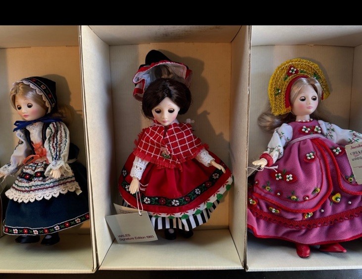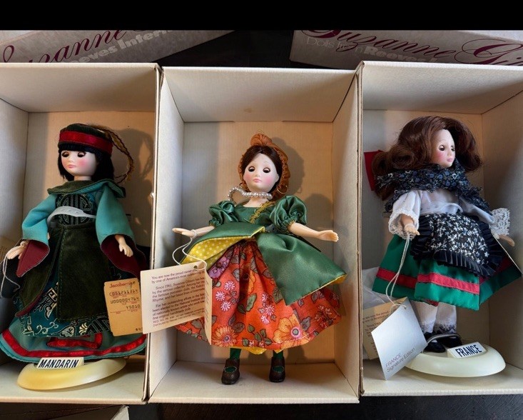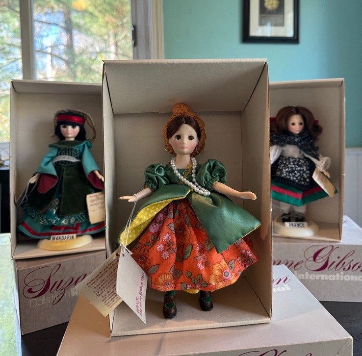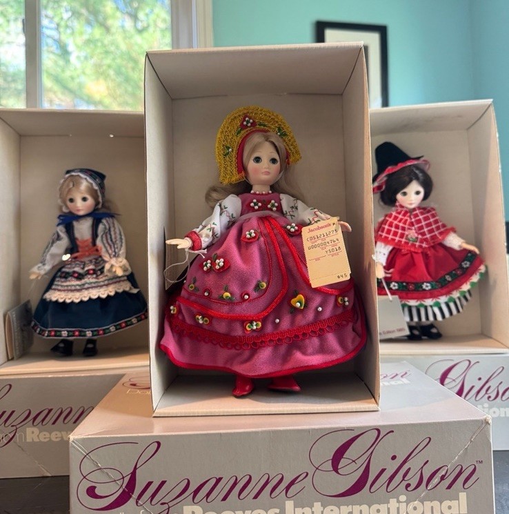 The product is a set of 6 vintage Suzanne Gibson International dolls from the 1980s. These vinyl dolls have straight hair and light complexion, representing the Gibson Girl franchise. Each doll is part of the original set and is designed for adult collectors. The dolls are perfect for all occasions and are a nostalgic addition to any doll playset collection.