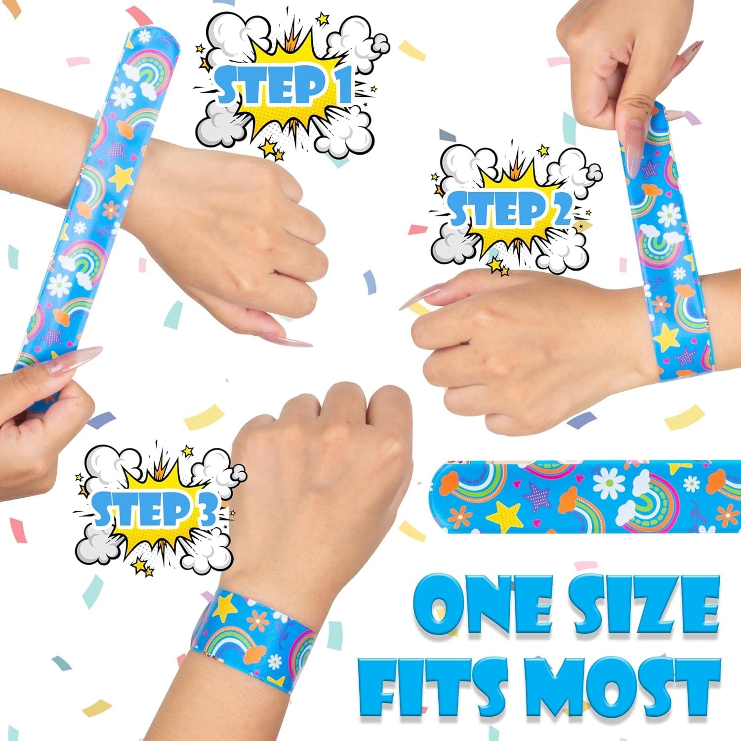 Diverse Designs for Every Taste: With 60 slap wristbands in 30 unique styles such as tie-dye, mermaids, dinosaurs, and galaxies, there's a design to suit every preference. Perfect for meeting the demands of a large group. Child-friendly and Safe: Covered in soft PVC, these slap bracelets are comfortable and safe for children to wear. Meeting U.S. toy safety standards, they are skin-friendly, non-toxic, and feature sewn edges with no metal exposure. Rest assured, they are 100% child-safe and approved through rigorous safety testing. Ideal for Parties and Gifting: Stuck on what to give for a birthday or classroom gift exchange? Look no further! Our unisex slap bracelets make perfect party favors and gifts, with 24 different designs ensuring there's a favorite for every child, whether boy or girl. Efficient and Secure Functionality: Tired of flimsy slap bracelets that don't stay in place? Our products are the solution! Through significant investment in research and development, our slap wristbands seamlessly form a perfect circle on your wrist in an instant. Firm, secure, and guaranteed not to fall off or cause any discomfort. Versatile and Multi-purpose: These high-quality slap wristbands are not just for parties but also suitable for kids' party favors, goodie bag fillers, class rewards, office parties, Valentine's Day exchanges, crafting tables, or themed parties. A must-have for any occasion!