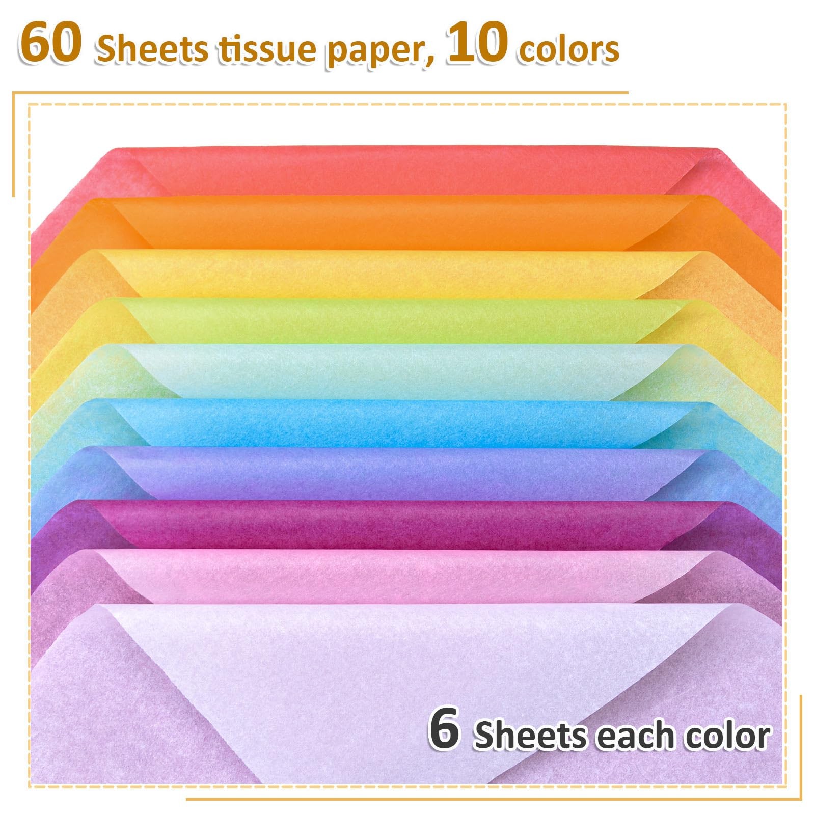 ✨ Key Features LARGE SHEETS: Each sheet measures 14" x 20" providing generous coverage for boxes, bags, bouquets and more BRIGHT COLORS: colored tissue paper comes in a vibrant rainbow of 10 classic colors for all your crafting and gift wrapping needs HIGH QUANTITY: Pack contains 60 sheets of tissue paper, offering excellent value and enough to complete numerous projects DURABLE YET DELICATE: Tissue paper is thin yet sturdy, crumpling nicely for filling while also being gentle enough to tuck into gifts VERSATILE USES: Use tissue paper for decorating, filling, layering, crumpling, twisting, folding or any other creative way to dress up gifts and crafts Shipping Standard Shipping (1–5 business days) ⏱ Handling time: 1–2 business days ❌ No shipping to Alaska/Hawaii, APO/FPO, or U.S. Protectorates No international shipping ↩️ Return Returns accepted within 30 days of purchase Buyer pays return shipping ✅ Refund method: Money back Payment We accept secure payment methods such as PayPal, credit/debit cards, and more Contact Us ❓ If you have any questions, please contact us via eBay. We respond within 24 hours on business days. Thank you for shopping at TEVA SHOP!