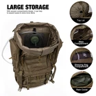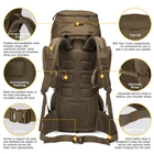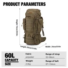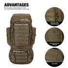 Description Tactical Backpack Military Backpack Internal Frame Molle Backpack with Rain Cover for Camping Hiking Trekking Traveling Product Fetures: Modular lightweight load carrying equipment cover all around the pack,you can hang your sleeping bag,sleeping met,hammock,tent or other camping gears. Patch Area for nametape and flag patches . Hiking Pole Attachment can hold hiking poles, ice ax or selfie stick. A zipped pocket on the top of the pack, perfect for your rain cover (included). Hydration System Compatible.The elastic compartment that is also suitable for a 15.6" laptop and big enough for a 2.5 Liters hydration bladder or other items that require quick access. Product Parameters Fabric:600D Polyester Washing &Maintenance Suggestion 1. 600D polyester fabric. Please do not wash with liquid detergent or bleach. 2. Clean with wet cloth if necessary. 3. Air dry. 4. Please do not iron it. Package 1 X Tactical Backpack Durable Material:This 60L backpack is made of 600D Polyester and includes a RAIN COVER,the buckle and zipper are all made of YKK Design:One front pocket,9.45*13in, and Two side pockets,5.5*10.6in,on the pack, it can hold snacks,flashlight,notebook,gloves,ropes,water bottle and other items,Other tactical pouches or camping gears also can be attached to the molle webbing with hooks Sleeping bag compartment:There's zipper divider inside the pack that can seperate the main compartment from sleeping compartment,It's roomy enough for you to put in sleeping bag,mat,hammock or shoes Hydration Compartment:This backpack includes hydration compartment which can hold a 3 Liter hydration bladder or a 15.6" laptop Suits:This backpack can meet size requirements for most airlines and very well used in hiking,trekking,camping,climbing,traveling