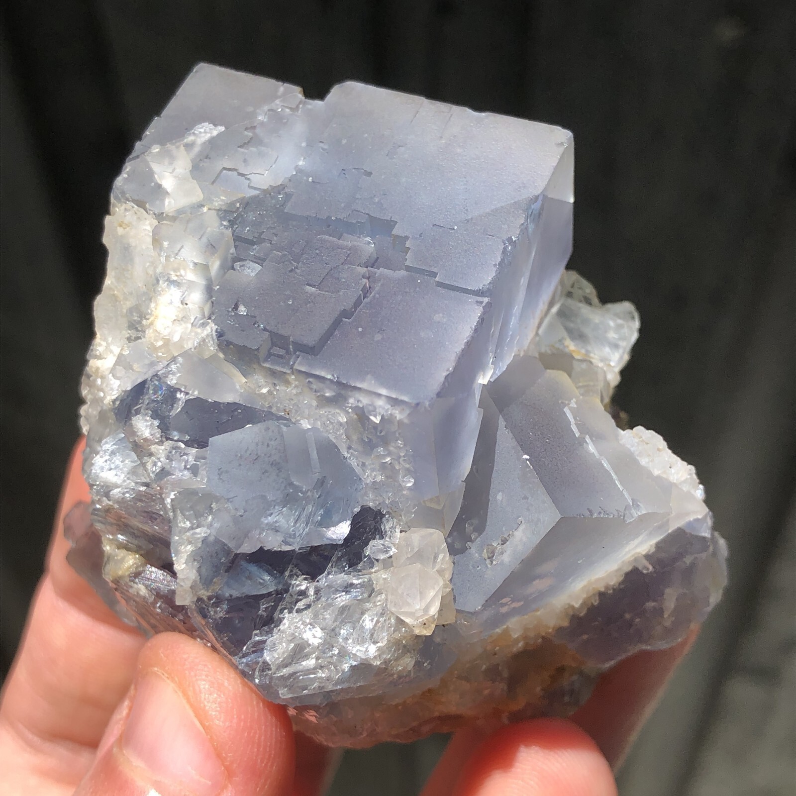 Mineral: Fluorite with Quartz Locality: Mont-Roc Mine, Mont-Roc, Castres, Tarn, Occitanie, France Measurements: 6.1cm x 6.0cm x 4.6cm Weight: 237g A cluster of pale, denim-blue fluorite cubes from the Montroc Mine in France. Please note this specimen is NOT from the more common French specimen-producing localities such as La Barre or Le Beix. Pieces from this locality come to market at a much lower rate than the previously mentioned French fluorite-producing localities. In fact, there are only 19 photos of fluorites from this locality listed on Mindat. The crystals are relatively large and uniquely denim-blue with slightly purple cores. There is a second generation of small white quartz crystals for accent. I acquired this specimen directly from a French collector. ID: 428