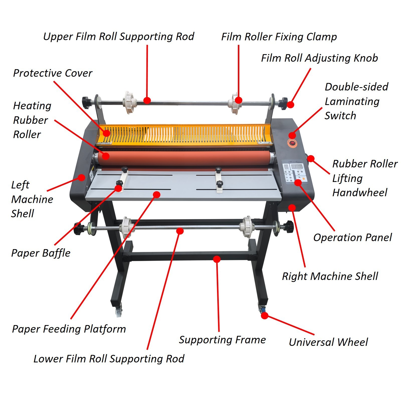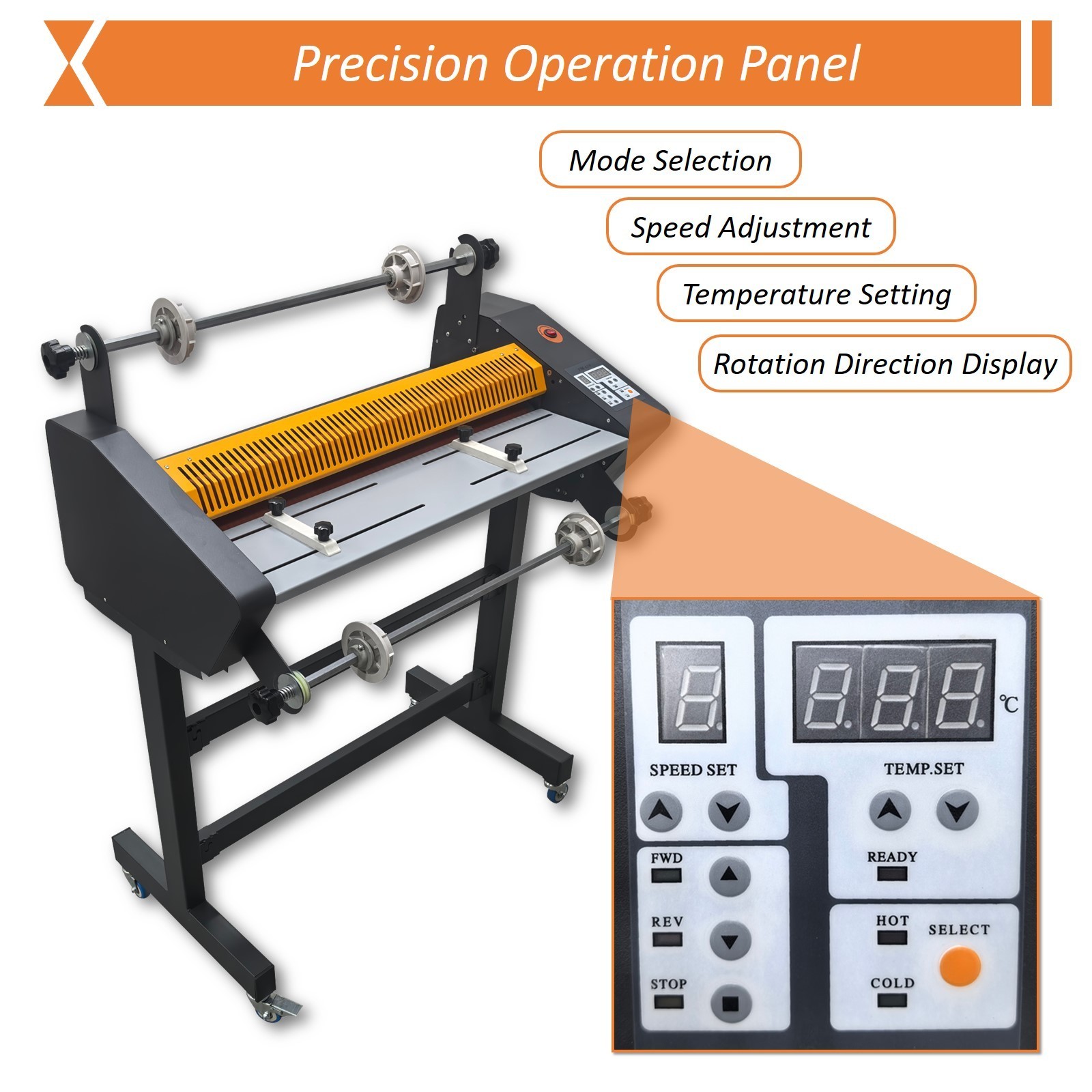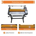 PreAsion® 635MM/ 25'' Electric Cold and Hot Laminator Thermal Laminating Machine 110V Double-sided Product Overview: The double-sided laminator is a professional multifunctional laminating machine specifically designed for cold and heat laminating operation. The laminating machine has a double-sided heating function, thereby greatly shortening the laminating time, remarkably improving the working efficiency and thoroughly solving the crimp problem of conventional single-sided laminating operation. The laminating machine has the efficient heat laminating capacity and the lossless cold laminating capacity, so it is an ideal choice for professional users pursuing high efficiency, high quality and operating diversity and individual uses with high requirements. Product Parameters: Model FM-650 Maximum laminating width 635mm (25'') Maximum laminating thickness 5mm (0.2'') Maximum laminating speed 3000mm/min Maximum laminating temperature 170˚C Power supply 110V/60Hz Power 1600W Motor power 30W Machine size 86x50x108cm (33.86''x19.69''x42.52'') Net weight 59kg (130LB) Number of rubber rollers 4pcs Diameter of heating rubber roller 55mm (2.17'') Diameter of discharging rubber roller 45mm 45mm (1.77'') Specification of film core 1'' and 3'' Attention: 1. Keep hands, long hair, loose clothing and articles like ties or necklaces away from the rollers to avoid entanglement and scalds. 2. Be sure to close the protective cover before the machine works. 3. Do not touch the cover, heating rollers and heating parts while the machine is working, so as to avoid accidents and scalds. 4. Never use any abrasive or sharp metal material to rub the roller, because it may damage the rubber roller surface. Product Features: The precision operation panel is adopted to achieve intelligent control, button operation and digital display, the speed setting, temperature setting, rotation direction selection and laminating mode selection are combined into a whole, ensuring the temperature and speed can be freely adjusted, the advance/retreat/stop can be easily controlled, and the cold laminating mode and heat laminating mode can be freely selected to meet various laminating requirements. The four rubber rollers are made of thickened high-quality rubber, have smooth and flat appearances and high laminating performance. The rubber rollers are firm and durable, and are not prone to deformation after long-term use. The advanced rubber roller interior heating technology is used, so the rubber rollers are resistant to high temperature, and the heating efficiency is greatly improved. The laminating machine is equipped with a hollowed protective cover, achieving safety protection and good heat dissipation. By means of the hollowed design, the operator can observe the laminating condition at any time, hands can be prevented from being pinched and scalded by the heating rubber rollers. The protective cover can be opened and closed effortlessly, so it is convenient and practical. The paper baffles on the two sides can effectively limit and position the materials in the laminating process, ensuring paper feeding is stable and free of deviation. The paper baffles can be easily moved and fixed in the holes to adapt to different material specifications and sizes, so the practicability and adaptability are greatly enhanced, and the smooth laminating operation can be well guaranteed. The double-sided laminating switch is designed for control over the double-sided laminating operation. Lamination of the obverse side and reverse side can be accomplished at the same time through one-time feeding, so the laminating efficiency is greatly improved, the degree of automation is higher, the uniform heat and pressure are provided to ensure the stress balance, and the quality and consistency of finished products are improved. The rubber rollers can be controlled by the handwheel to be easily lifted and pressed in the working process, so the operating safety and convenience are effectively improved, and the laminating quality and consistency are greatly enhanced. The handwheel is simple in structure, low in maintenance cost and fault rate and high in mechanical reliability and achieves high flexibility, safety, durability and economy. The film rolls with 1'' and 3'' film cores are effectively supported by the film roll supporting rods, reliably fixed by the fixing clamps and properly adjusted by the adjusting knobs on the two sides, thereby ensuring the films are smoothly fed and adhere to the materials, the deviation, bubbles and wrinkles can be effectively avoided, and the good laminating effect is achieved. The universal wheels with brakes are stably installed at the bottom of the supporting frame, making the laminating machine move flexibly and effortlessly. By means of the brake design, the laminator can be stably fixed at the designated position and well adapt to different working environments, and the practicability is greatly improved. Operation Method: 1. Install the film rolls on the supporting rods, and fix the film rolls properly. 2. Connect the machine to the 110V power supply with reliable grounding, and turn on the power switch. 3. Select the cold/hot laminating mode, set the laminating speed and temperature, and begin to conduct laminating operation. 4. Adjust the film rolls and the corresponding parameters according to the laminating effect. 5. Clean the machine after the laminating operation is accomplished. Application: As a multifunctional laminator, the electric double-sided laminating machine can conduct cold and heat laminating operation efficiently, achieves the perfect combination between the cold/heat laminating films with 1’’ and 3’’ film cores and various materials such as paper, books, pictures, photos and documents, and is suitable for the advertising and printing industry, the art field, the education and office industry and other industries with the laminating requirements. Item Number (120122): 635MM / 25'' 