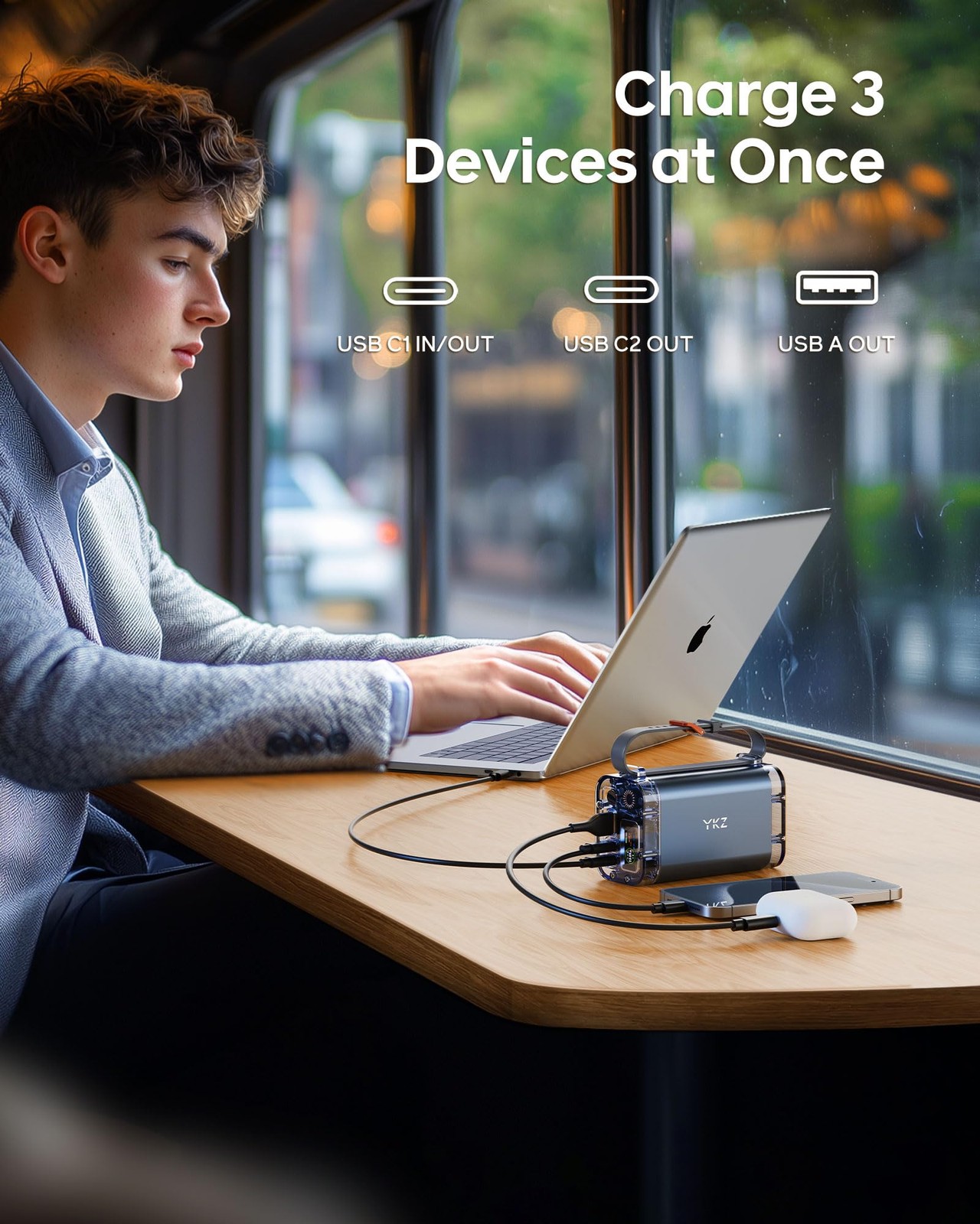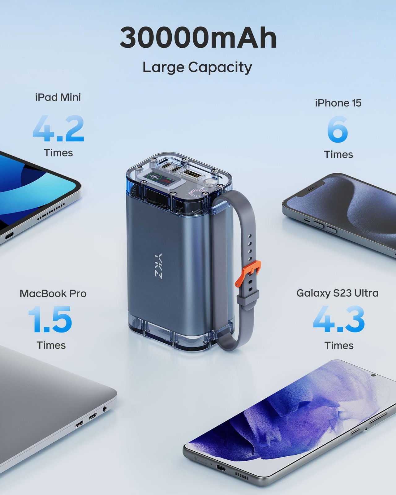 This Power Bank boasts an impressive 30,000mAh capacity and rapid 65W charging capability, delivering a robust power solution for your mobile phones, tablets, e-books, game consoles, and beyond. Whether you're on the go or enjoying outdoor adventures like travel and camping, this device serves as your ultimate companion. 🗲【65W High-Speed Charging and Recharging】- laptop power bank supports 65W PD output and input, ensuring fast charging for your laptop and phone. Quickly charge your MacBook Pro 14'' from 0% to 40% in just 30 minutes and your iPhone 15 to 60% in 30 minutes. Achieve a full recharge from 0% to 100% in only 2.5 hours with the included nylon braided 65W type-C to type-C cable. Note: For optimal fast charging, use the included 65W cable and a 65W-supported charger (not included). ✅【30000mAh Massive Capacity】- Power through your day with the 30,000mAh laptop portable charger. It provides enough power to fully charge your MacBook Pro 1.5 times, iPad Mini 4.2 times, or iPhone 13 up to 6.5 times. Perfect for extended travel, business trips, and emergency situations. Never worry about running out of battery again! ✅【Simultaneous 3-Device Charging】- 65W power bank features two PD USB-C ports (65W) and one 22.5W QC USB-A port, allowing you to charge your laptop, phone, and another device all at once. Enjoy full-speed charging for multiple devices, whether it's your MacBook Pro, iPhone, or tablet. Note: Simultaneous charging may affect charging speed. ✅【Compact & Thoughtful Design】- portable charger features a smart LED digital display that shows battery status, output, temperature, and more, keeping you in control. The versatile LED flashlight with five modes (low, normal, high, long-range, SOS) ensures you have proper lighting for camping, power outages, or natural disasters like hurricanes. With IP67 waterproof, shockproof, and dust-proof capabilities, it handles tough conditions, from splashes and drops to dusty trails. ✅【Universal Compatibility】- 65W laptop power bank supports all mainstream fast-charging protocols, including PD 3.0, QC 4.0, AFC, and FCP. It's compatible with a wide range of devices such as MacBook Pro/Air, ThinkPad, MateBook, iPad Pro/Mini, iPhone 15/14/13/12 series, AirPods, Galaxy S21/S20/Note20, Nintendo Switch, Bluetooth speakers, smartwatches, and more. Enjoy efficient charging for laptops, tablets, phones, and other Type-C devices.
