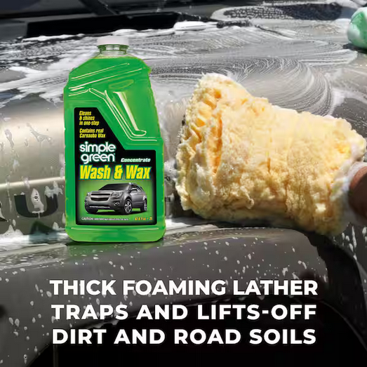 About This Product Simple Green Wash and Wax contains real carnauba wax. The specially designed formula cleans and polishes in one easy step. Gentle enough for delicate auto surfaces, yet tough enough to cut through dirt, grime, grease, and bugs while leaving behind a polished shine. Its thick foaming lather effectively lifts-off road soils and removes even the toughest dirt from cars, trucks, SUVs, RVs, vans, campers, motor homes, motorcycles, ATVs, trailers, and other automotive surfaces. The concentrated formula can be used to clean paint, clear coat, windows, metal, chrome, rubber, canvas, and vinyl. Highlights Clean-rinsing, streak-free formula won't dull or strip waxed surfaces Thick foaming lather traps and lifts-off dirt Use on paint, clear-coat, windows, metal, chrome, rubber, canvas, vinyl, and more; Wash and Wax is a non harmful cleaning product Leaves behind a refreshing scent