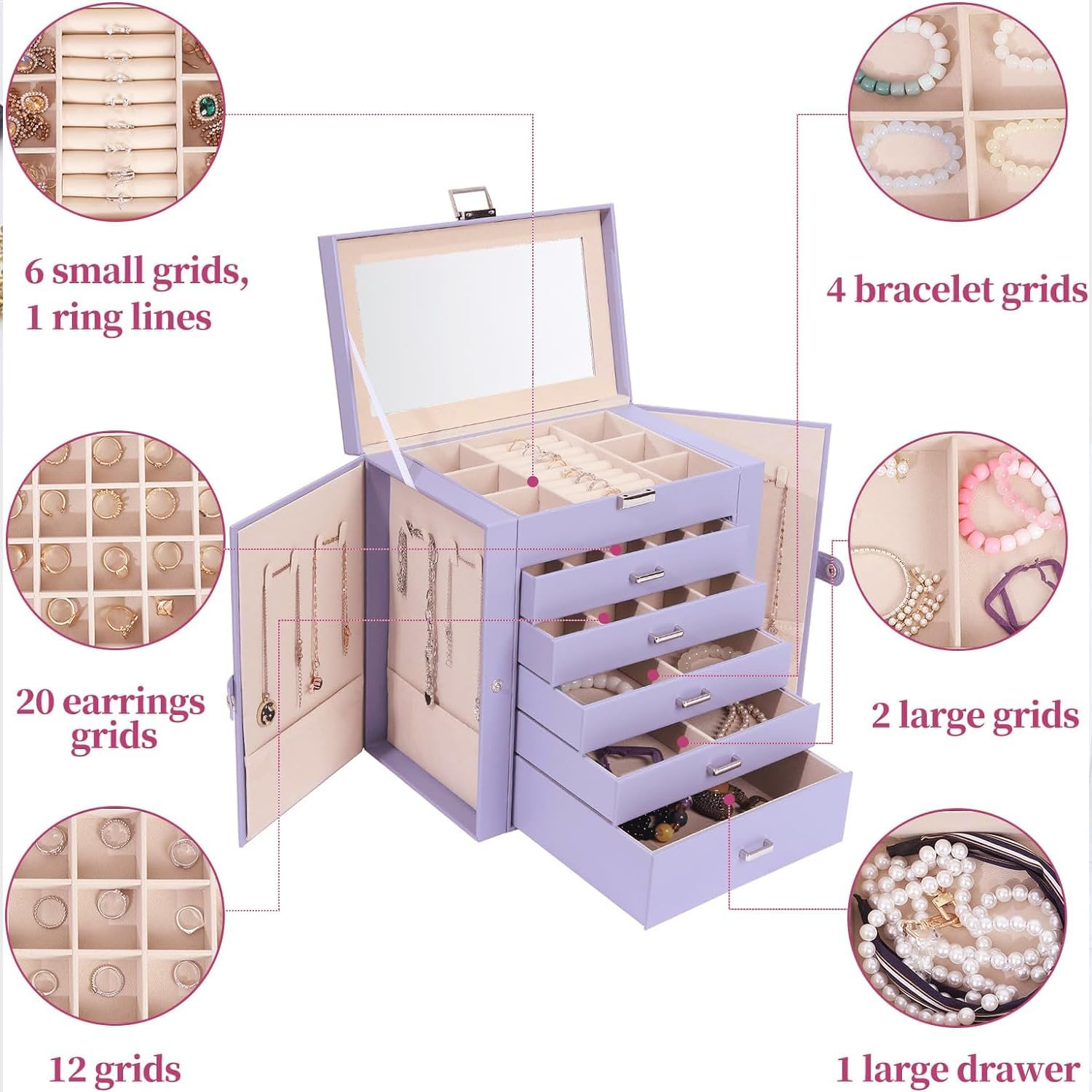 Store New Arrivals Add to Favorite View Feedback Contact Jewelry Box for Women, 6 Layer Large Jewelry Holder Organizer with 5 Drawers for Jewelry Storage, Big Jewelry Box for Womens’ Christmas Gift (Lavender) Description Item model number AG61024JB Style Modern Number of Items 1 Country of Origin China Batteries Included? No Jewelry Storage Type Jewelry Box Batteries Required? No Number of Compartments 4 Special Feature Mirror Product Dimensions 10"D x 8"W x 9"H Material Faux Leather Number of Drawers 5 Finish Type Powder Coated Included Components jewelry box Closure Type Latch Item Weight 6.07 pounds Finish Powder Coated Occasion Christmas Special Features Mirror Target Audience Women Girl Part Number AG61024JB Mounting Type Table Top Color lavender Shape Rectangular Recommended Uses For Product Necklace, Bracelet, Ring, Earring Inner Material Flannelette Multi-functional Jewelry Holder Organizer: The first layer on jewelry box with satisfy all your daily makeup needs. It with 6 earrings grids for stud earrings,brooches, Christmas charms. And it has 14 ring lines for ring holder, and 1 big mirror. Long Necklace Organizer: With excellent craftsmanship, this jewelry organizer will surprise you with its superior quality. With 16 necklace hooks on 2 jewelry organizer, you can hanging 16 necklaces in it. Makeup Organizer: The bottom drawer is really a huge drawer for your big stuffs, even for you cosmetics. With 5 drawers and 1 layer, you can take it as your makeup and jewelry box. All your daily storage needs will be take in it. Space and Time Saving for Makeup Table: With our 6 layer jewelry box, all your jewelry will be in good order and easy to reach. From then on, you have a bright dresser that saves space and makes your room look neater and more elegant. In addition, our jewelry travel boxes are designed to categorize your jewelry at a glance, shortening search time. Ideal Jewelry Gift Box : This PU leather jewelry box looks elegant and thoughtful. It is a perfect gifts for yourself, your friends, your wife or your mother for birthdays, Christmas, Valentine's Day, Mother's Day and anniversaries. This jewelry holder can be used not only as a girl's jewelry box, ring storage box, necklace storage box, earrings storage box, but also as a gift box for bracelets. Product Description ABOUT US We offer the best prices around on high quality products. Our E-store includes media such as books, movies, music and games while offering electronics, toys, sporting apparel, clothing, tools, general home, garden items and more. SHIPPING We are always working hard to ensure your package arrives as soon as possible. Please understand that some factors like weather, high postal traffic, and the performance of shipping companies are outside of our control. We offer free shipping to the lower 48 states and ship within 2 business days of payment, usually sooner. We do not accept P.O. Boxes. Please provide a physical address. For shipping outside of the continental USA, we only use eBay's Global Shipping Program.The item is shipped to KY and then sent to the rest of the world. International customers are responsible for all duties and taxes. Continue to check out in order to calculate costs for shipping the item to your country. Messages regarding eBay's Global Shipping Program MUST be directed at eBay EXCLUSIVELY. RETURNS We offer a 30-Day Return Policy on items which you are not completely satisfied with. You have the option for a full-refund or an exchange of the item. No returns are available on items shipped outside of the USA. PAYMENT We accept PayPal. CONTACT US This page content is yet to come Please ad us to your favorite seller and visit again later Thank You CUSTOMER SATISFACTION We try our very best to make sure every customer is completely satisfied. If there's a problem, message us! We're happy to help.