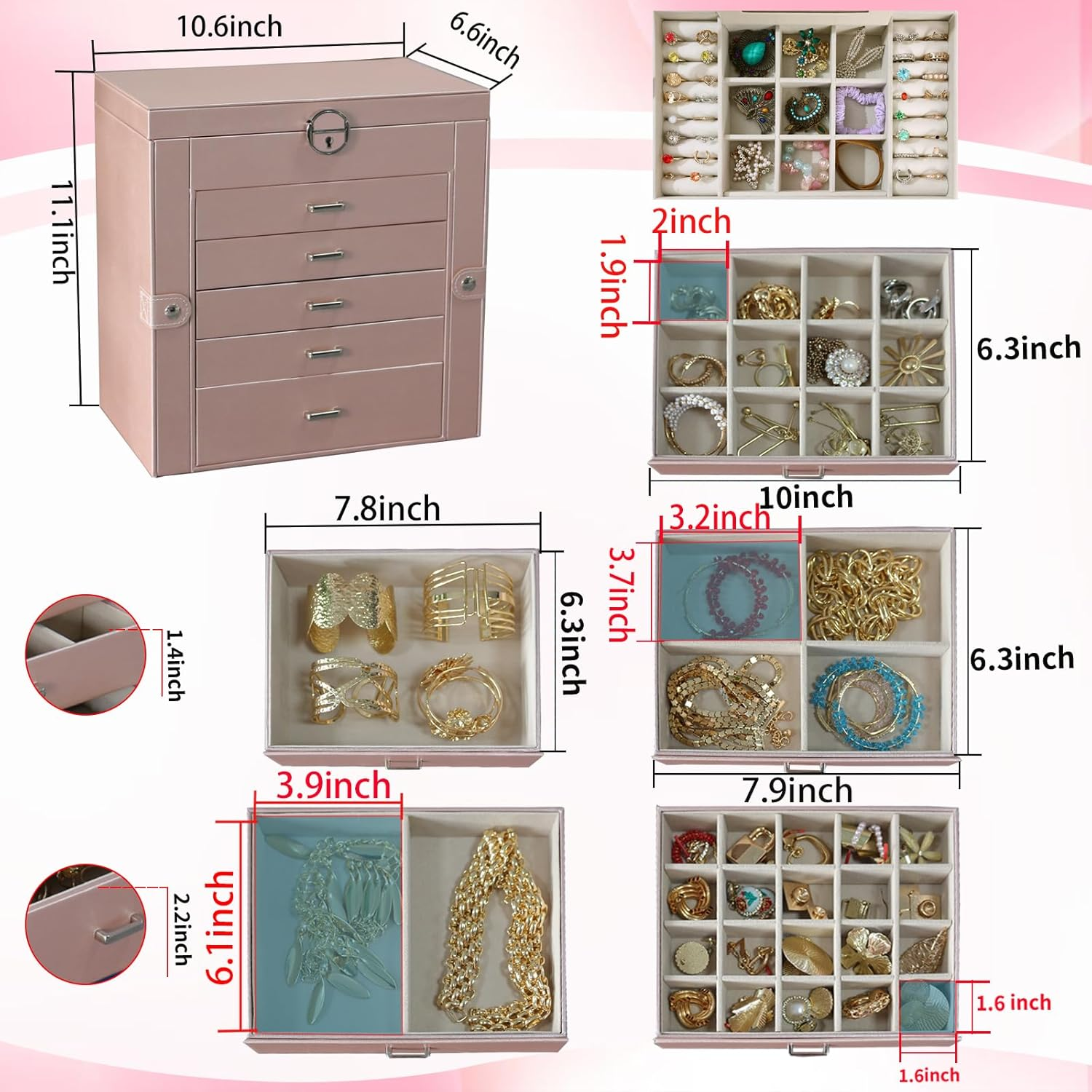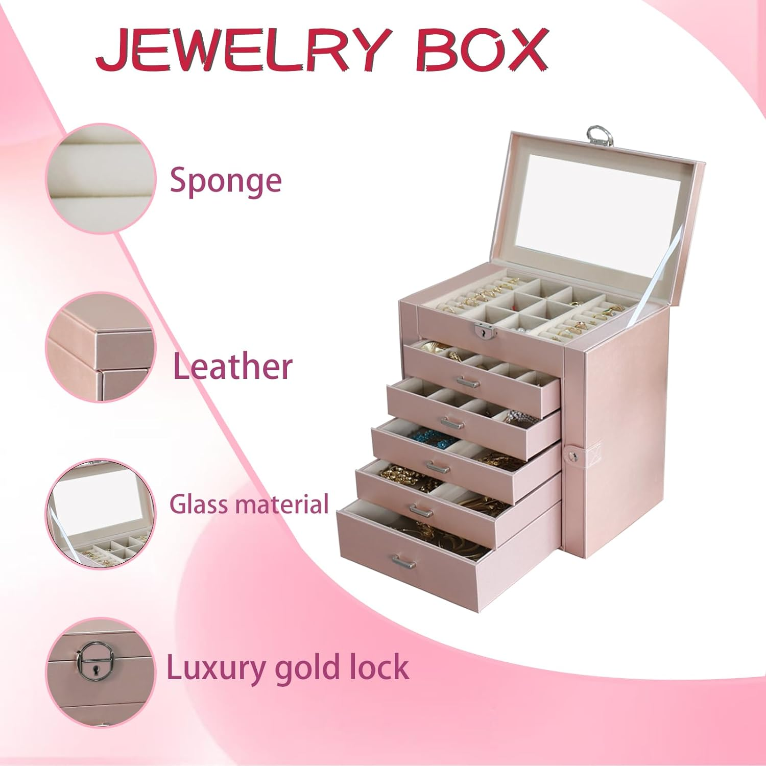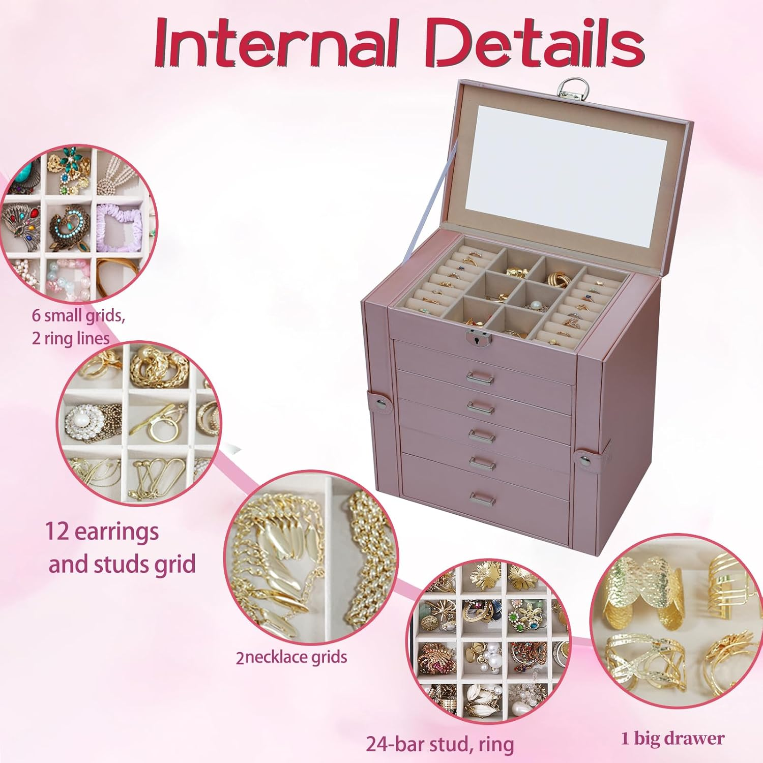 Store New Arrivals Add to Favorite View Feedback Contact Jewelry Box for Women, 6 Layer Large Jewelry Holder Organizer with 5 Drawers for Jewelry Storage, Big Jewelry Box for Womens Gift (Rose Gold) Description Item model number AG61024JB Style Modern Number of Items 1 Country of Origin China Batteries Included? No Jewelry Storage Type Jewelry Box Batteries Required? No Number of Compartments 11 Special Feature Mirror Product Dimensions 10"D x 8"W x 9"H Material Leather Number of Drawers 5 Finish Type Polished Included Components jewelry box Closure Type [PO] Item Weight 6.49 pounds Finish Polished Occasion Christmas Special Features Mirror Target Audience Women Girl Mounting Type Table Top Color Rose Gold Shape Rectangular Recommended Uses For Product Necklace, Bracelet, Ring, Earring Inner Material Flannelette Multi-functional Jewelry Holder Organizer: The first layer on jewelry box with satisfy all your daily makeup needs. It with 6 earrings grids for stud earrings,brooches, Christmas charms. And it has 14 ring lines for ring holder, and 1 big mirror. Long Necklace Organizer: With excellent craftsmanship, this jewelry organizer will surprise you with its superior quality. With 16 necklace hooks on 2 jewelry organizer, you can hanging 16 necklaces in it. Makeup Organizer: The bottom drawer is really a huge drawer for your big stuffs, even for you cosmetics. With 5 drawers and 1 layer, you can take it as your makeup and jewelry box. All your daily storage needs will be take in it. Space and Time Saving for Makeup Table: With our 6 layer jewelry box, all your jewelry will be in good order and easy to reach. From then on, you have a bright dresser that saves space and makes your room look neater and more elegant. In addition, our jewelry travel boxes are designed to categorize your jewelry at a glance, shortening search time. Ideal Jewelry Gift Box : This PU leather jewelry box looks elegant and thoughtful. It is a perfect gifts for yourself, your friends, your wife or your mother for birthdays, Christmas, Valentine's Day, Mother's Day and anniversaries. This jewelry holder can be used not only as a girl's jewelry box, ring storage box, necklace storage box, earrings storage box, but also as a gift box for bracelets. 6 Layer Jewelry box for Women,The capacity of this 6-layer women's jewelry storage box is very large,First of all, he has 6 layers, each layer can store different jewelry, clearly distinguish your jewelry, and it is very clear and convenient when wearing,There is also a mirror at the top of the first layer, so that we can put on makeup and jewelry,his 6-layer jewelry storage box is particularly powerful, there are a number of different storage areas, such as the necklace area on both sides can accommodate 16 necklaces, there are 5 layers of drawers, the size of the drawer is also distinguished, the big drawer is suitable for storing everyone's daily necessities, large jewelry or sunglasses, etc., 4 layers of smaller drawers can store earrings, bracelets, rings, necklaces and so on.The material of the 6-layer jewelry box is made of PU leather, flannelette, hardware and MDF wood, which is very strong! It is suitable for friends, mothers, grandmothers or girlfriends who have a lot of jewelry during the holidays。 ABOUT US We offer the best prices around on high quality products. Our E-store includes media such as books, movies, music and games while offering electronics, toys, sporting apparel, clothing, tools, general home, garden items and more. SHIPPING We are always working hard to ensure your package arrives as soon as possible. Please understand that some factors like weather, high postal traffic, and the performance of shipping companies are outside of our control. We offer free shipping to the lower 48 states and ship within 2 business days of payment, usually sooner. We do not accept P.O. Boxes. Please provide a physical address. For shipping outside of the continental USA, we only use eBay's Global Shipping Program.The item is shipped to KY and then sent to the rest of the world. International customers are responsible for all duties and taxes. Continue to check out in order to calculate costs for shipping the item to your country. Messages regarding eBay's Global Shipping Program MUST be directed at eBay EXCLUSIVELY. RETURNS We offer a 30-Day Return Policy on items which you are not completely satisfied with. You have the option for a full-refund or an exchange of the item. No returns are available on items shipped outside of the USA. PAYMENT We accept PayPal. CONTACT US This page content is yet to come Please ad us to your favorite seller and visit again later Thank You CUSTOMER SATISFACTION We try our very best to make sure every customer is completely satisfied. If there's a problem, message us! We're happy to help.