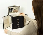 【ELEGANT COLOR MATCHING】Classics Black & White color matching , add a stylish touch to your room. At the same time , it could storage kinds of jewelrys and make your dressing table be more cleaner. This mirrored jewelry box comes with a built-in large mirror on top lid, makes it easier for you to dress up. 【MULTIFUNCTION & LARGE CAPACITY】It could make sure your fine jewelry have enough storage space , cause this jewelry case have 6 layers and 5 multifunction drawers . Jewelry organizer with Mirror on Top , and it have 2 Hidden Side Cabinets , each side have 8 stronge hooks , to make sure they will not mix and sturdy to hold heavy jewelry .You can DIY it , just need remove all the dividers , customize the partition according to your personal habits and preferences .It could used for a small to medium jewelry collection , if you're a jewel lover. 【PREMIUM MATERIALS】 Sturdy Jewelry organizer made from wood , covering elegant PU leather , it makes your box more durable and easy to clean , you can wipe it off effortlessly with a damp cloth . Interior used softy velvet , to protect your fine jewelry very well.It keeps you in a good mood . 【Space Saving And Tidy】The jewelry storage box measures 10.5L*6.5W*11H inch (26.5cm*16.5cm*29cm). It is equipped with a delicate metal buckle for easy opening and closing, It can store all your Jewelry, beautifully placed on your dresser, bedside table, bathroom counter or dresser, saves a lot of space and makes your dresser and room look neater. 【Ideal Gift for Women】The new jewelry organizer is elegant, classic and beautiful in appearance, with great use value. Whether you are treating yourself or giving a gift to your girlfriend, wife, mother or other loves, this jewelry storage box makes for a wonderful gift to someone special in your life. It will be packaged in an elegant bag, suitable for gift giving and jewelry collection. If you have any questions, please contact us via email,we are happy to assist you.