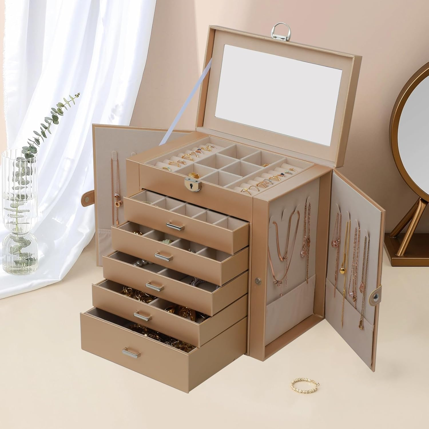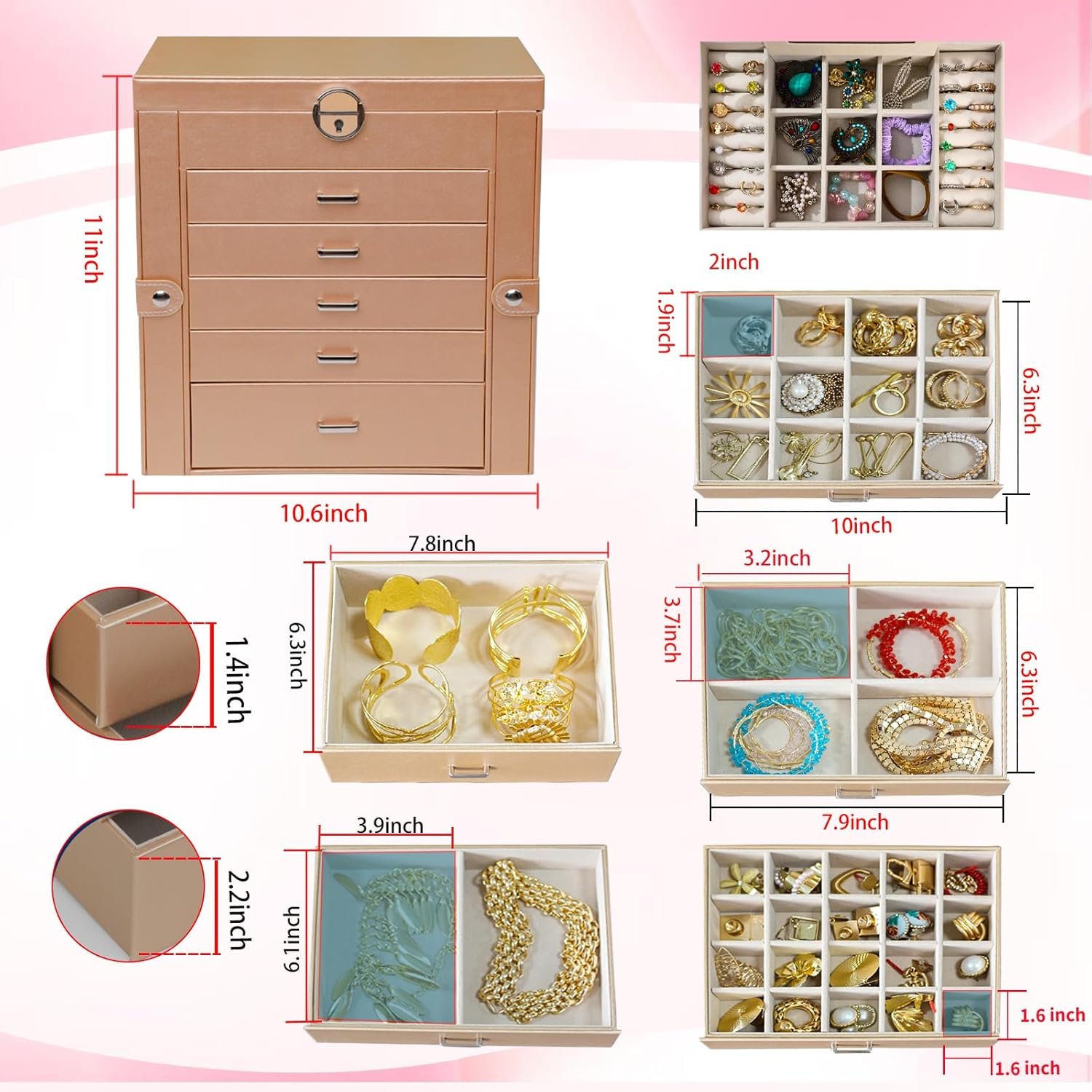 Jewelry Box for Women, 6 Layer Lockable Large Jewelry Holder Organizer with 5 Drawers for Jewelry Storage, Big Jewelry Box for Womens’ Christmas Gift (Champagne) Multi-functional Jewelry Holder Organizer: The first layer on jewelry box with satisfy all your daily makeup needs. It with 6 earrings grids for stud earrings,brooches, Christmas charms. And it has 14 ring lines for ring holder, and 1 big mirror. Long Necklace Organizer: With excellent craftsmanship, this jewelry organizer will surprise you with its superior quality. With 16 necklace hooks on 2 jewelry organizer, you can hanging 16 necklaces in it. Makeup Organizer: The bottom drawer is really a huge drawer for your big stuffs, even for you cosmetics. With 5 drawers and 1 layer, you can take it as your makeup and jewelry box. All your daily storage needs will be take in it. Space and Time Saving for Makeup Table: With our 6 layer jewelry box, all your jewelry will be in good order and easy to reach. From then on, you have a bright dresser that saves space and makes your room look neater and more elegant. In addition, our jewelry travel boxes are designed to categorize your jewelry at a glance, shortening search time. Ideal Jewelry Gift Box : This PU leather jewelry box looks elegant and thoughtful. It is a perfect gifts for yourself, your friends, your wife or your mother for birthdays, Christmas, Valentine's Day, Mother's Day and anniversaries. This jewelry holder can be used not only as a girl's jewelry box, ring storage box, necklace storage box, earrings storage box, but also as a gift box for bracelets. 6 Layer Jewelry box for Women,The capacity of this 6-layer women's jewelry storage box is very large,First of all, he has 6 layers, each layer can store different jewelry, clearly distinguish your jewelry, and it is very clear and convenient when wearing,There is also a mirror at the top of the first layer, so that we can put on makeup and jewelry,his 6-layer jewelry storage box is particularly powerful, there are a number of different storage areas, such as the necklace area on both sides can accommodate 16 necklaces, there are 5 layers of drawers, the size of the drawer is also distinguished, the big drawer is suitable for storing everyone's daily necessities, large jewelry or sunglasses, etc., 4 layers of smaller drawers can store earrings, bracelets, rings, necklaces and so on.The material of the 6-layer jewelry box is made of PU leather, flannelette, hardware and MDF wood, which is very strong! It is suitable for friends, mothers, grandmothers or girlfriends who have a lot of jewelry during the holidays。 Item model number AG61024JB Style Modern Country of Origin China Batteries Included? No Jewelry Storage Type Jewelry Box Batteries Required? No Number of Compartments 6 Special Feature Mirror Product Dimensions 10"D x 8"W x 9"H Material Leather Number of Drawers 5 Finish Type Finished Included Components key Item Weight 6.47 pounds Finish Finished Occasion Christmas Special Features Mirror Target Audience Women Girl Part Number AG61024JB Mounting Type Table Top Color Champagne Shape Rectangular Recommended Uses For Product Necklace, Bracelet, Ring, Earring Inner Material Flannelette Shipping Fast shipping is very important for us. Our standard US shipping service is FREE. Your order will be shipped within 2-3 business days upon full payment received. Your order will be delivered within 2-3 business days after the handling time. We only ship to the confirmed PayPal address. We reserve the right to cancel any order for any reason at any time. We are not responsible for undeliverable addresses. Returns and payment We offer a 30 days return policy from checkout winning date. We allow only PayPal as payment method FeedBack Your feedback very important to us, after you get your package and you are satisfied with our service please leave us positive feedback If you have any problem with your order / any questions please before leave any type of feedback For any questions, using eBay contact system Please visit our eBay store to check out other items for sale! Thank you for shopping at our store.