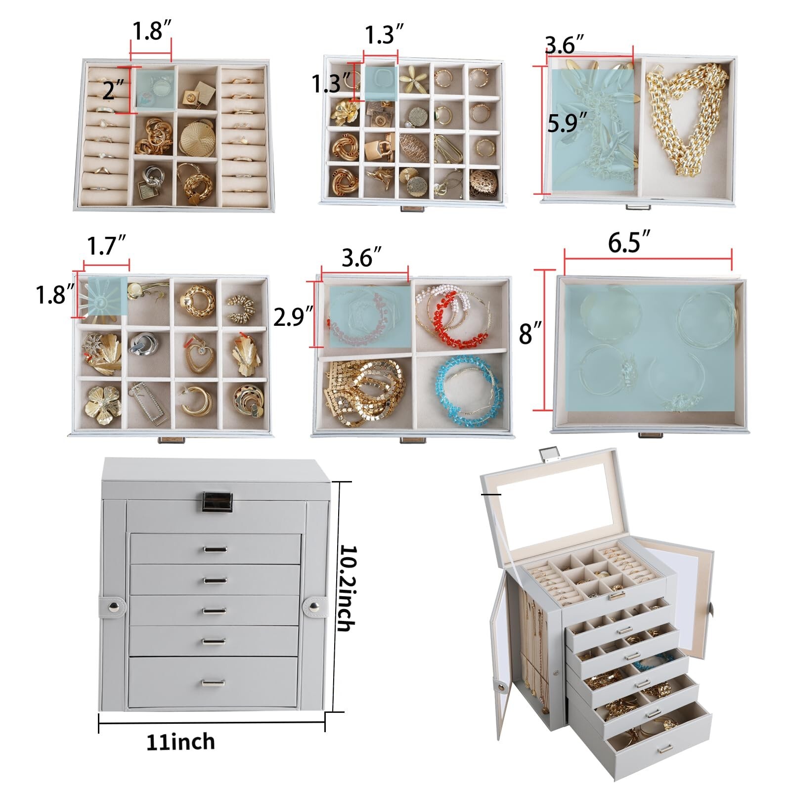 6 Layer Large Jewelry Boxes With Mirror,Multifunctional 5 Drawers Jewelry Box Organizer with 2 Glass Door for Necklace Organizing (Grey) Product Details Color: Grey Brand: CIIGIO MPN: CG-502-731 UPC: Does not apply EAN: Does not apply Color: Grey Brand: CIIGIO Material: Leather Style: Modern Special Feature: Dustproof, Mirror, Lock Recommended Uses For Product: Necklace, Bracelet, Ring, Watch, Earring, Bangle Product Dimensions: 6.6"D x 10.6"W x 11"H Target Audience: Women, Girls Shape: Square Occasion: Christmas, Anniversary, Birthday Color: Grey Brand: CIIGIO Material: Leather Style: Modern Special Feature: Dustproof, Mirror, Lock Recommended Uses For Product: Necklace, Bracelet, Ring, Watch, Earring, Bangle Product Dimensions: 6.6"D x 10.6"W x 11"H Target Audience: Women, Girls Shape: Square Occasion: Christmas, Anniversary, Birthday Mounting Type: Table Top Finish Type: Distressed Inner Material: Velvet Closure Type: Latch Number of Drawers: 5 Item Weight: 2700 Grams Number of Compartments: 2 Jewelry Storage Type: Jewelry Box Number of Items: 1 Manufacturer: CIIGIO Part Number: CG-502-731 Item Weight: 5.95 pounds Country of Origin: China Item model number: CG-502-731 Finish: Distressed Special Features: Dustproof, Mirror, Lock Included Components: No Batteries Included?: No Batteries Required?: No Date First Available: July 31, 2024 6-Layer Large Jewelry Box Features : The large jewelry storage box has 5 drawers, 2 necklace side glass door boxes (with 8 necklace hooks and 2 elastic bags to protect necklace), the top of the first layer has a makeup mirror, 2 rows of ring slots (can store 30 rings) and 6 earrings grids. Quality material : This jewelry box is made of durable PU leather, which is stain resistant, deformation free and easy to clean. The lining is wrapped in durable soft velvet to provide all-round protection for your jewelry and comes with a square buckle for easy opening and closing. Suitable for storing a large number of jewelry necklace box, bracelet box, earring box, necklace storage rack, watch box, cuff box, headdress box, glasses box, good appearance, material, function. Save Space Jewelry case: Our jewelry box keeps your jewelry neatly arranged and within reach. From then on, you have a bright dresser that saves space and makes your room look neater and more elegant (elegant jewelry organizer). In addition, our Jewelry Travel box categorizes your jewelry at a glance (necklaces, bracelets, rings, bracelets, cuffs, headdresses large jewelry organizer) to shorten the search time. Upgrade This large jewelry storage box has been enlarged to 6.6 x 11 x 10.6 inches. This dresser organizer is upgraded in function zones, making the most of every place to store your rings, necklaces, bracelets, earrings, hairpins, watches and other baubles. This girl's jewelry box is reasonably structured and sturdy to keep all your jewelry in order. Ideal Decorative Jewelry Gift Box : This PU leather jewelry storage bag looks elegant and thoughtful. This large jewelry box are perfect gifts for yourself, your friends, your wife or your mother for birthdays, Christmas, Valentine's Day, Mother's Day and anniversaries. This jewelry holder organizer can be used not only as a girl's jewelry box, ring storage box, necklace storage box, earrings storage box, but also as a gift box for bracelets 【Characteristics of large capacity of 6 layers】 : Large jewelry storage box has makeup mirror, two rows of ring slots (about 30 rings) 8 necklace hooks, 5 drawers (earrings, pendants, bracelets, watches, sunglasses, etc.). When you open the drawer, you'll find many large and small removable slots for the jewelry you want to store. With a variety of designs and compartments, this jewelry organizer can store all of your jewelry, from large pieces to small earrings, with one place to store them.