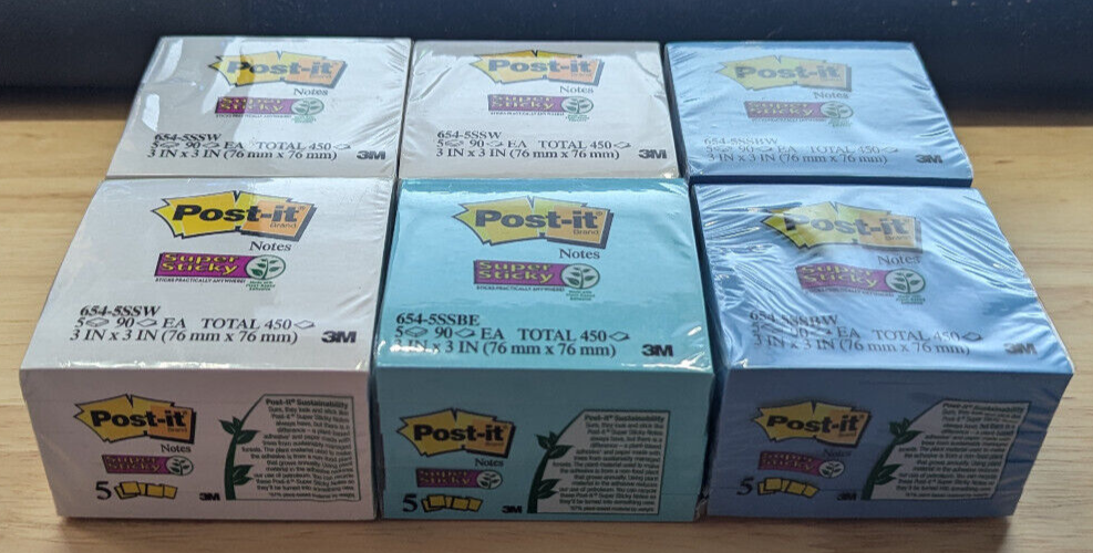 For sale is a lot of Six packs of Post-it 3" x 3" Super Sticky Notes. There are 5 pads in each pack, and each pad has 90 sheets, for a total of 30 pads and 2700 sheets. Included are three packs of White, two packs of Sapphire Blue, and one pack of Electric Blue. They are all brand new and factory sealed. Thanks for looking and be sure to check out my other items for sale! I often list new things as I clean up/go through my stuff. Don't be afraid to use the "Best Offer" option; I respond promptly and I'm happy to negotiate a deal we're both satisfied with. Also, note that listings of mine that you show interest in will often get personal offers sent that are well below the listing price. For listings I make with more than a single item, I often offer the second item at a very generous discount, to make sure to check out volume pricing! Stay safe and healthy out there!
