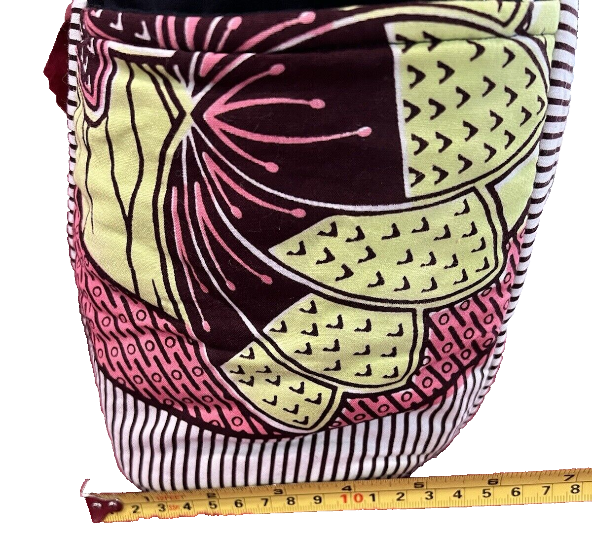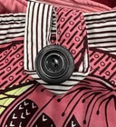 This tote bag is the perfect accessory for any woman who wants a stylish and practical way to carry her belongings. With six pockets, it offers ample space for all your essentials, while the button closure ensures that your items stay secure. The bag measures 14 inches across, seven inches wide, and ten inches tall, making it a spacious option for everyday use. Made of soft, washable cotton, this tote bag features a multicolor exterior and pink handle/strap material. The bag is adorned with black hardware and has a vintage style that adds a touch of nostalgia to any outfit. Whether you're running errands or heading to work, this tote bag is a versatile accessory that will complement any outfit.