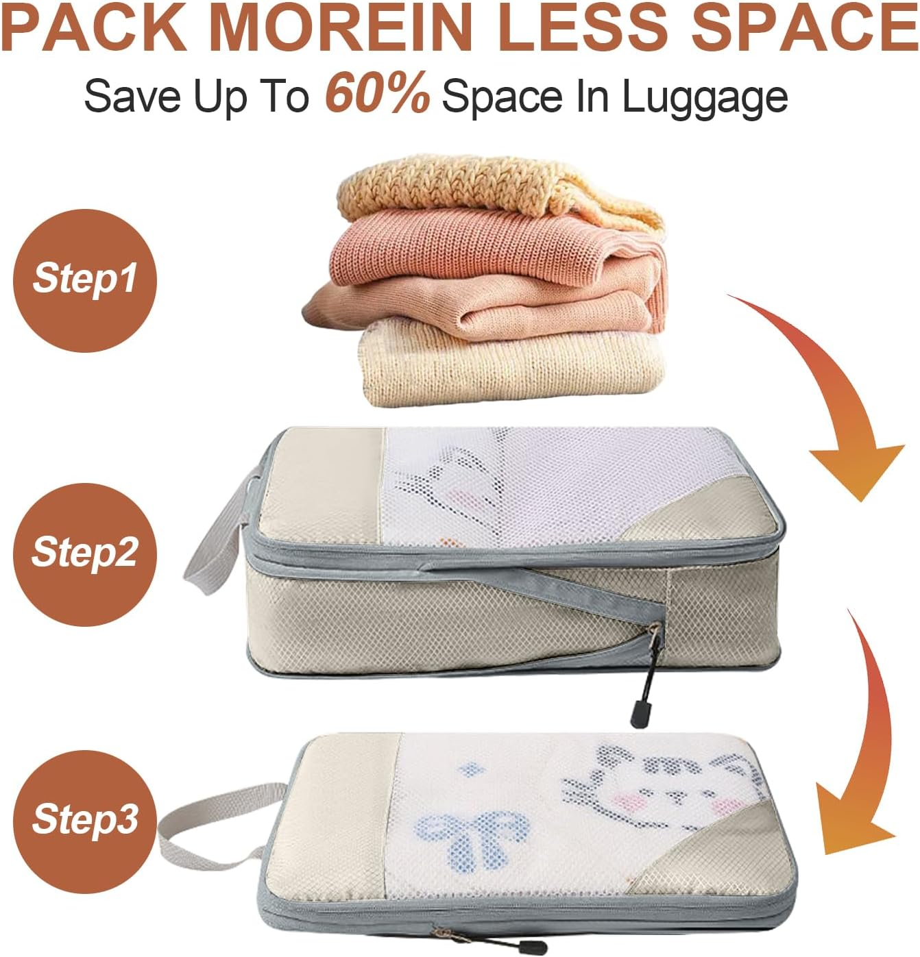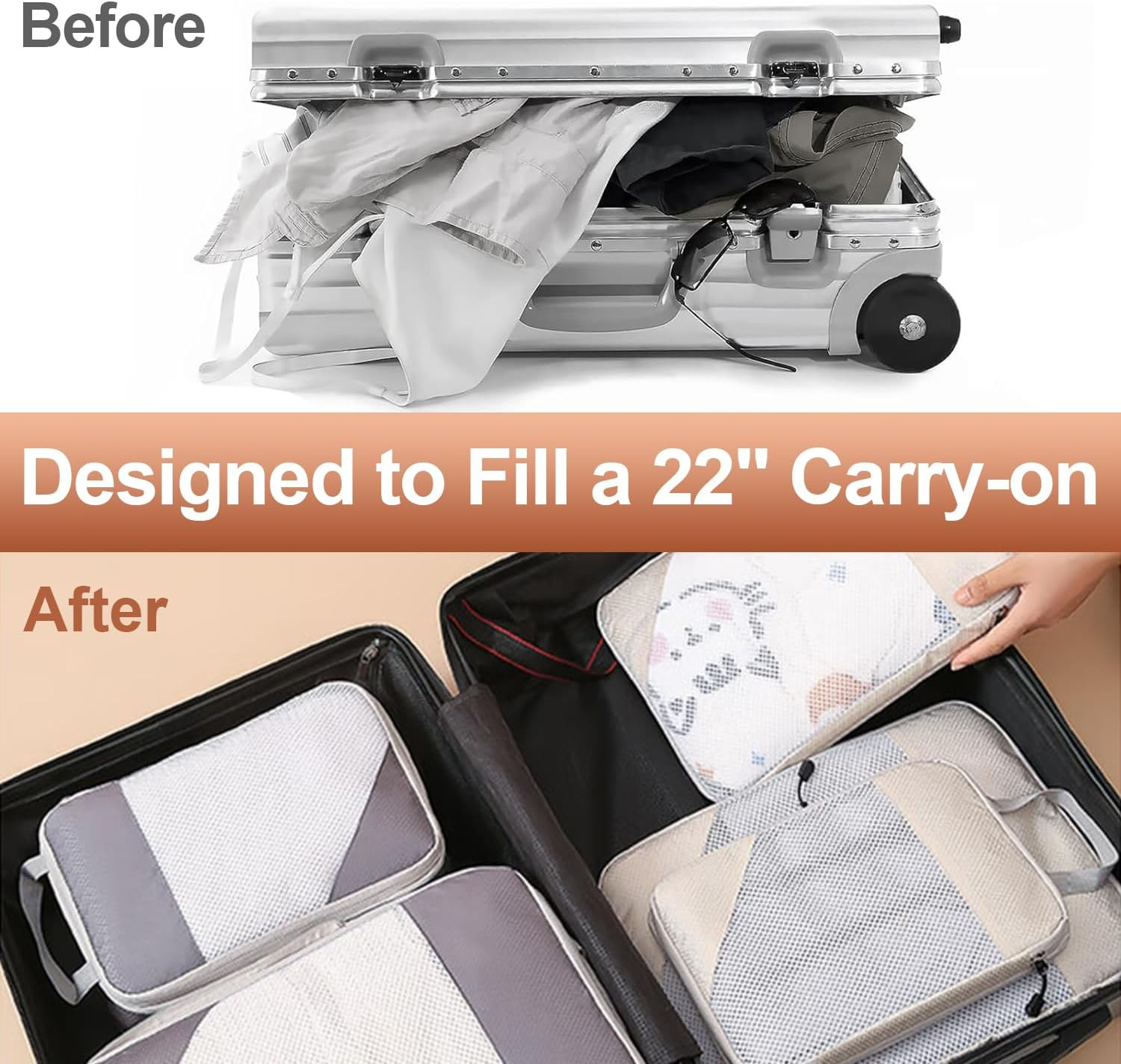 MAXIMIZE PACKING EFFICIENCY: With our two-zipper system, H HOME-MART compression packing cubes let you pack more in less space. You can save up to 60% of your luggage volume and lose the hassle of carrying bulky bags. DURABLE & WATER-RESISTANT: Made from high-quality 600D ripstop nylon fabric, our travel cubes are both lightweight and sturdy. The reinforced mesh tops stand the test of time, ensuring long-lasting usefulness and protection from spills. VERSATILE TRAVEL COMPANIONS: Ideal for vacations, camping, and hiking, our cubes come in a 6-set. The cubes fit into 20-inch carry-ons and various bags like backpacks, duffels, and totes, making it easy to stay organized. COMPLETE SET: Our 6-piece set of compression packing cubes includes 2 small cubes (12''x8''x4''), 2 medium cubes (14''x10''x4''), and 2 large cubes (16''x12''x4''). Get the most out of your packing and avoid extra airline baggage fees. EFFICIENT USE OF SPACE:By using our travel packing cubes set,can saves 60% storage space after compressing. You can maximize the space in your luggage suitcase or bag, fitting perfectly and making packing and unpacking a breeze. It is also a great way to stay organized during your trip, making it easier to find and access your belongings. Product Description H HOME-MART Packing Cubes- Set of 6 Cubes Made of water-repellent polyester, paired with fresh pattern, our 6 Pcs Compression Packing Cubes Set is stylish and multi-functional organizing and condensing your clothes and saving 60% space for your luggage. Makes your packing a breeze, no more messy luggage and over-packing. SPACE SAVING BY COMPRESSION UPGRADED PREMIUM QUALITY & FUNCTIONAL DESIGNS STURDY NYLON FABRIC MULTI-USAGE