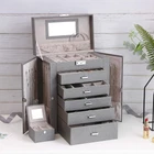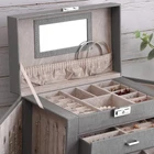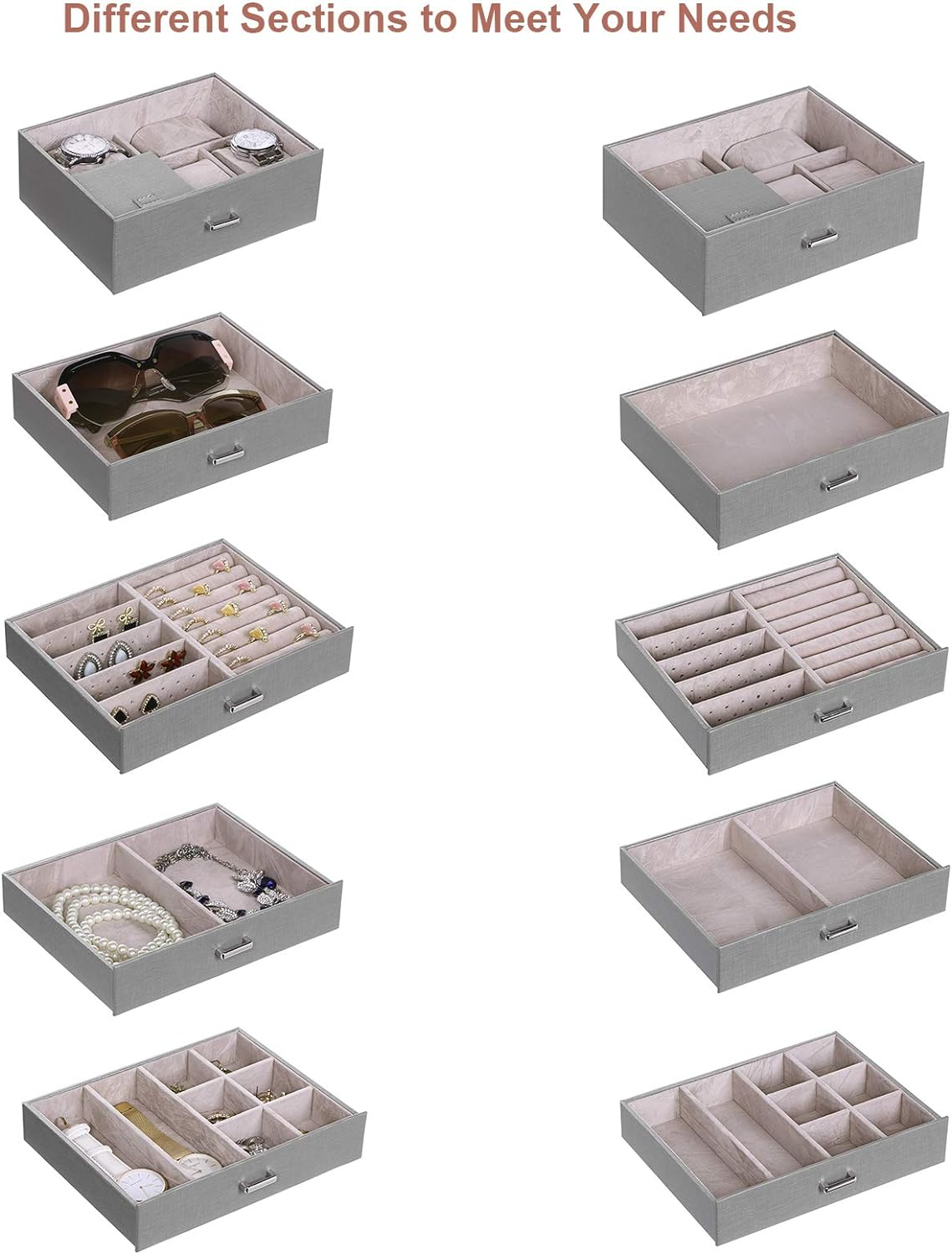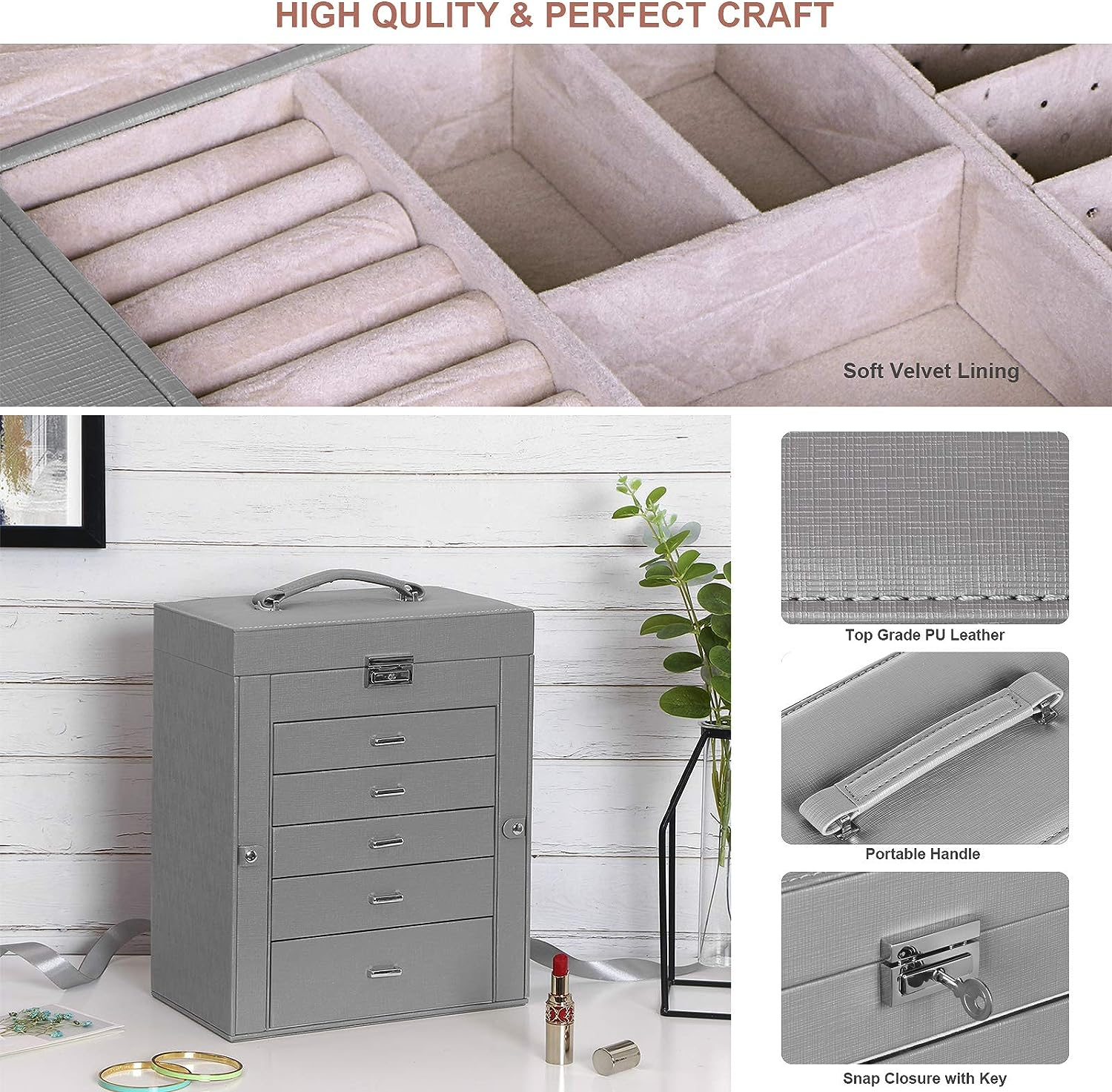 Menu Other Items Feedbacks About Us Contact Us Add To Favorites Jewelry Box Organizer 6 Tier Jewelry Box for Women Large Jewellery Display Storage Case with Lock Mirror Jewelry Case for Earrings Rings Necklaces Bracelets UJJB004H 【LARGE CAPACITY & EXCELLENT CRAFT】With 6-tier and 2-wings, this large attractive jewelry box for women can keep all your jewelry accessories well-organized. High quality textured faux leather cover, environmental MDF, soft velvet lining to prevent your jewelry from scratching and being marred.This elegance jewelry organizer box is beautiful, sturdy and durable. 【BULIT-IN MIRROR & MULTI-FUNCTIONAL COMPARTMENTS】Built-in glass mirror provide perfect view when you try your jewelry on. Top lid section has a lower elastic pocket to keep necklace, bracelets perfectly in place. The 1st Tier and 5 pull out drawers contains slots with different size for your necklaces, bracelets, watches hair clips, earrings, rings, chains, cufflinks etc orderly. What's more, 1 deeper drawer of this jewelry box is specially designed for sunglasses or large jewelries. 【2 HIDDEN WINGS COMPARTMENTS& 4 WATCH PILLOWS】With 2 hidden wings with 22 Hooks and 4 pockets, this huge jewelry box for women can meets all your needs of necklace stroage and keep your necklaces from getting tangled. There are 4 soft pillows in the bottom drawer for storing your watches. The pillows are also removable for other jewelry 【SPACE SAVING & PORTABLE TRAVEL CASE】Dimension: 27 x 16 x 33cm (L x W x H) when closed. This jewelry case keeps your daily jewelry organized and it is space saving on your dressing table. There is a removable mini travel jewelry organizer in the bottom drawer, which keeps your daily jewelry organized and it is portable to be placed in your handbag or luggage. 【SNAP CLOSURE WITH KEY & CONSIDERATE DETAILS】 You can use the key to lock the jewely box when necessary, which protects your privacy. Anti-rust metal latch is easy to manipulate. It opens up like a butterfly spreading her wings. The handle makes the jewelry case looks decent and easy to tote. Product Description A Proper Jewelry Box for Jewelry Lover and collector Are you Looking for the most beautiful jewelry box to give your beloved jewelly collections a classy and well organized home? Are you still struggling with a string of necklaces knotted with earrings and rings in a beautiful day you are looking forward? There you go, this ANWBROAD 6 Tier Huge Jewelry Box Jewelry Organizer will keep you out. With elegant looking and multi-functional design, this jewelry box is specially designed for you. It will keep your jewelry organized and protecet them perfectly. This jewelry box is an idea gift for a mother, wife, daughter or friends on Christmas, Thanksgiving Day, Valentine's Day, Mother's day, birthday or any other anniversary day or even just as a little treat for yourself. Material: High quality faux leather cover + environmental MDF + soft velvet lining Color: Grey Overall size: 10.63" x 6.3" * 12.99"( 27 x 16 x 33cm) Travel Jewelry Box Within a removable mini travel jewelry organizer and it is portable to be placed in your handbag or luggage when you're on business or traveling. Jewelry Box with Mirror and Lock Large embedded mirror makes it easy to choose jewelry to match your makeup.The lockable top can hold your precious jewelry. Detachable watch pillows Detachable watch pillow protect your watch strap from bending. If you don't need watch pillows, you can take them out to make room for other jewelry. Cube structure, occupy small desktop area Small footprint, 6 layers of storage space.You can put it next to the dressing table or the washstand. A Total of 6 Layers Top layer The 1st tier includes 10 ring rolls, 4 ear stud cards and 3 slots for rings, earrings, bracelets, brooches, cuff links, etc. Layer 2 Drawer 1 includes 8 ring rolls and 4 ear stud cards for rings, earrings. Layer 3 Drawer 2 includes 2 rectangle slots and 6 square slots, suitable to store necklaces, watches, big rings, brooches, cuff links, etc. Layer 4 Drawer 3 includes 2 big slots, suitable to store necklaces, bracelets, chains, etc. Layer 5 Drawer 4 only have 1 compartment which is deeper enough to store sunglasses or other big jewelries. Layer 6 Drawer 5 includes 4 watch pillows and a mini travel box. You can also remove the mini box or pillows for other jewelry box. Add to Cart Add to Cart Add to Cart Add to Cart Add to Cart Customer Reviews 4.5 out of 5 stars 605 4.7 out of 5 stars 1,644 4.5 out of 5 stars 53 4.5 out of 5 stars 591 4.5 out of 5 stars 357 4.6 out of 5 stars 420 Price $63.74 $ 63 . 74 $40.49 $ 40 . 49 — $39.99 $ 39 . 99 $39.99 $ 39 . 99 $37.99 $ 37 . 99 COLOR Cyan, Grey, White, Black, Pink Cyan, Grey, White, Black Grey,Black,White Cyan, Grey, White, Black, Pink Cyan, Grey, White, Black, Pink Cyan, Grey, White, Black, Pink SIZE 13.15” X 6.57” X 11.46” 10.67" L x 11.30" H x 6.22 W 11.06” X 6.5” X 13” 13.11’’L X 6.34’’W X 8.82’’H 10.2’’L X 6.54’’W X 8.78’’H 10.08”L X 6.53”W X 11.26”H FEATURE Spacious, Partition, Lock, Mirror Mirror,Top layer lockable Dangler, Necklace hook, Multifunctional, Necklace Hook, Extra Large Capacity Partition, Large capacity, Space saving Necklace hook, Multifunctional Item Specification Item model number JJB004 Style 古典 Number of Items 1 Closure Type Key Lock Batteries Included? No Jewelry Storage Type Jewelry Box Batteries Required? No Number of Compartments 21 Special Feature huge jewelry box Product Dimensions 6.3"D x 10.63"W x 12.99"H Material Wood Number of Drawers 5 Finish Type Polished Item Package Quantity 1 Item Weight 7.79 pounds Finish Polished Occasion Mother's Day, Christmas, Wedding, New Year Special Features huge jewelry box Target Audience 女士 Part Number JJB004 Mounting Type Table Top Color Gray Inner Material Metal Shape Rectangular Recommended Uses For Product Necklace, Bracelet, Ring, Watch, Earring Number Of Pieces 1 Dimensions S